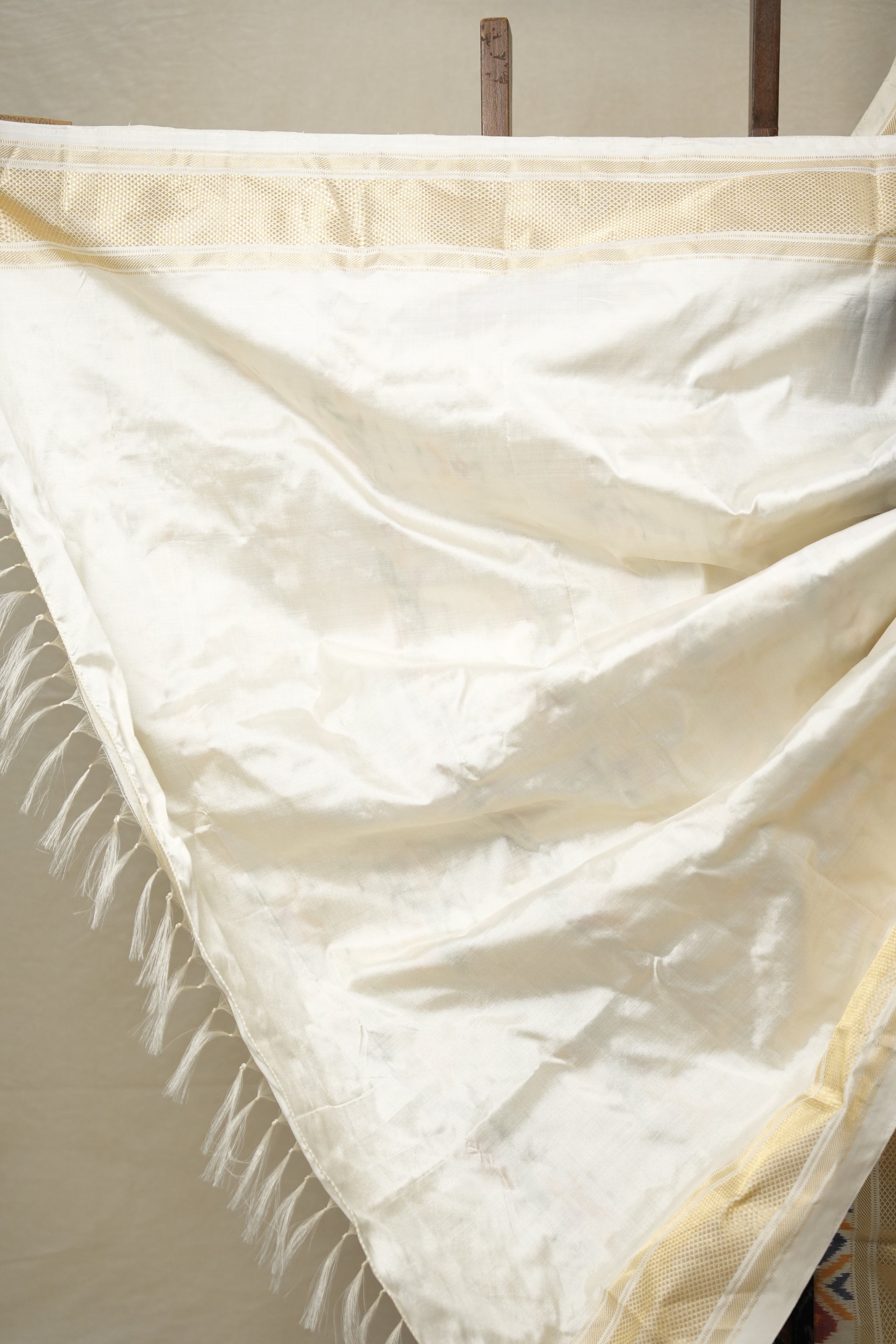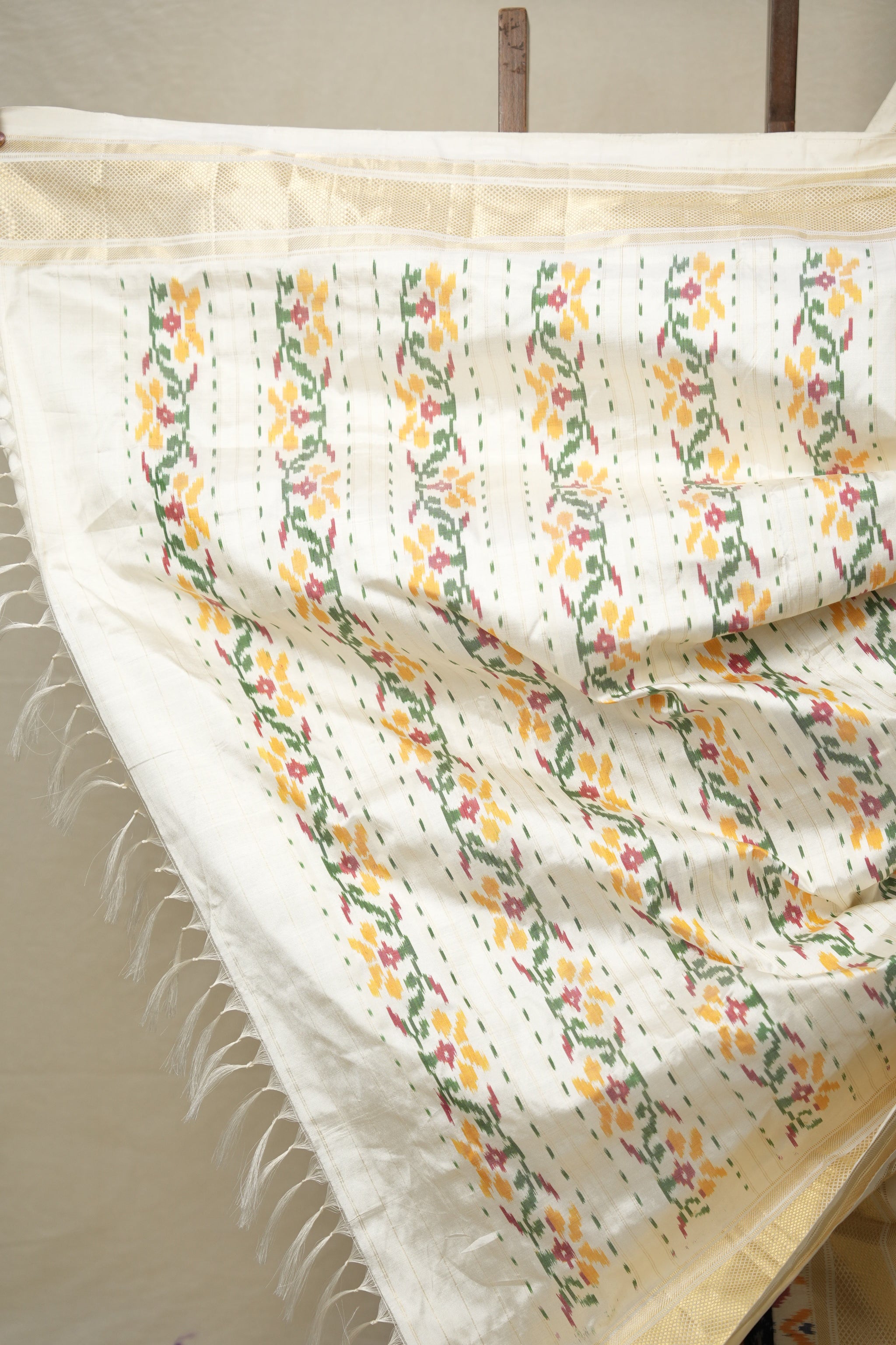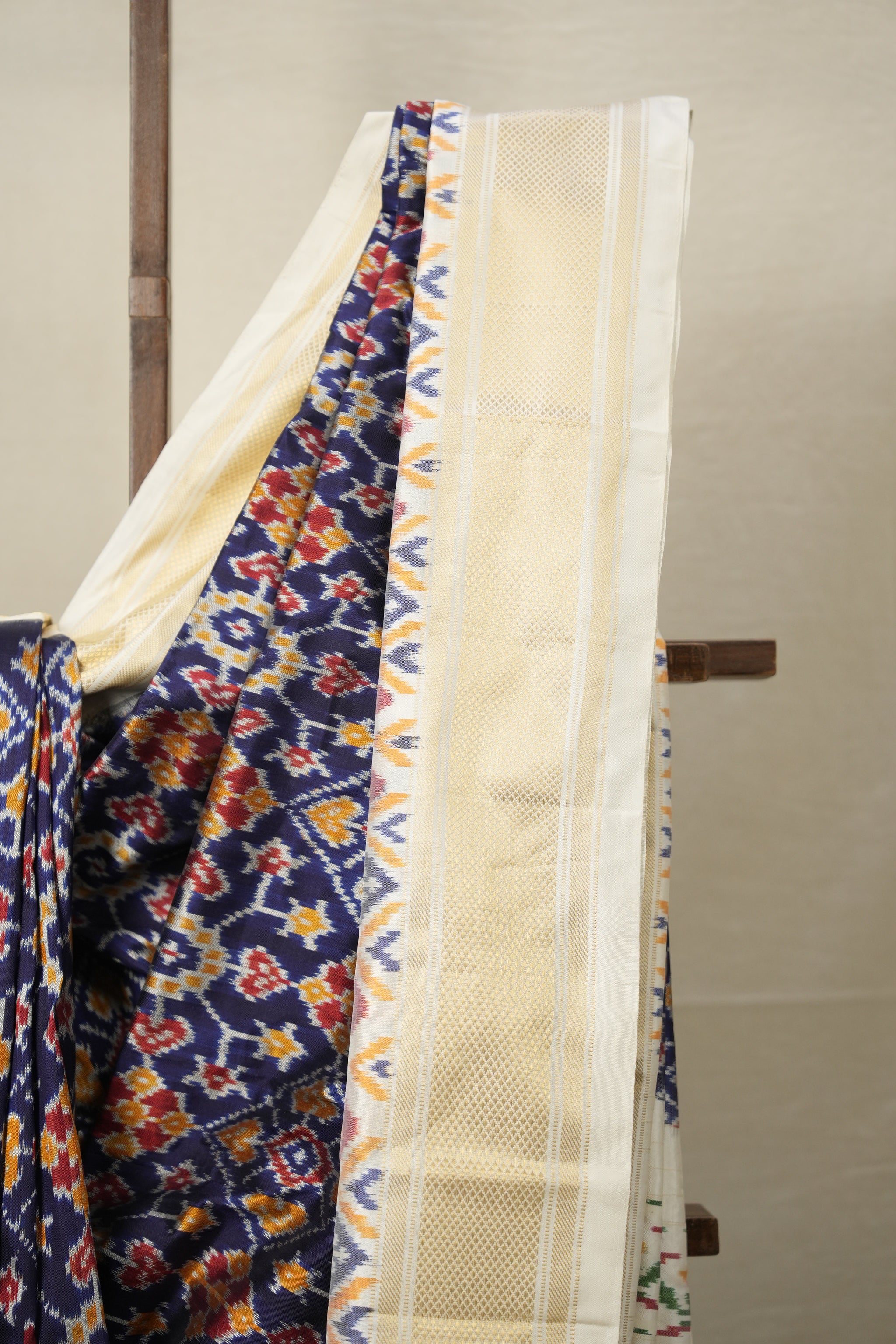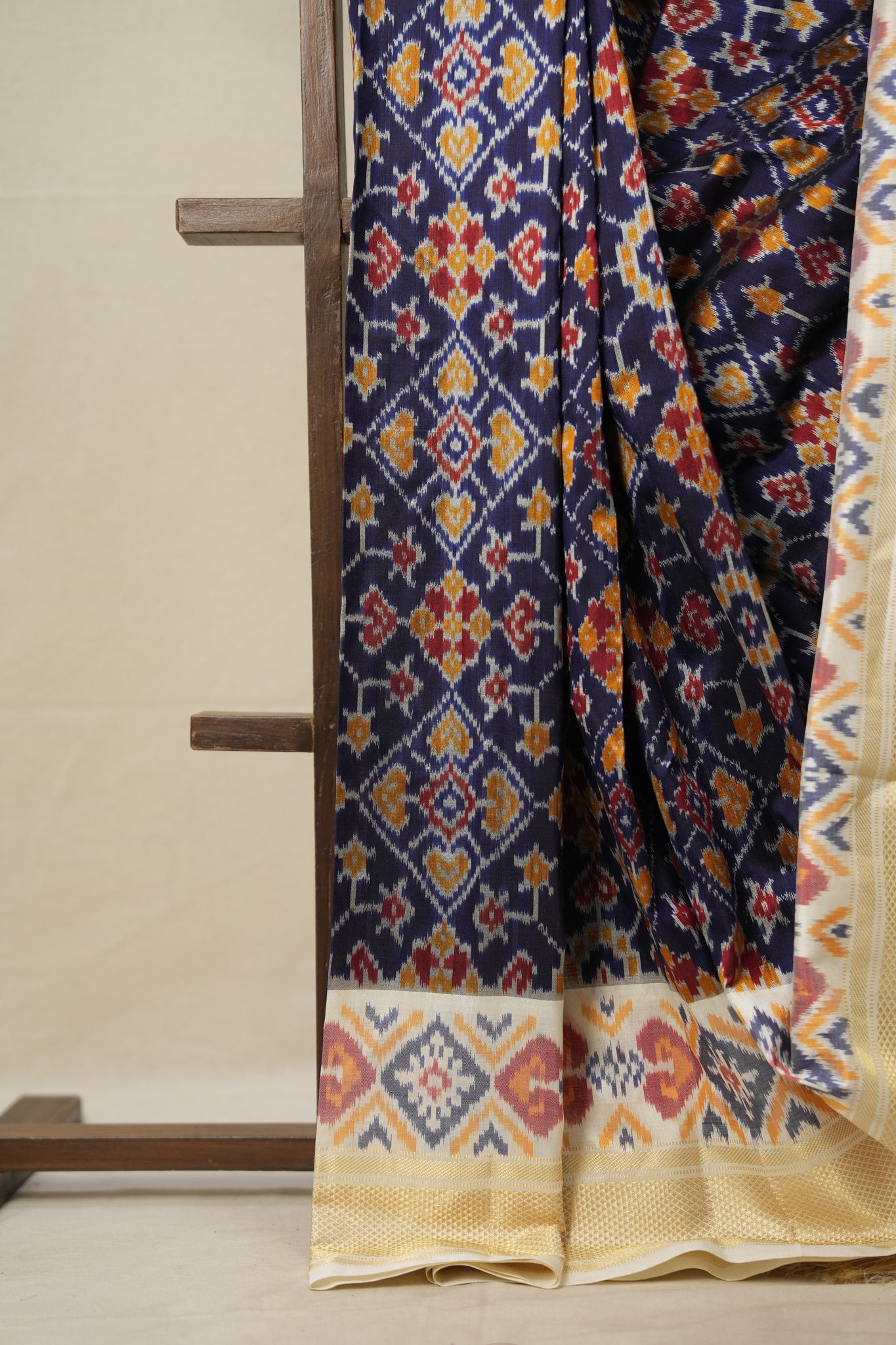 Work - This Pochampalli Ikat saree features plain saree with gold zari kanchi border and ikat pallu.