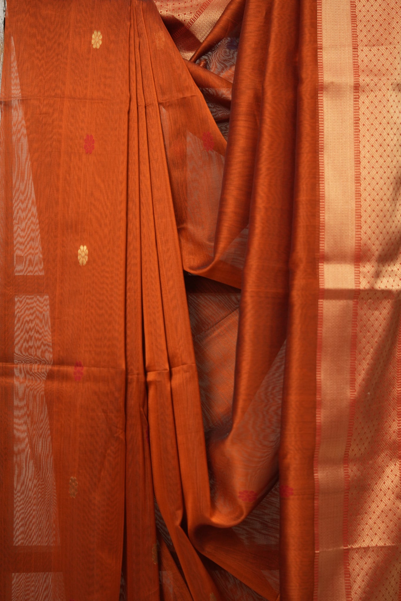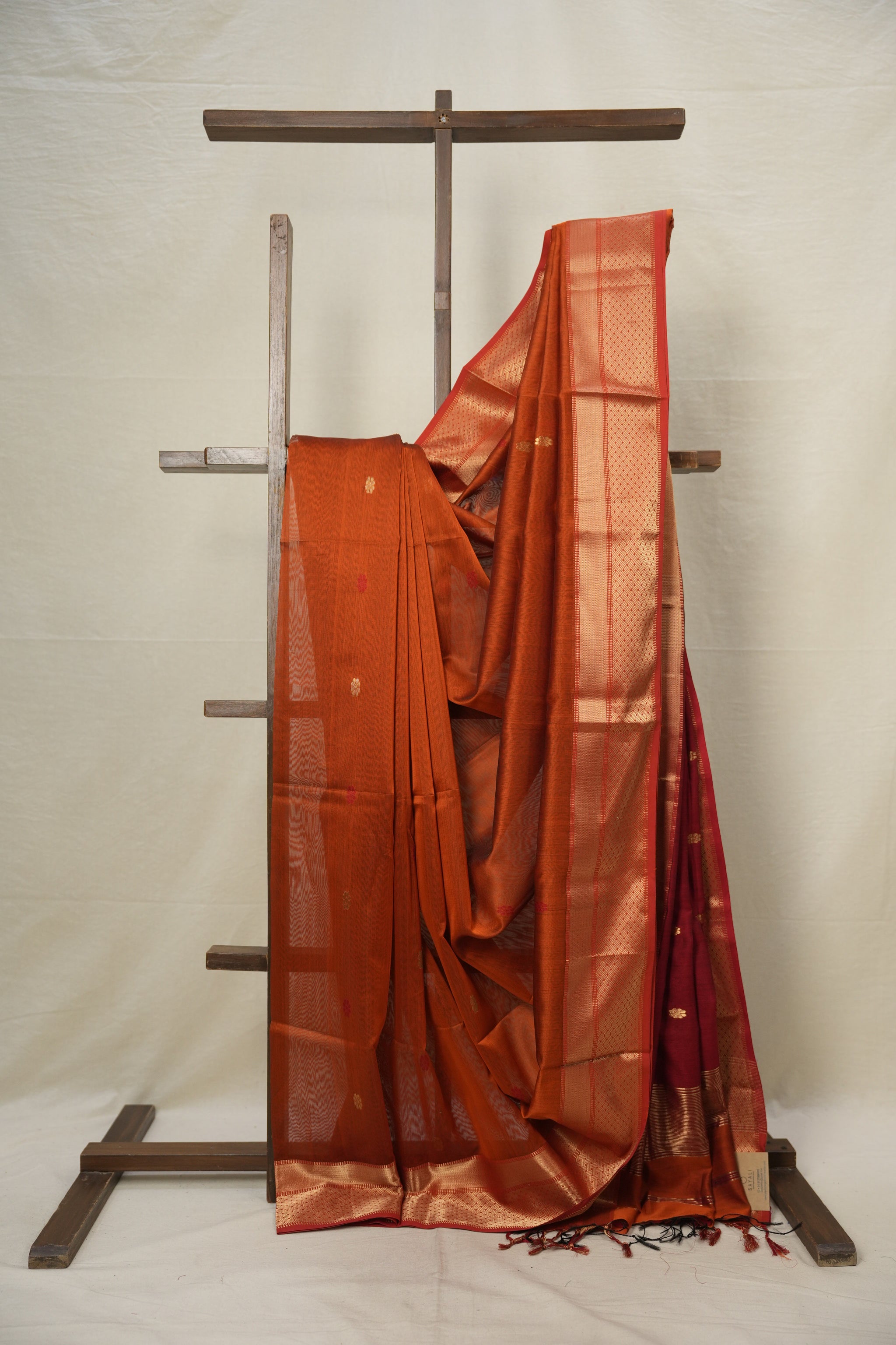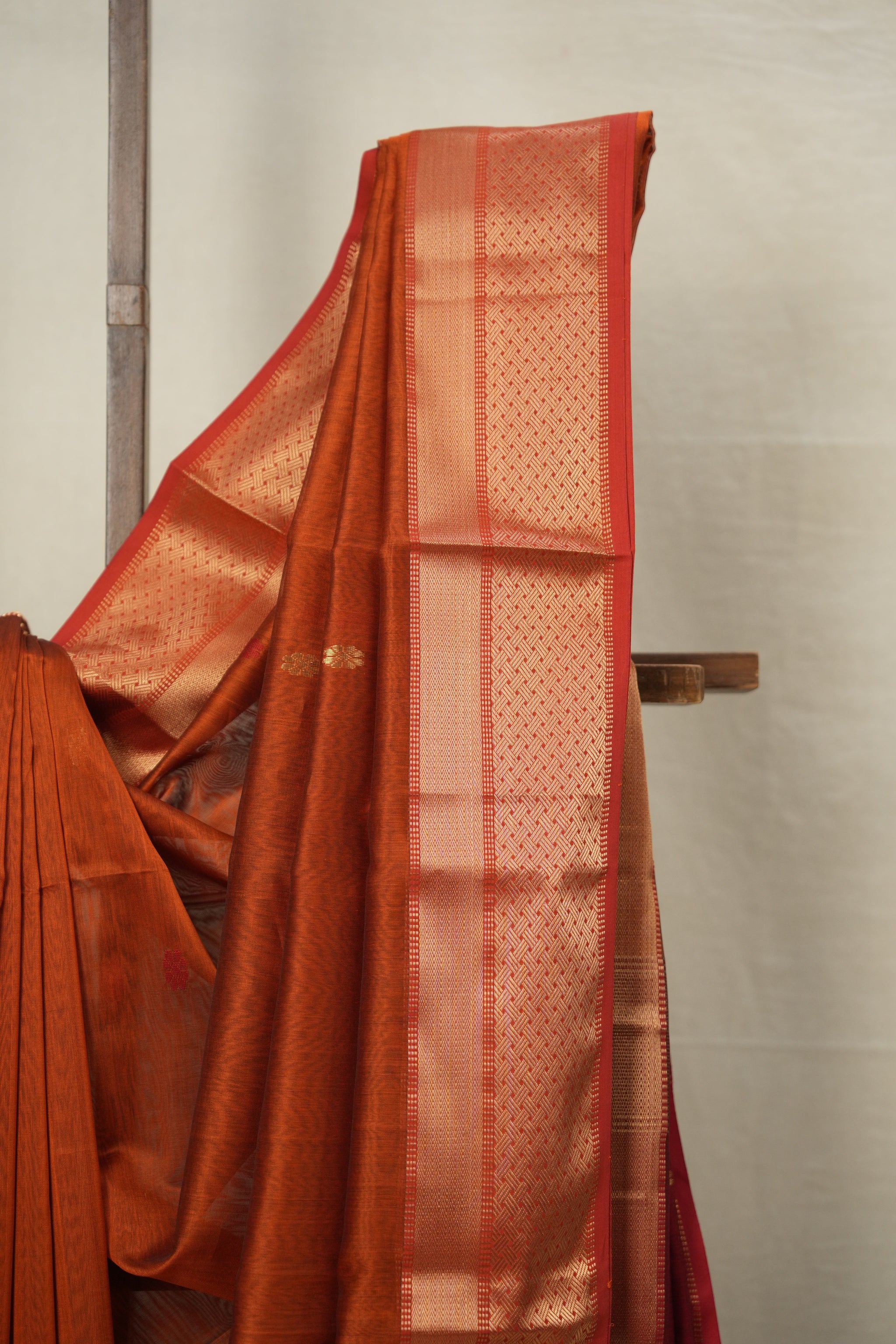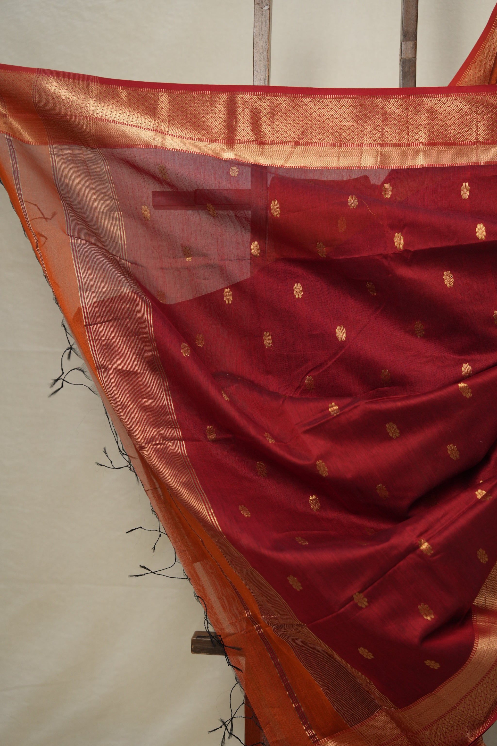 Work - This Maheshwari cotton silk saree features a plain body with butti and zari border and pallu.