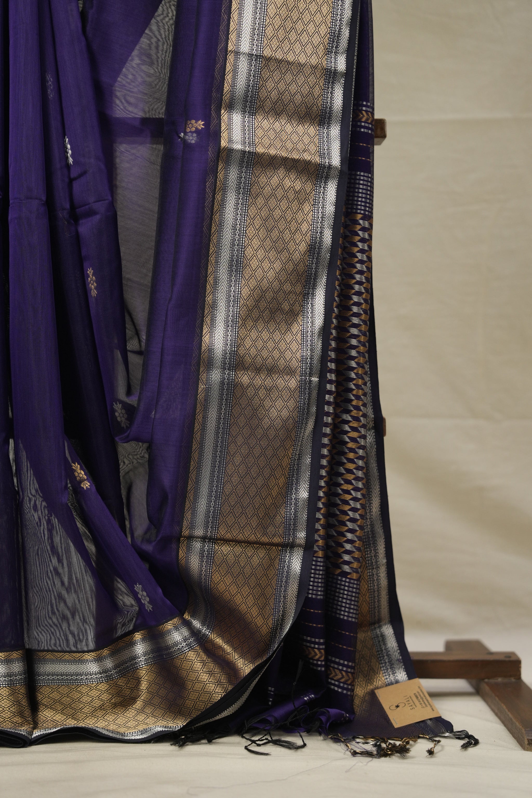 Work - This Maheshwari cotton silk saree features a plain body with butta and zari border and pallu.