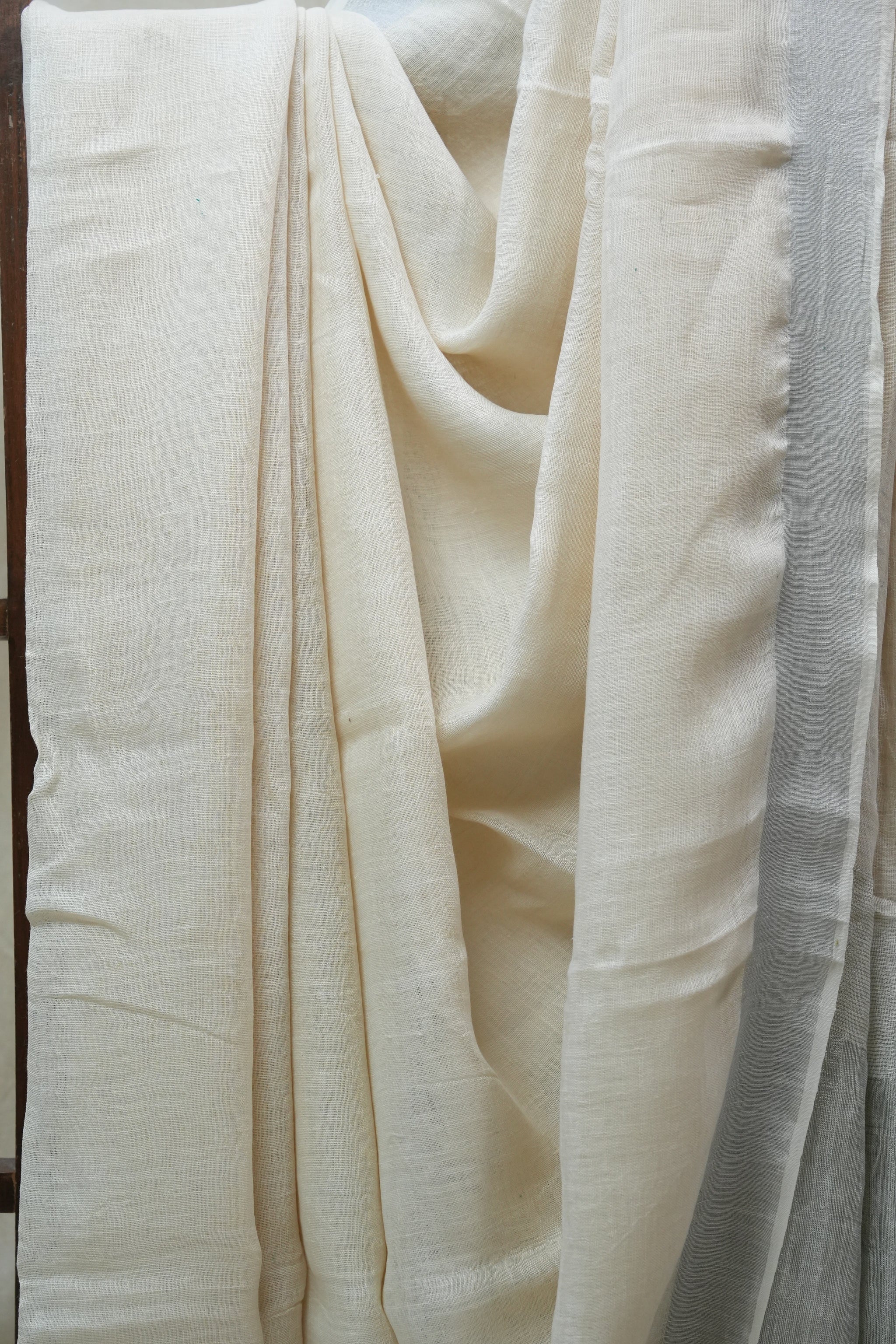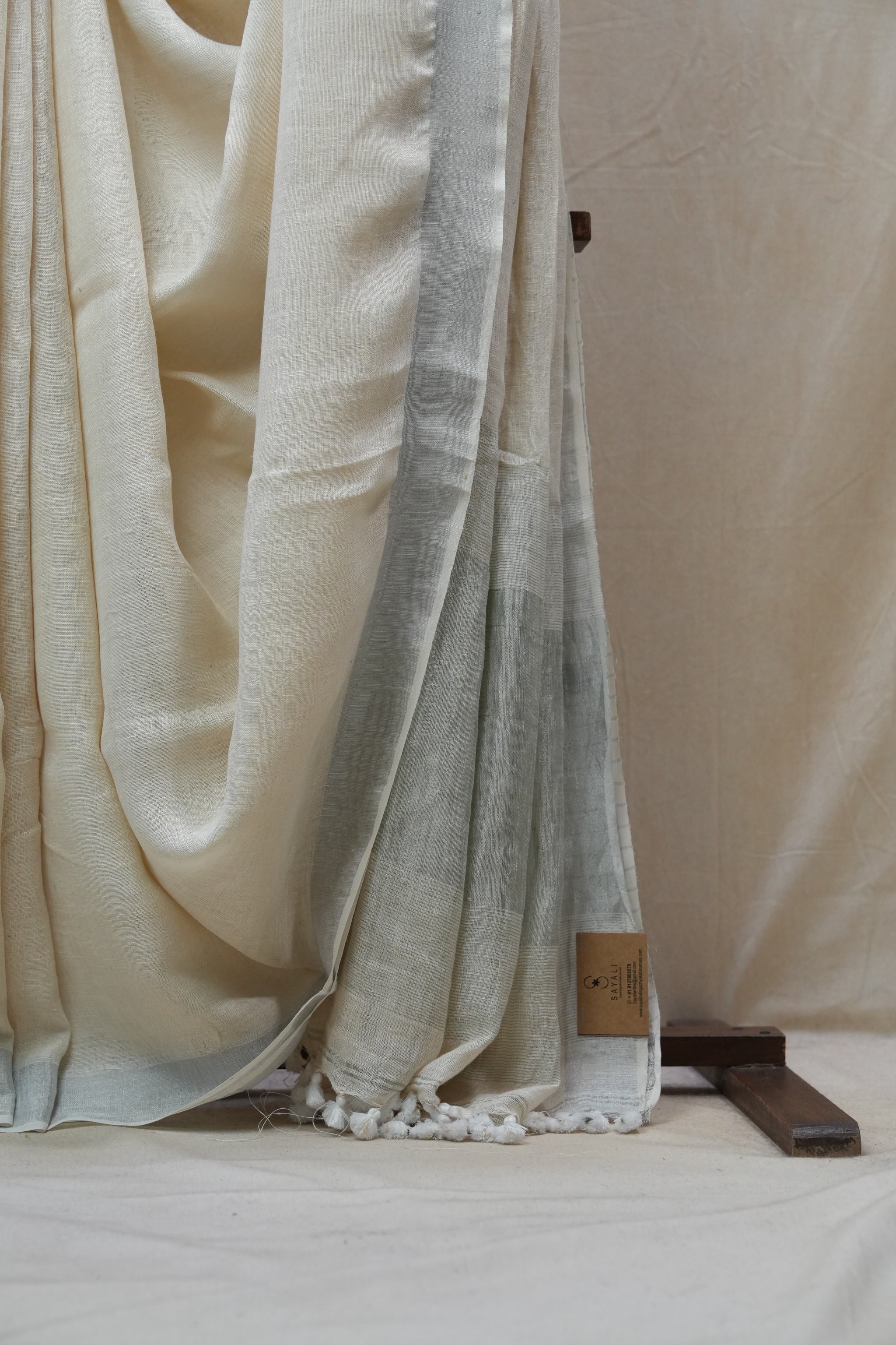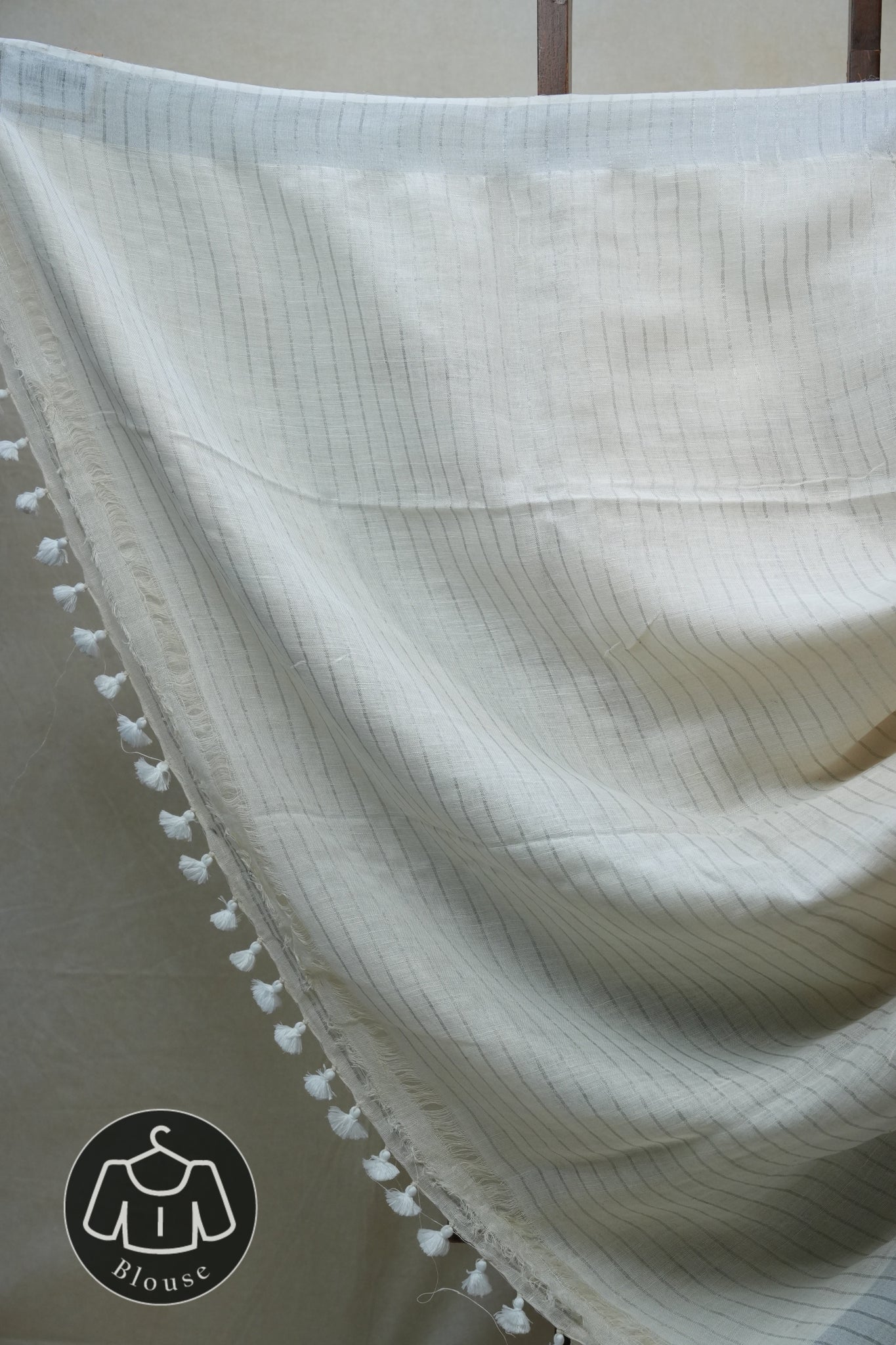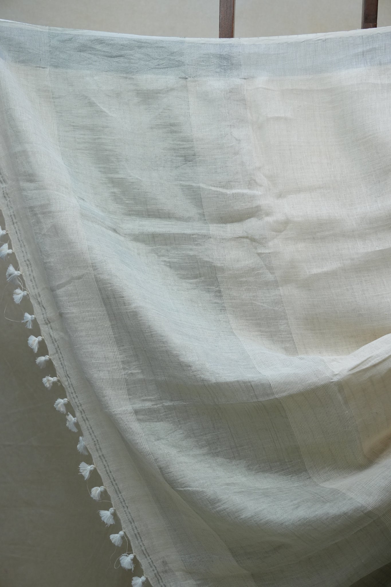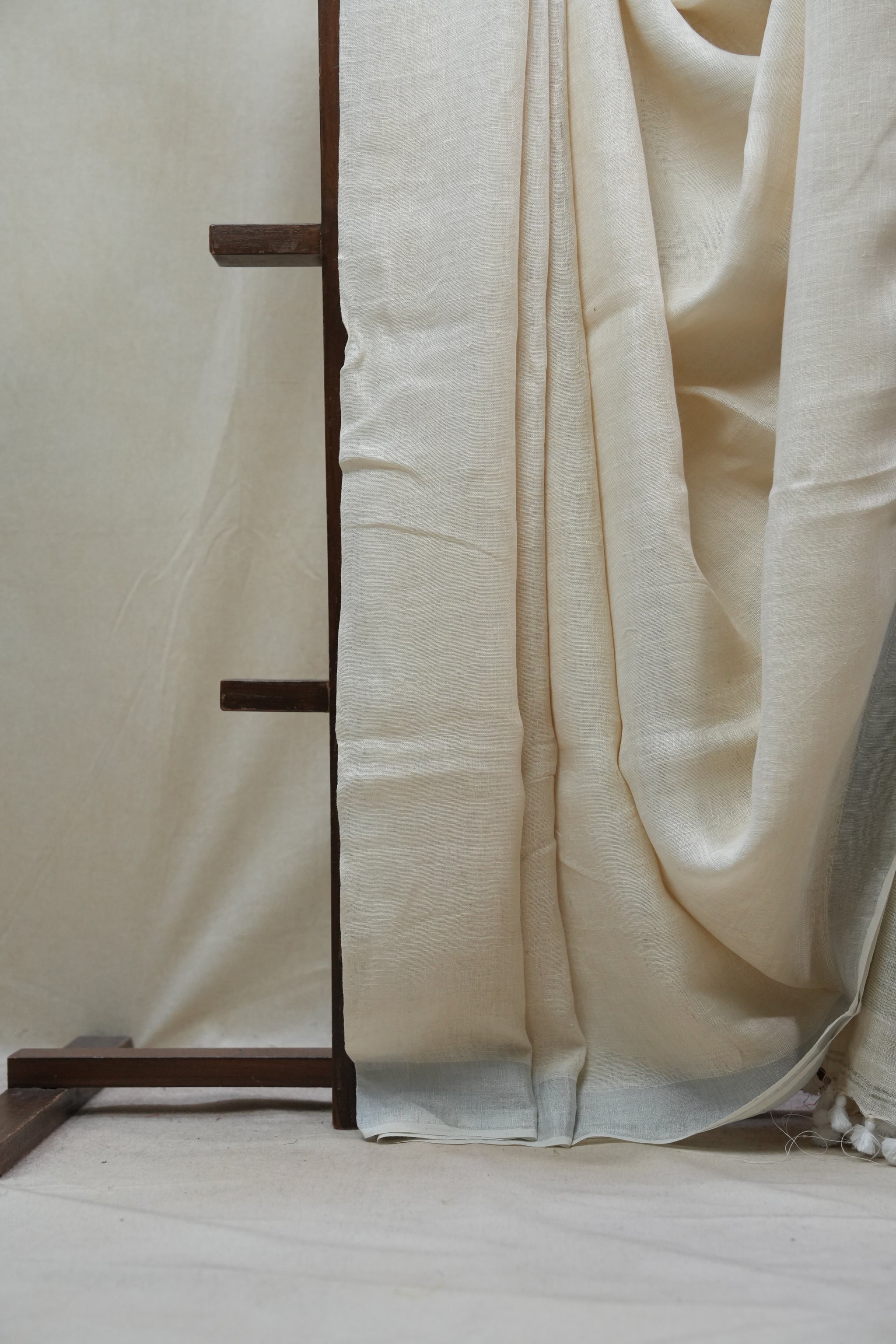 Off White Plain Linen Saree With White Tassels - SROWPLS296