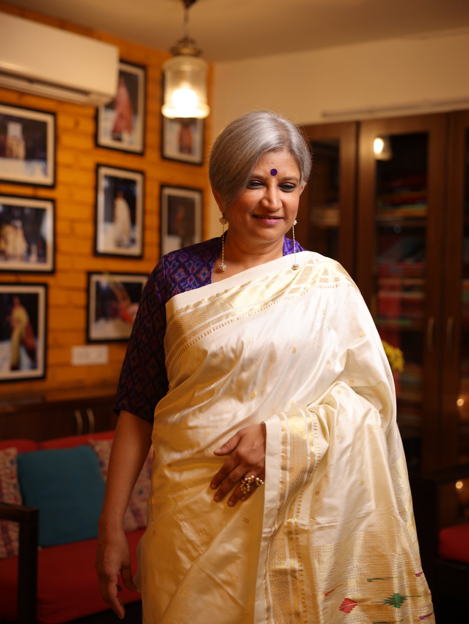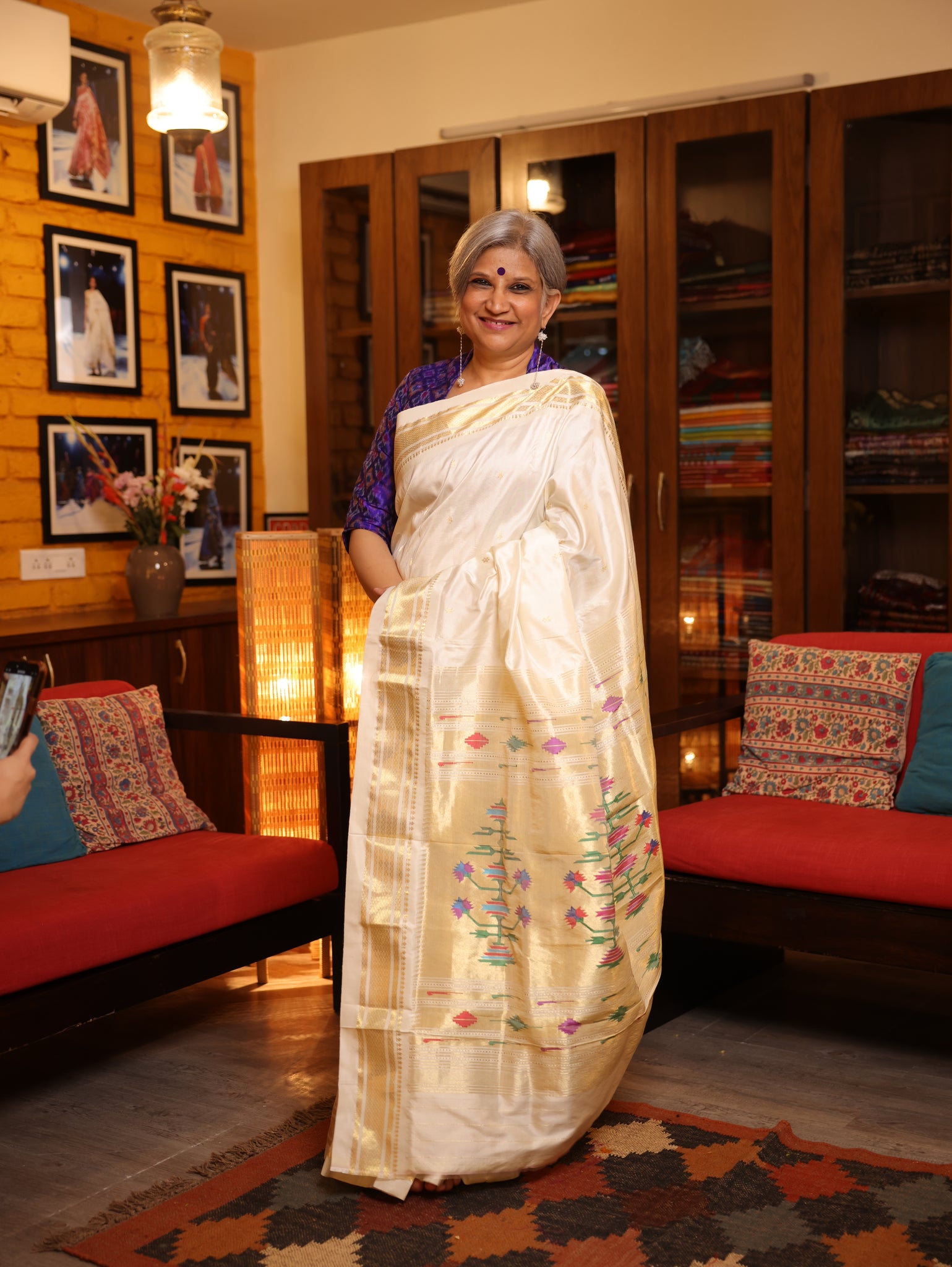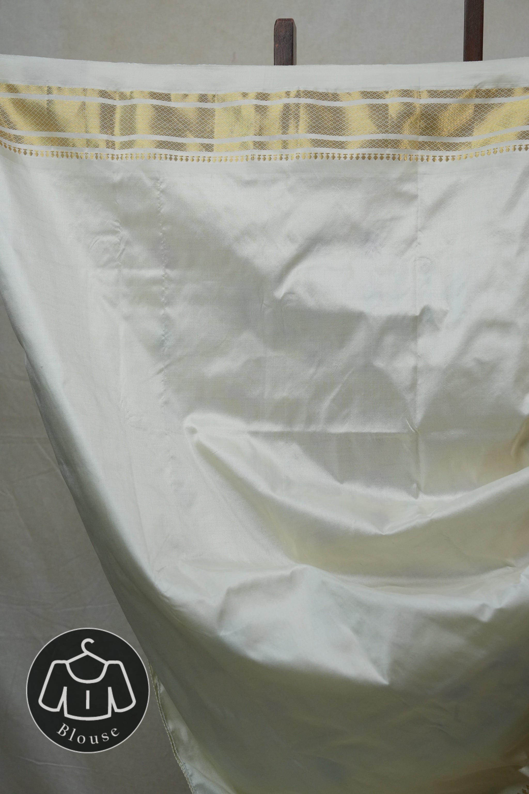 Work - The saree features scattered zari buttas (motifs) on the body, complemented by a broad, intricately woven golden zari border and asawali pallu.