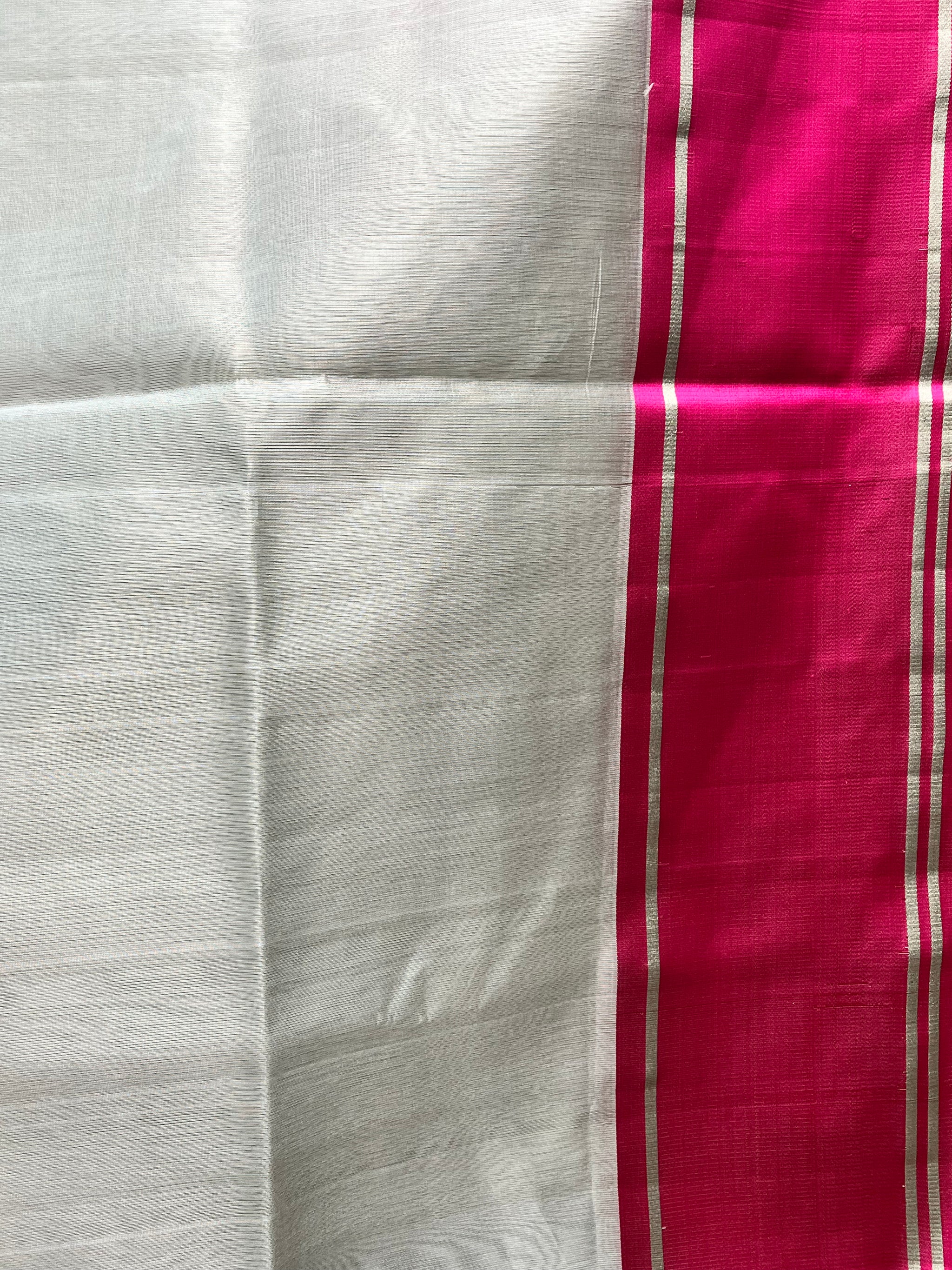 Work - This handloom white chanderi pure silk saree with beautiful pink-silver floral motifs all over the saree. The pallu is woven with intricate silver zari and saree has a big pink zari border.