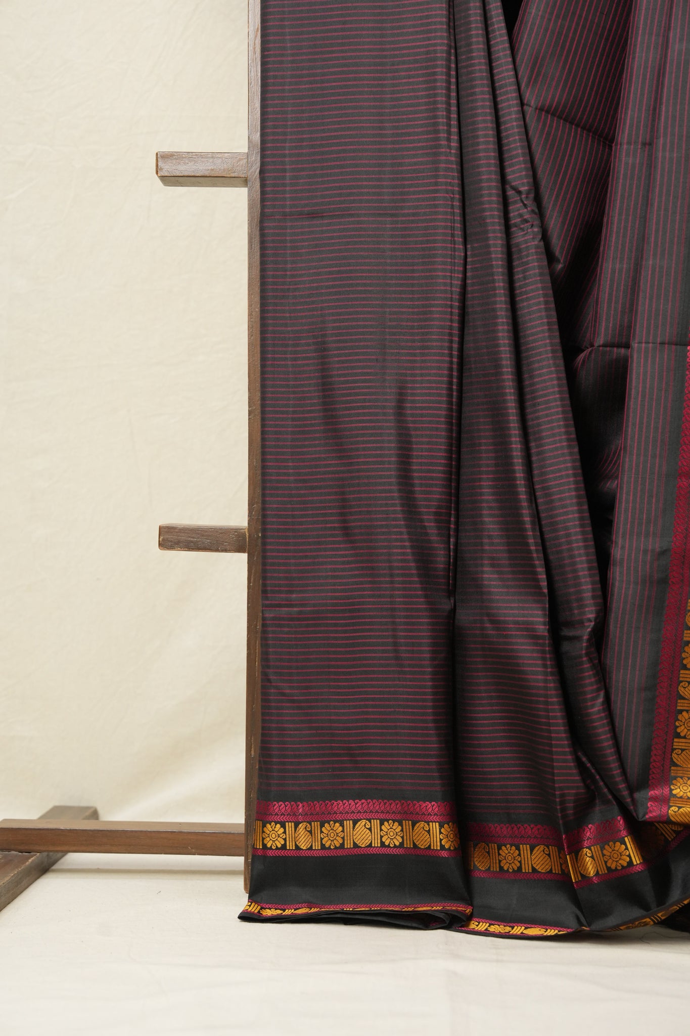 Work - Kanjeevaram silk saree with black body, multi-striped pallu, and contrasting woven borders.