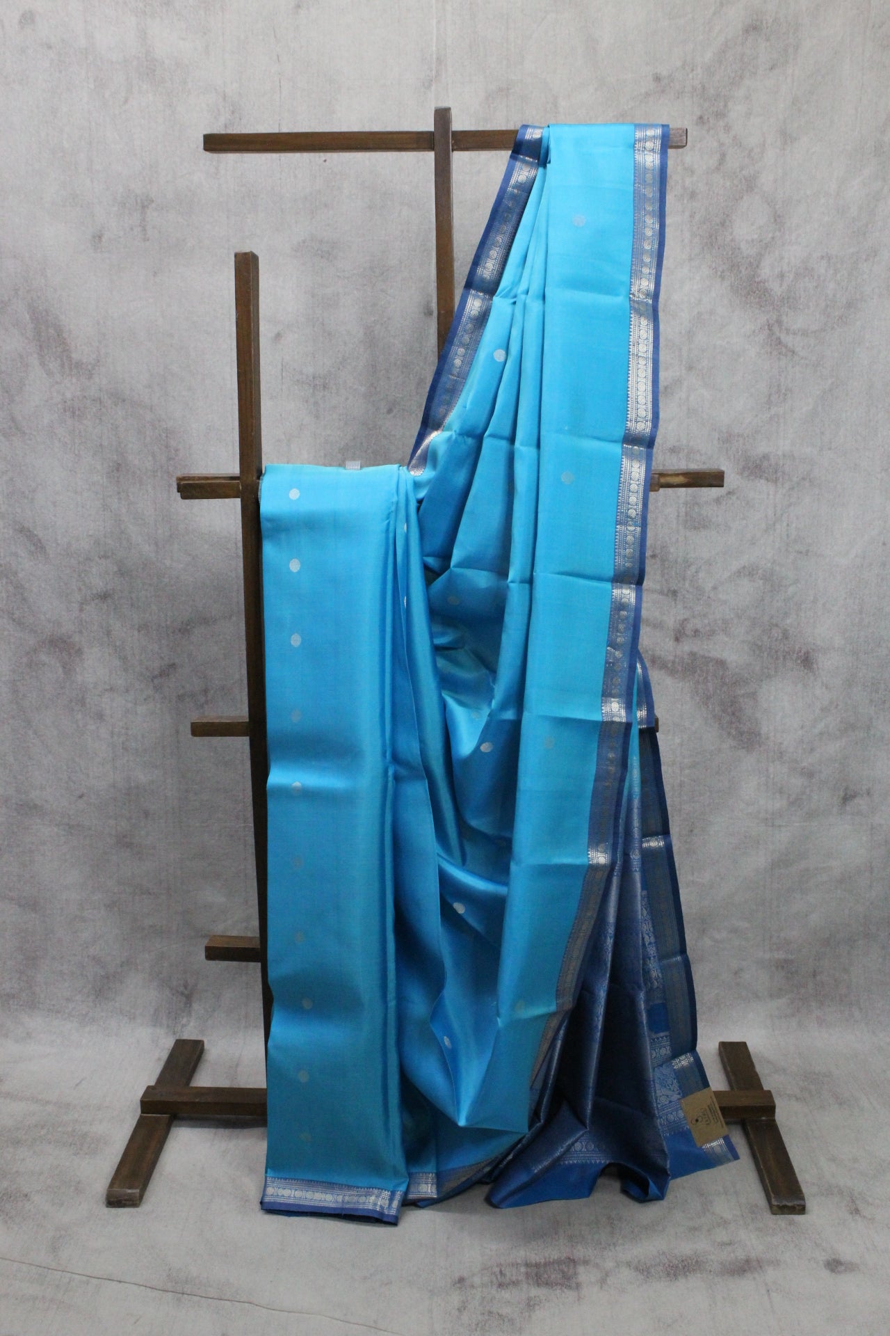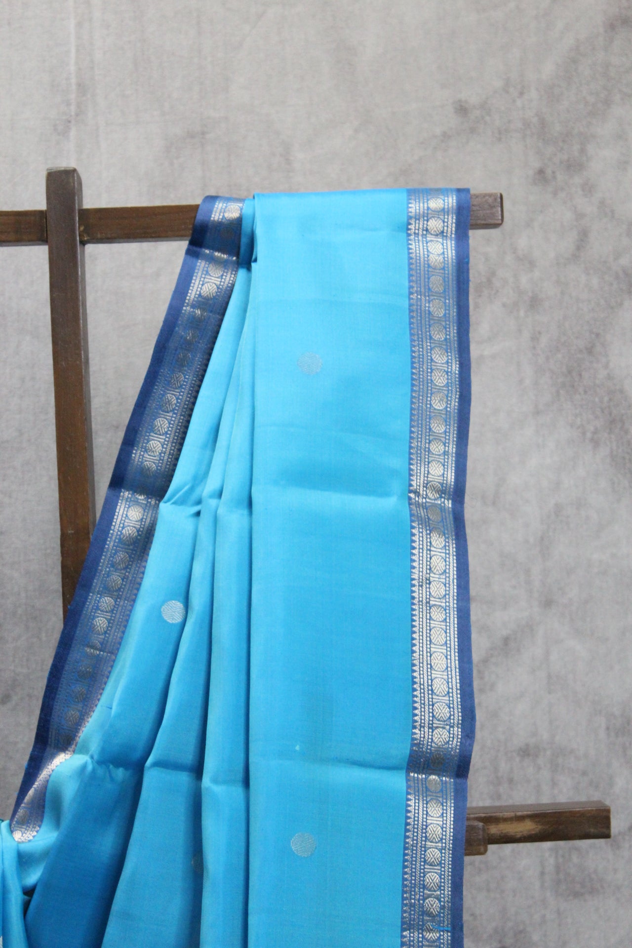 Work - The light blue Kanjeevaram silk saree features small silver woven motifs across the body and a contrasting dark blue border with silver zari work.