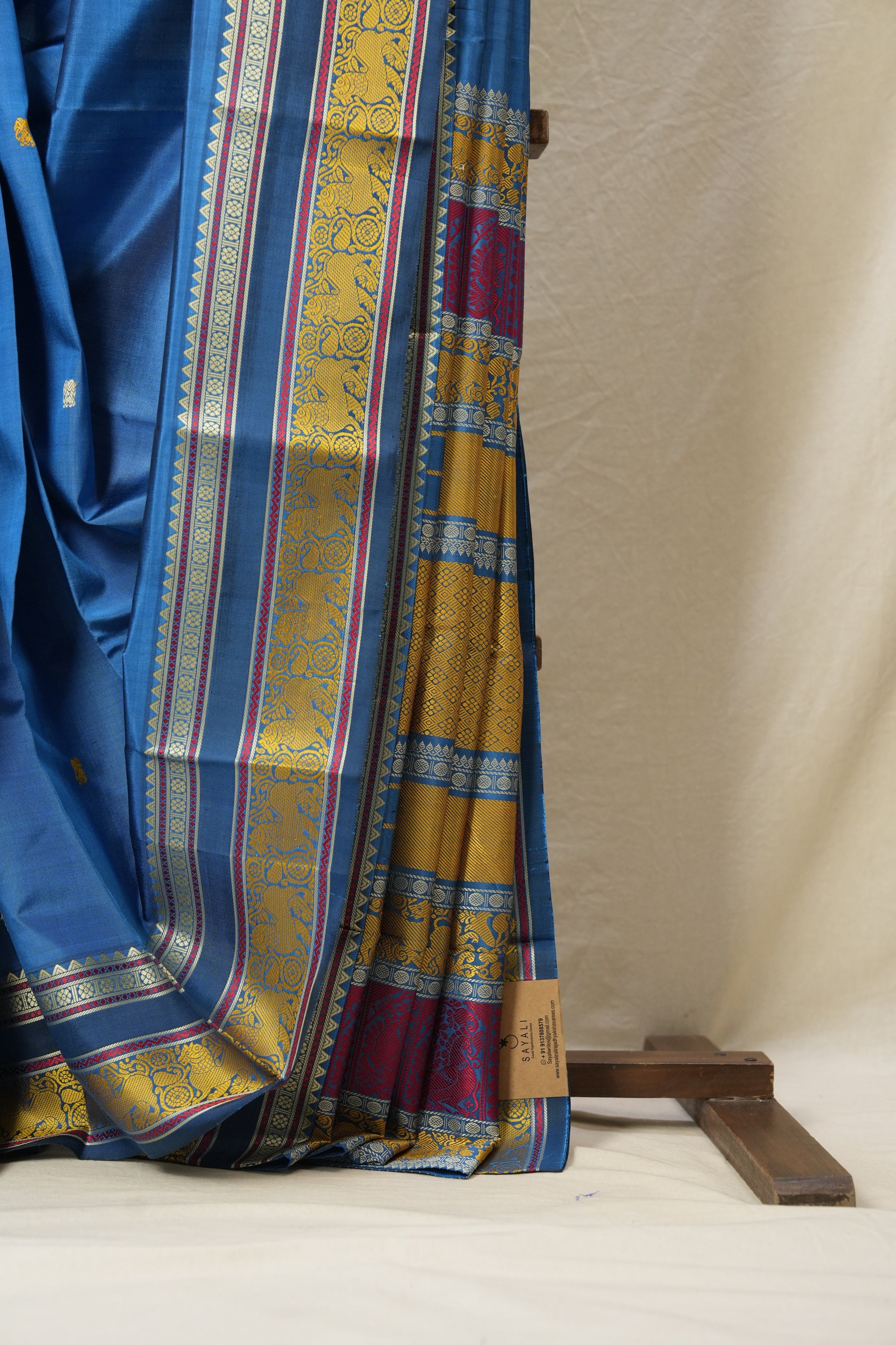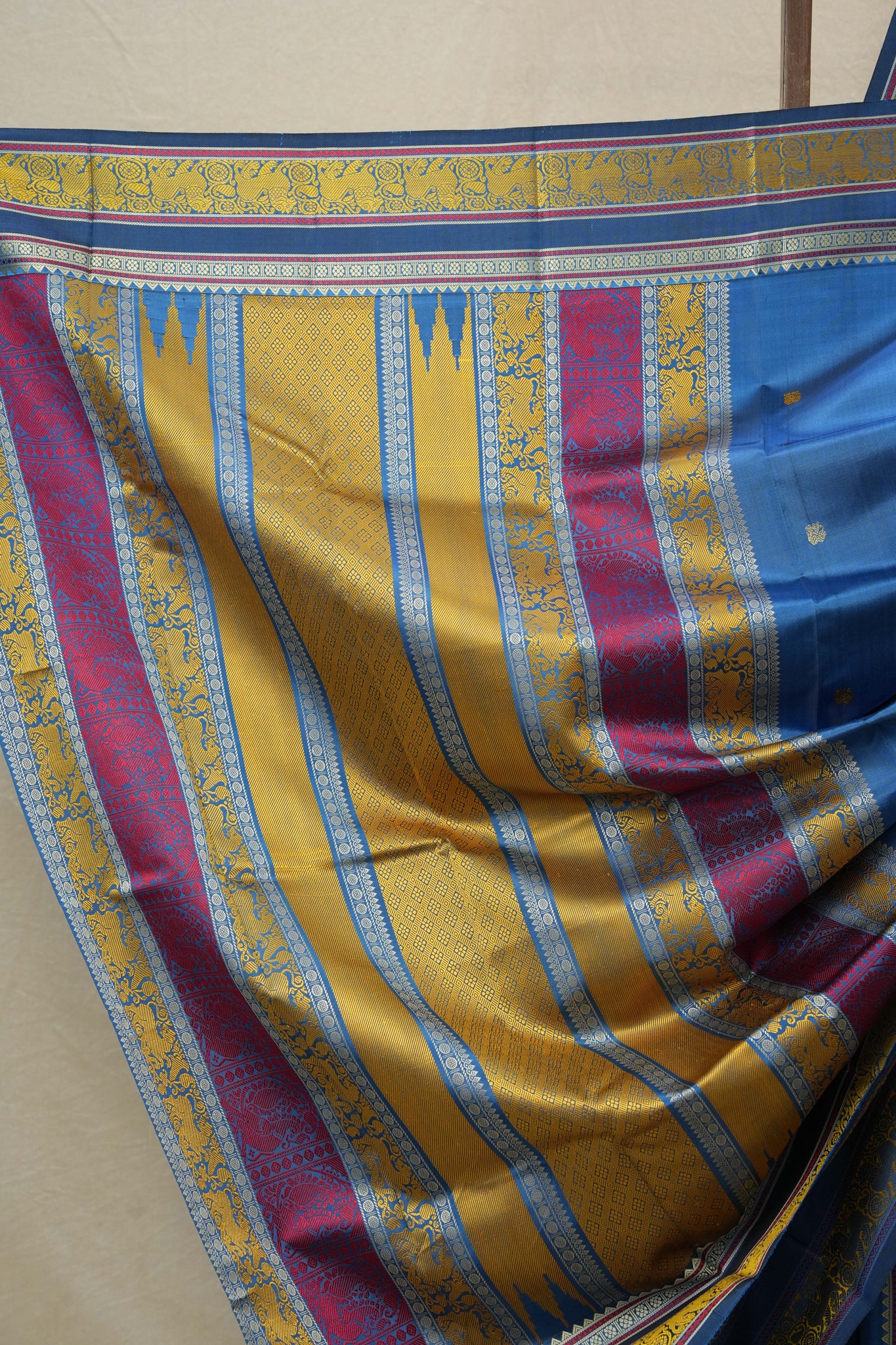 Work - Vibrant blue kanjeevaram silk saree with wide golden zari borders, a rich golden striped pallu, and scattered body buttas, all handloom woven.
