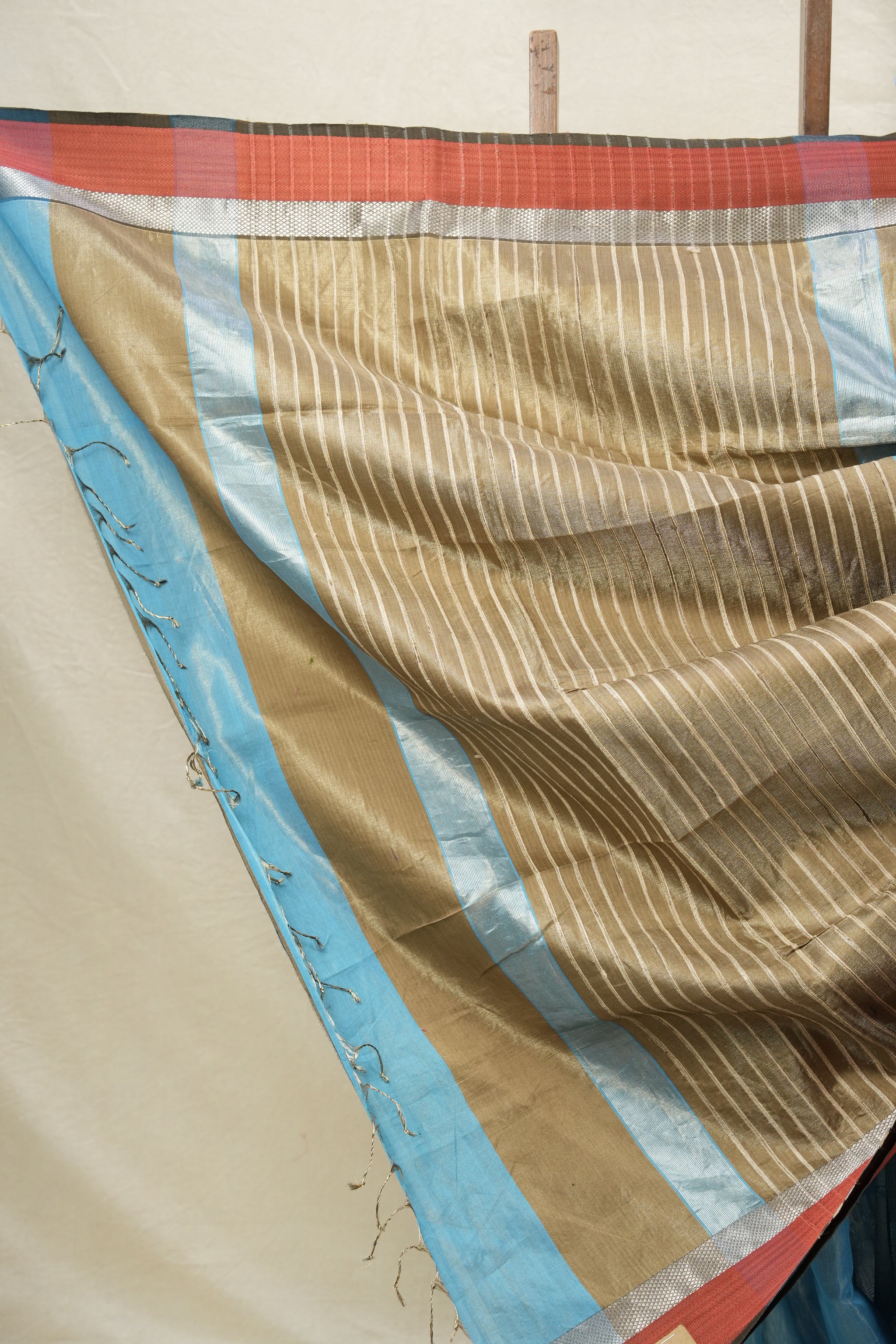 Work - The blue saree has a plain body with a contrasting border and pallu, featuring broad gold and silver stripes.