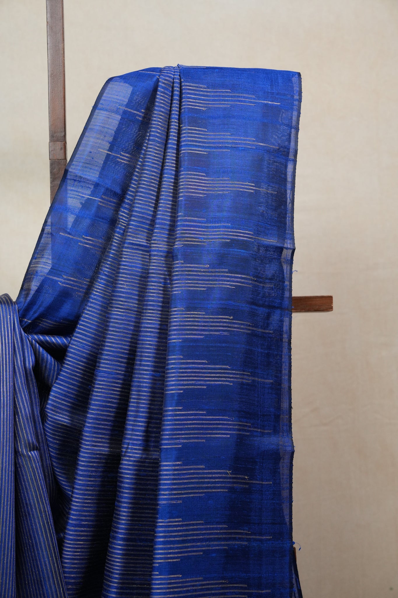 Work - This blue saree is adorned with fine golden stripes and a pallu featuring elongated linear motifs for an elegant finish.