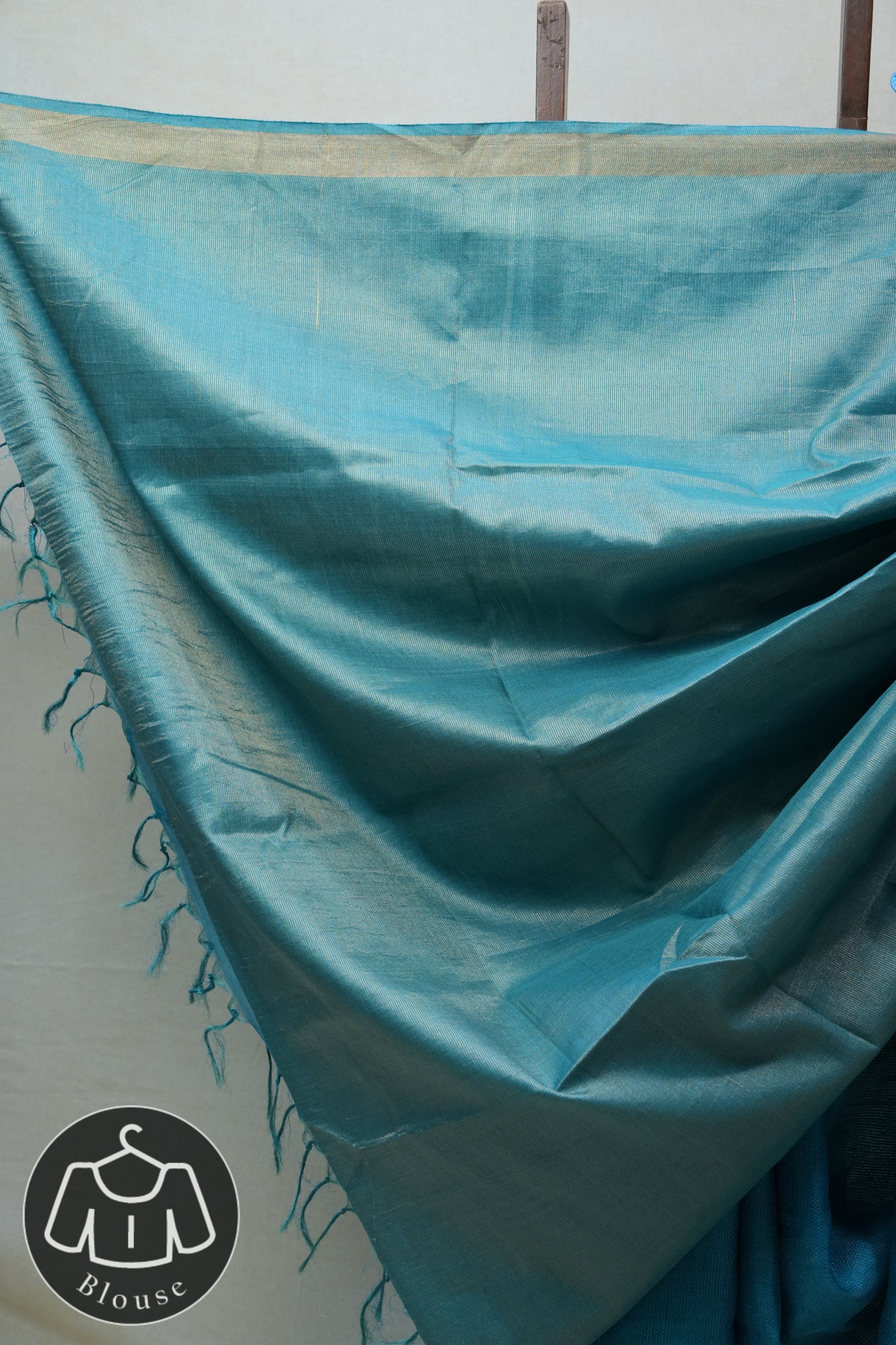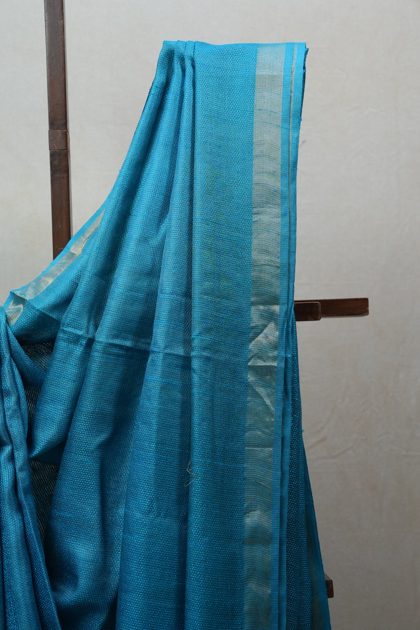 Work -  This is a blue tussar saree with a self-woven or striped pattern and a subtle, ornate border.