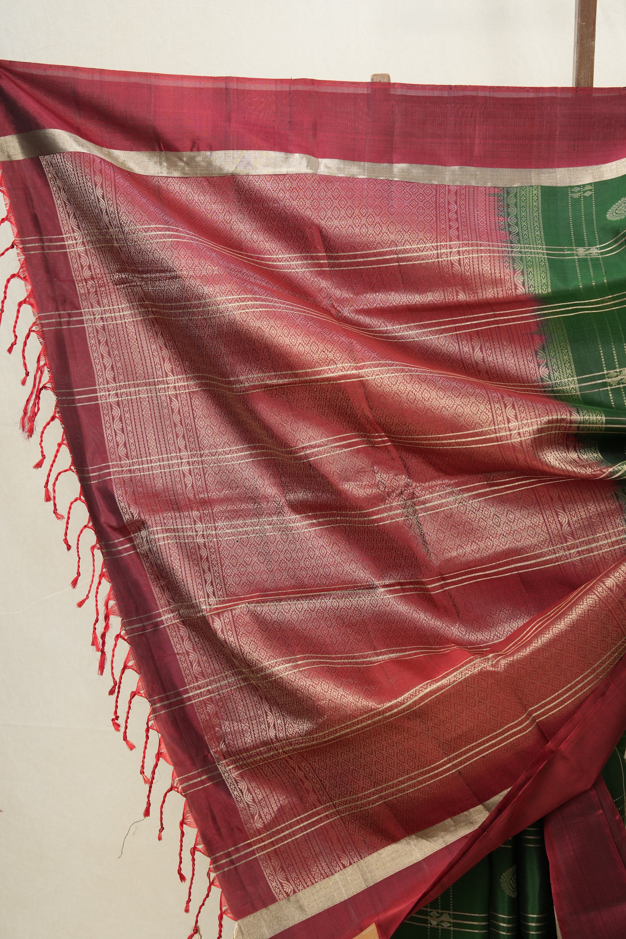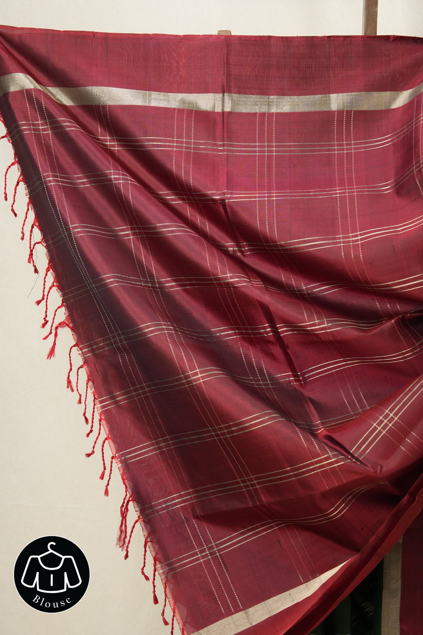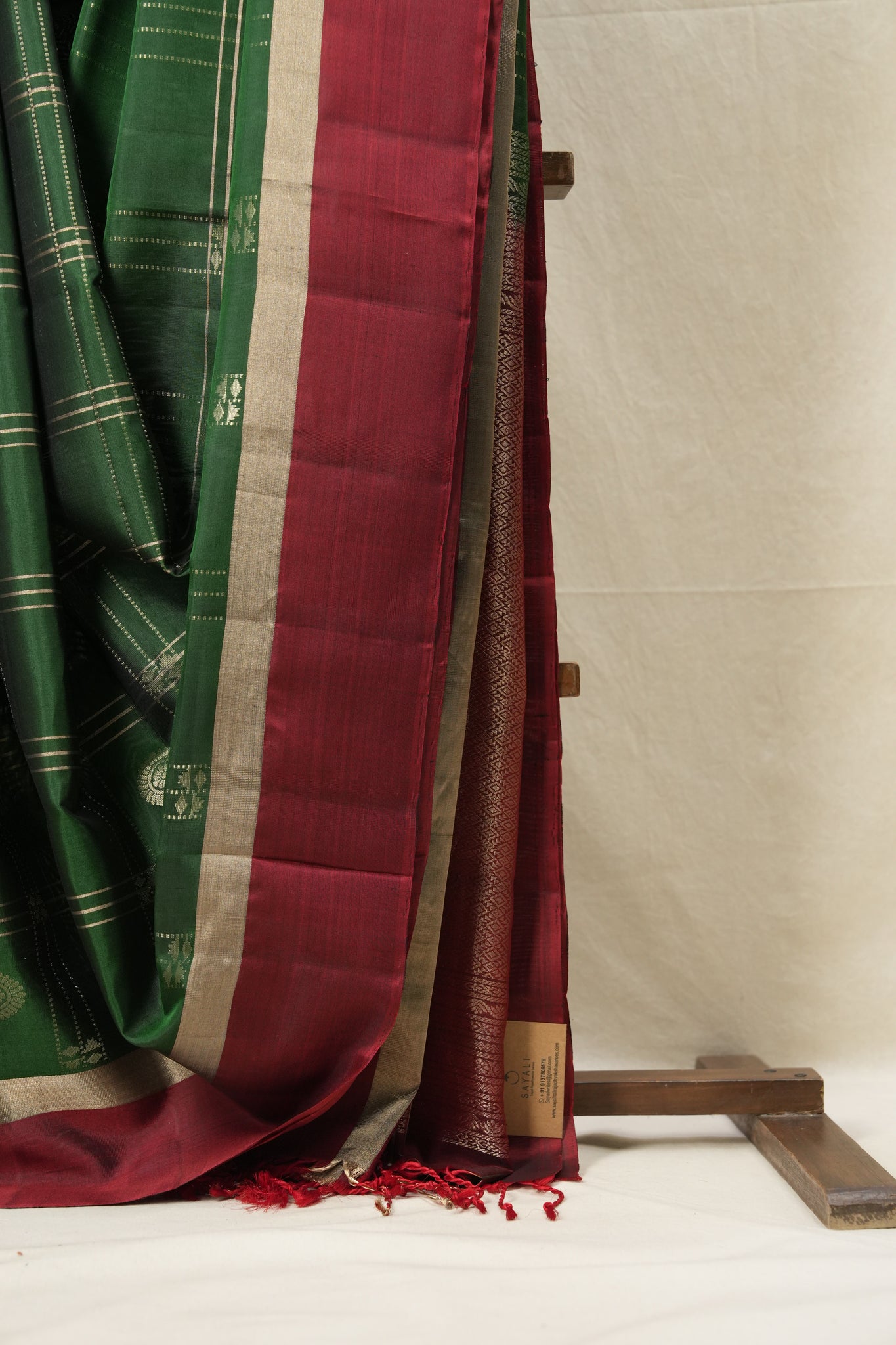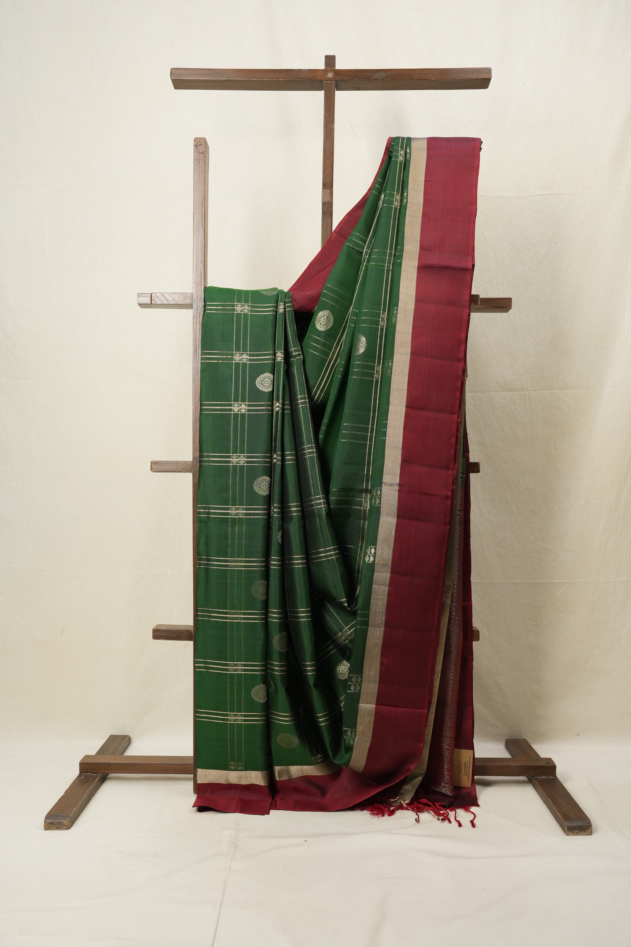 Work - The saree displays a bottle green body with gold zari checks and circular motifs, contrasted by a maroon border and pallu featuring gold zari stripes.