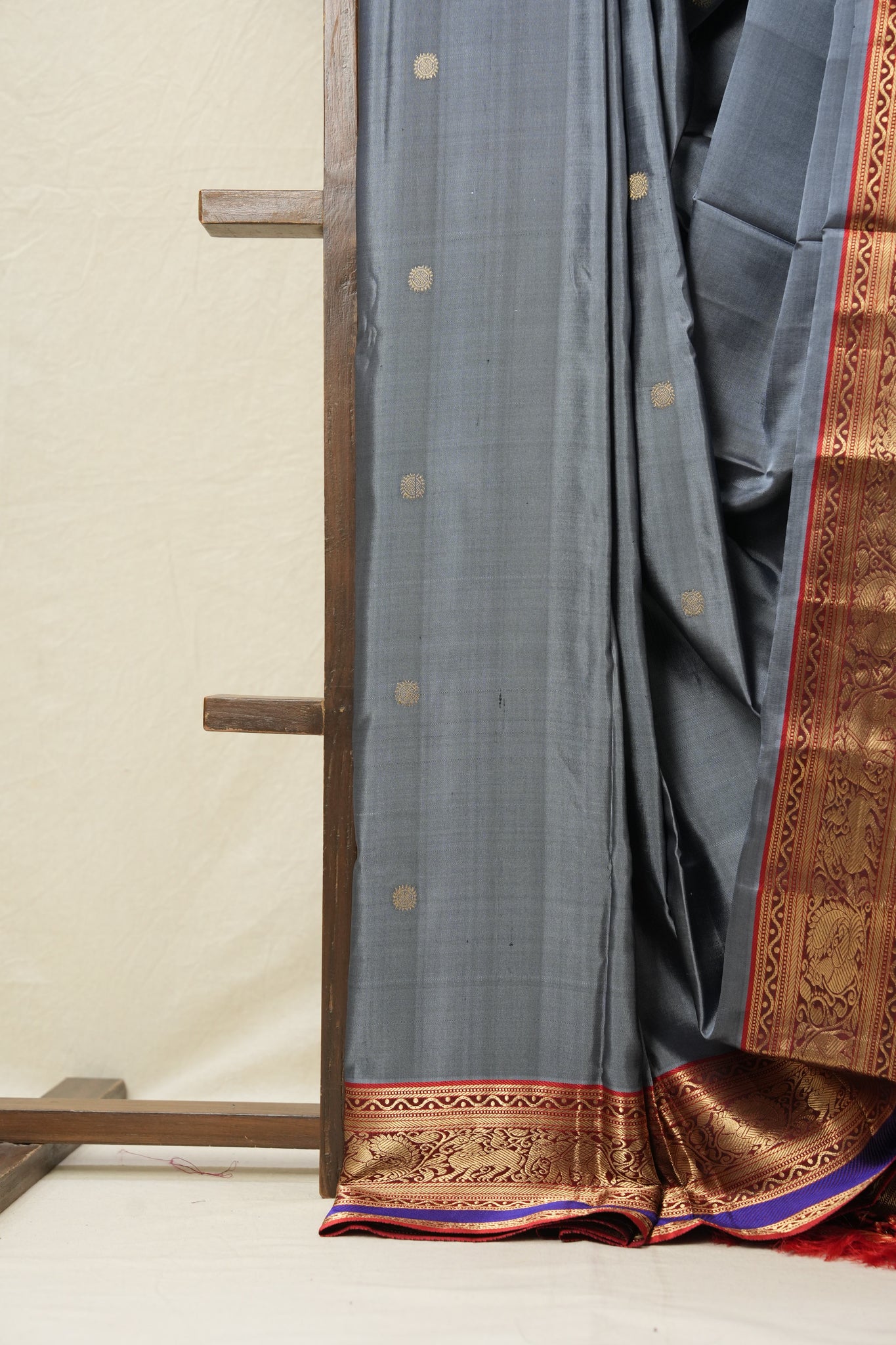 Work - Handloom dark grey pure Kanjeevaram silk saree adorned with gold buttas. A timeless piece of tradition and elegance, perfect for your treasured collection.