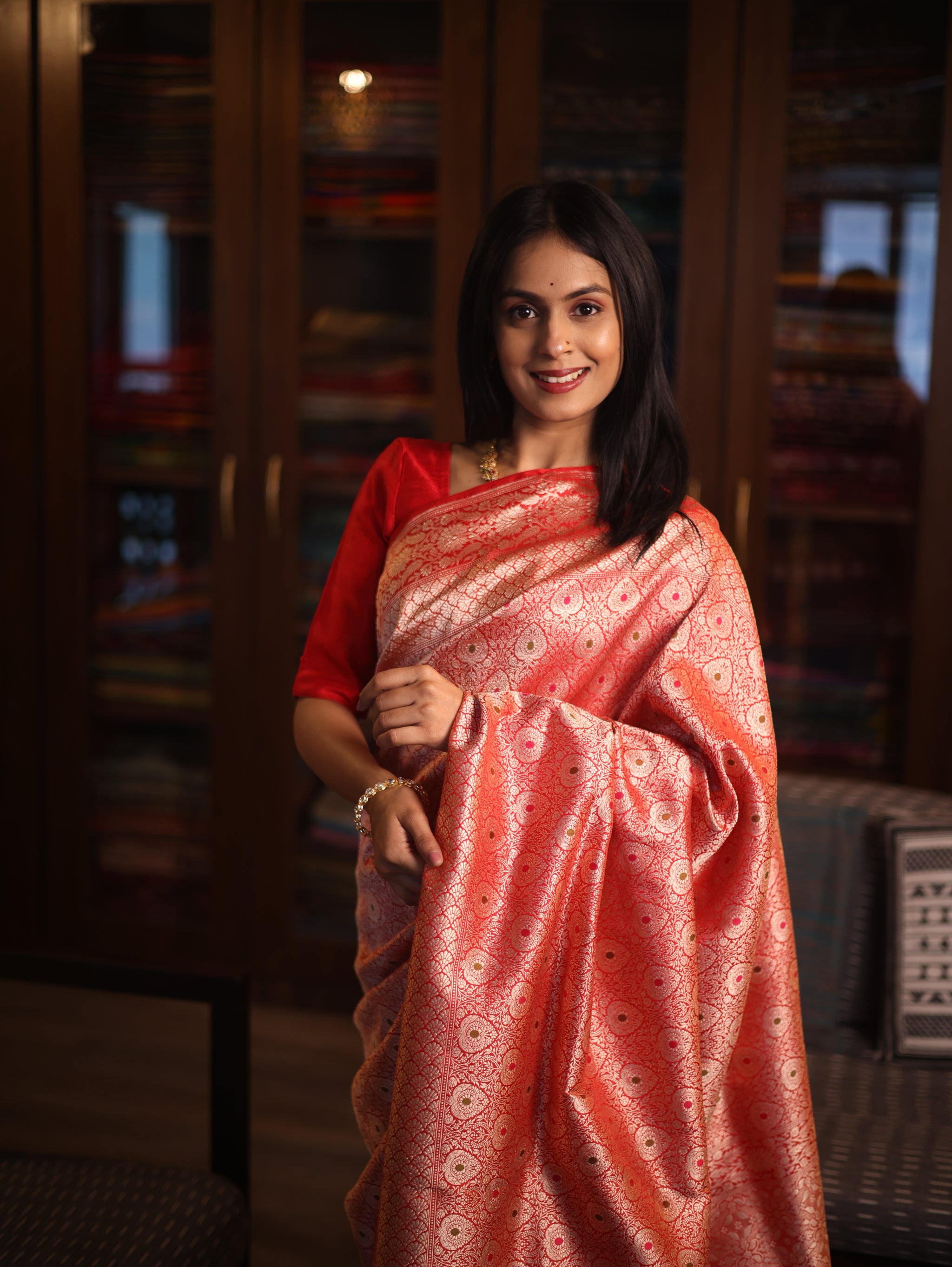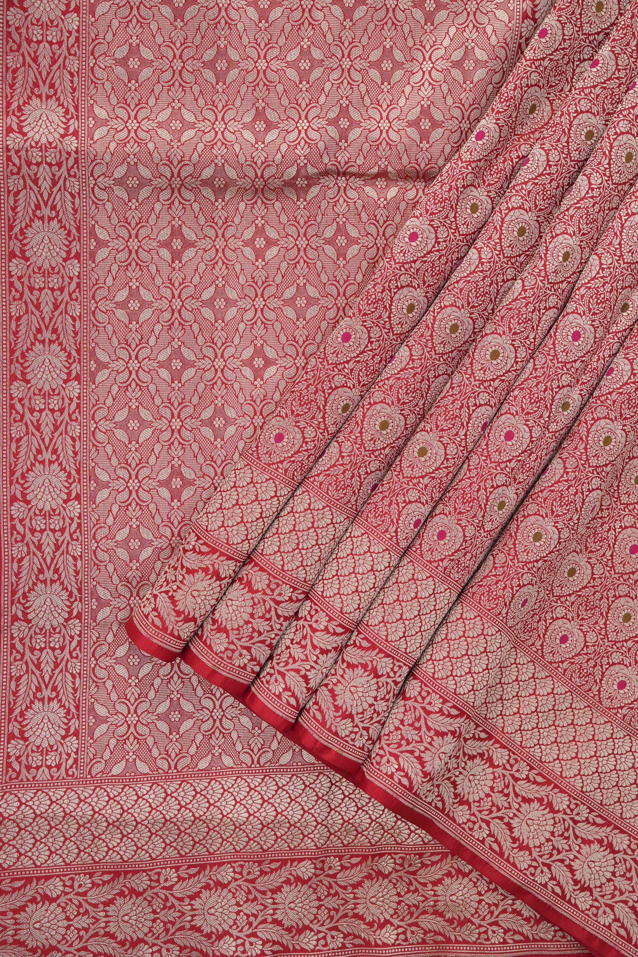 Work - This Banarasi silk saree is characterized by its vibrant red base, heavily woven with intricate gold zari floral motifs throughout the body, pallu, and borders.