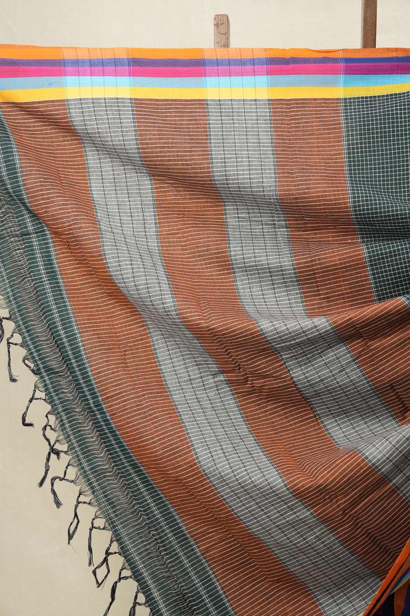Work - Subtle Checkered Pattern on the body with vibrant light blue and red borders and a striped pallu featuring tassels.