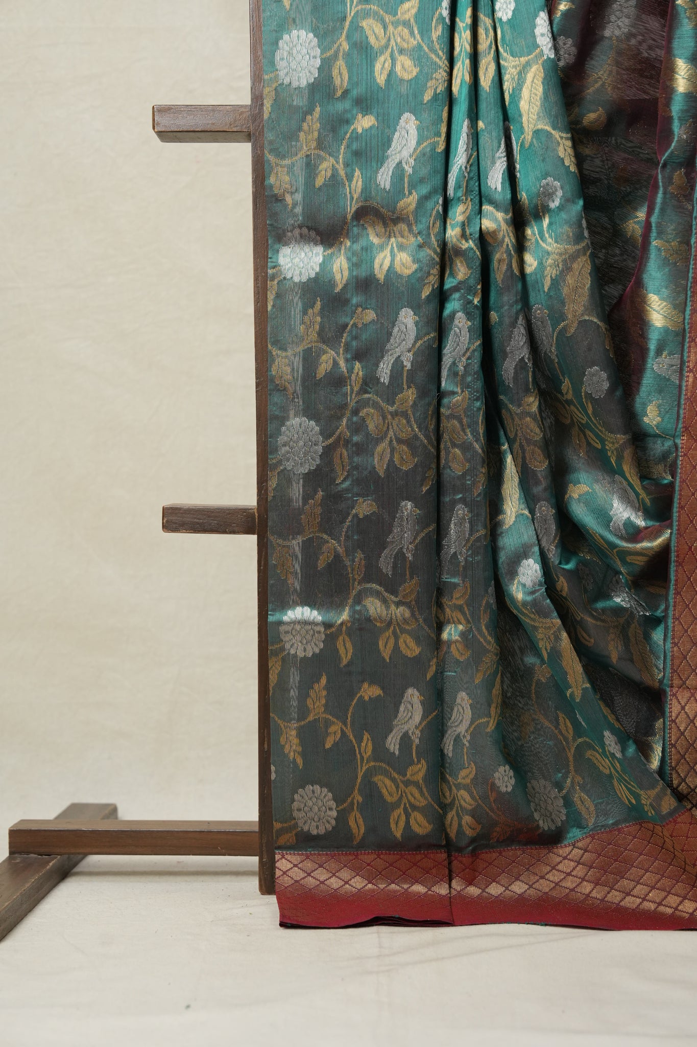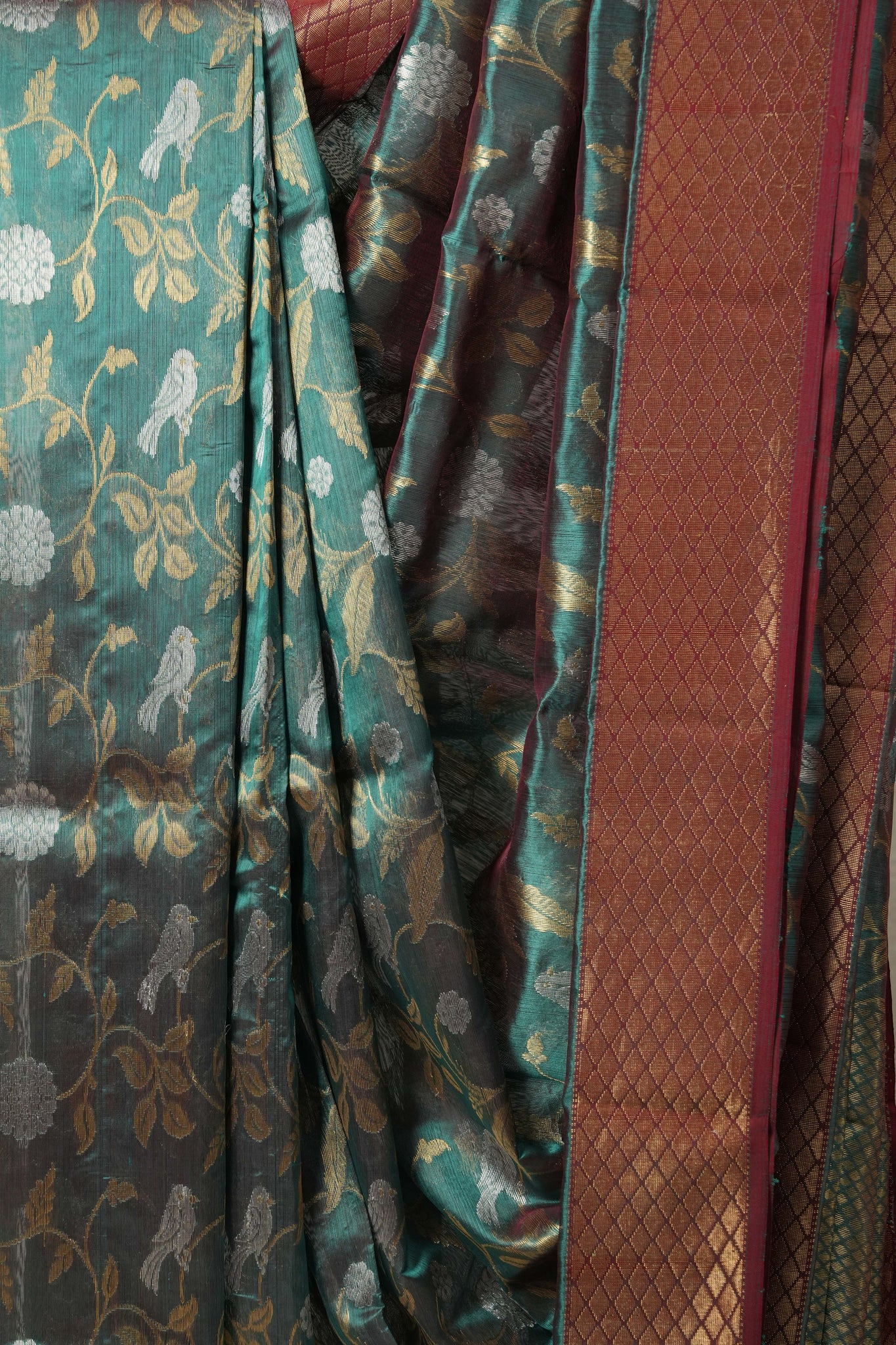 Work - Green Chanderi silk saree featuring silver and gold floral zari buttas with a contrasting rust-red diamond-patterned border.