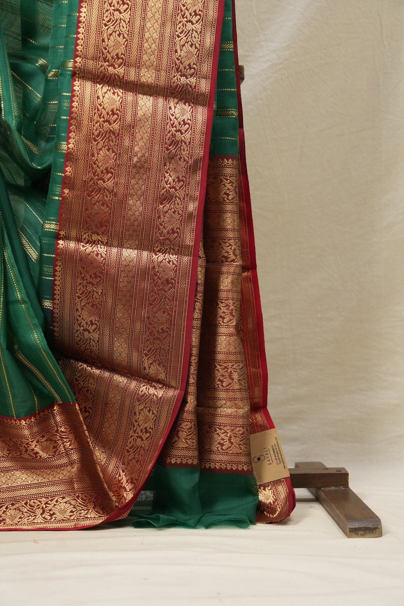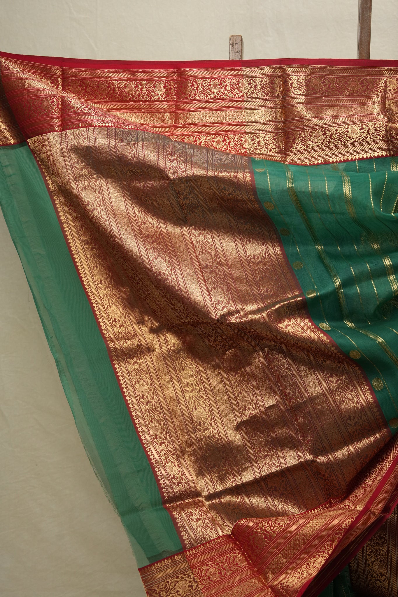 Work - Striking gold zari stripes on a green body with a rich red border and pallu adorned in intricate traditional gold motifs.