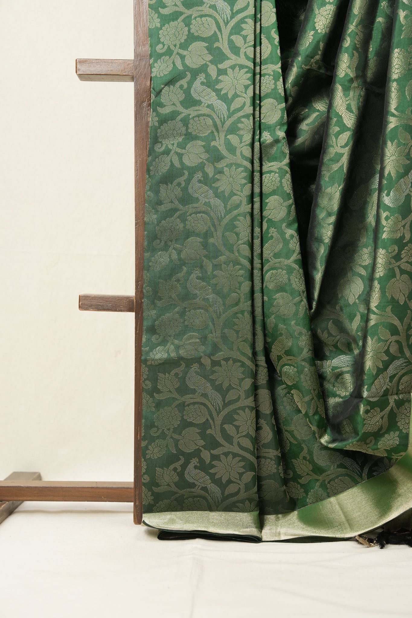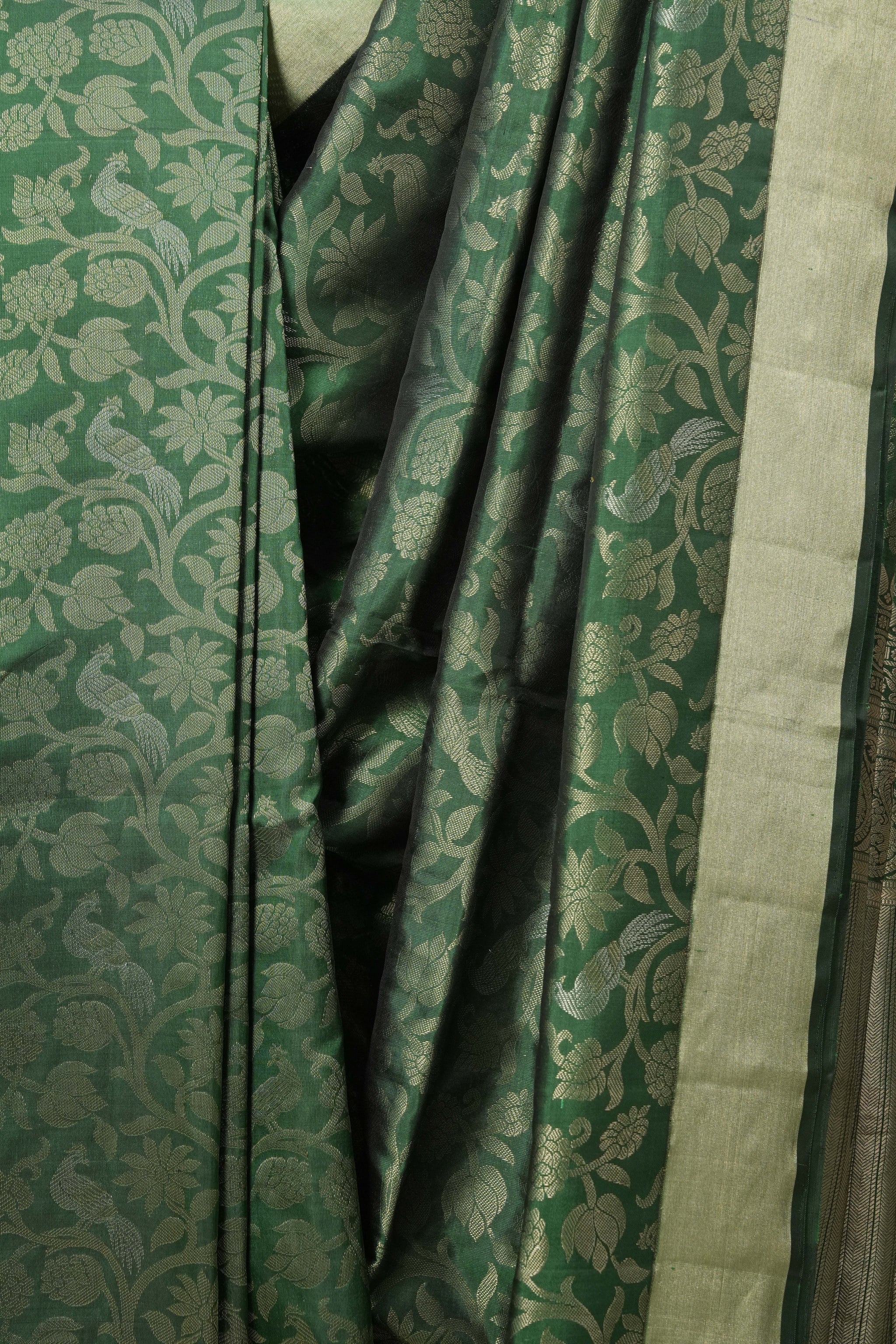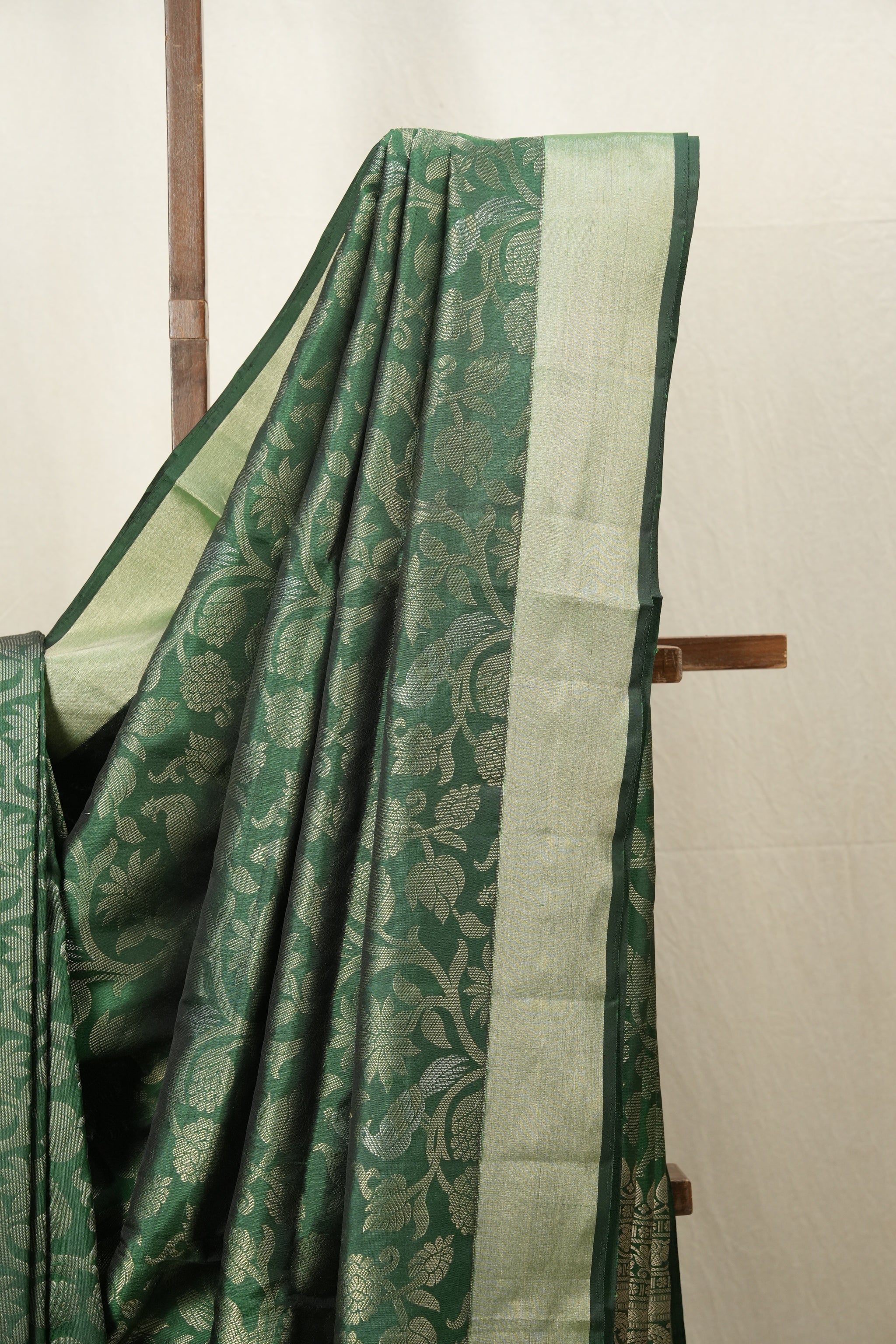 Work - The dark green soft silk saree is embellished with woven silver zari floral and leaf motifs, enhanced by a contrasting light green border and intricately designed silver zari pallu.
