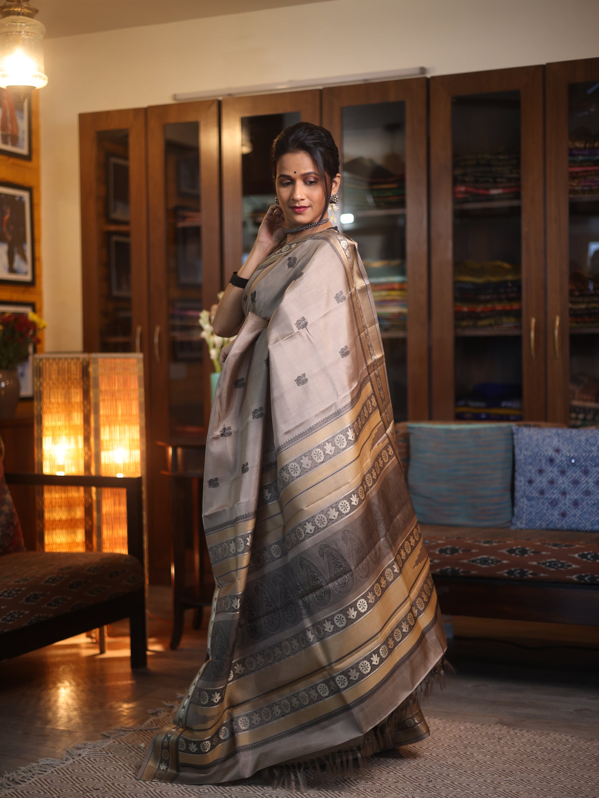Work - The work on this grey saree features subtle woven motifs on the body and an elaborate border with repeating circular and floral patterns and prominent gold zari weaving, all contributing to its elegant sheen.