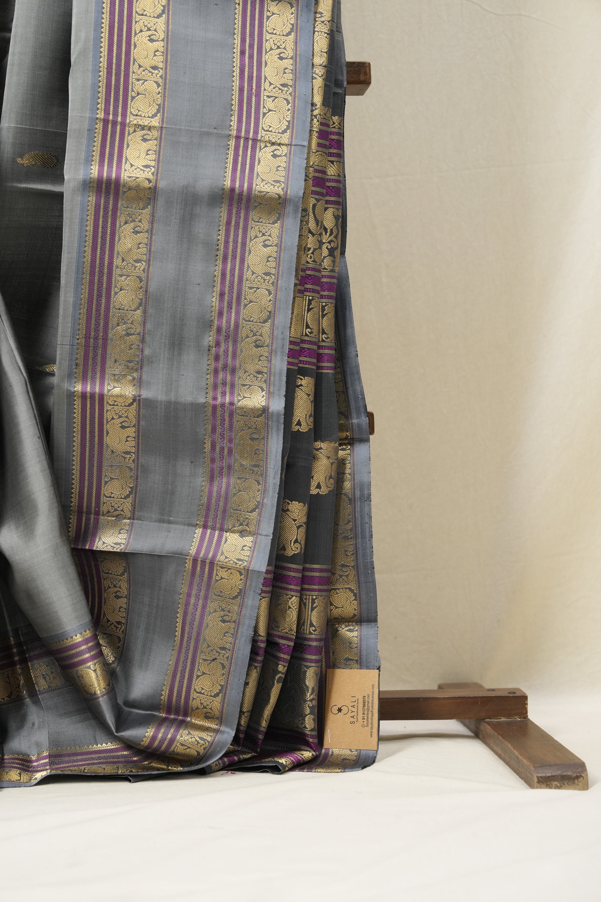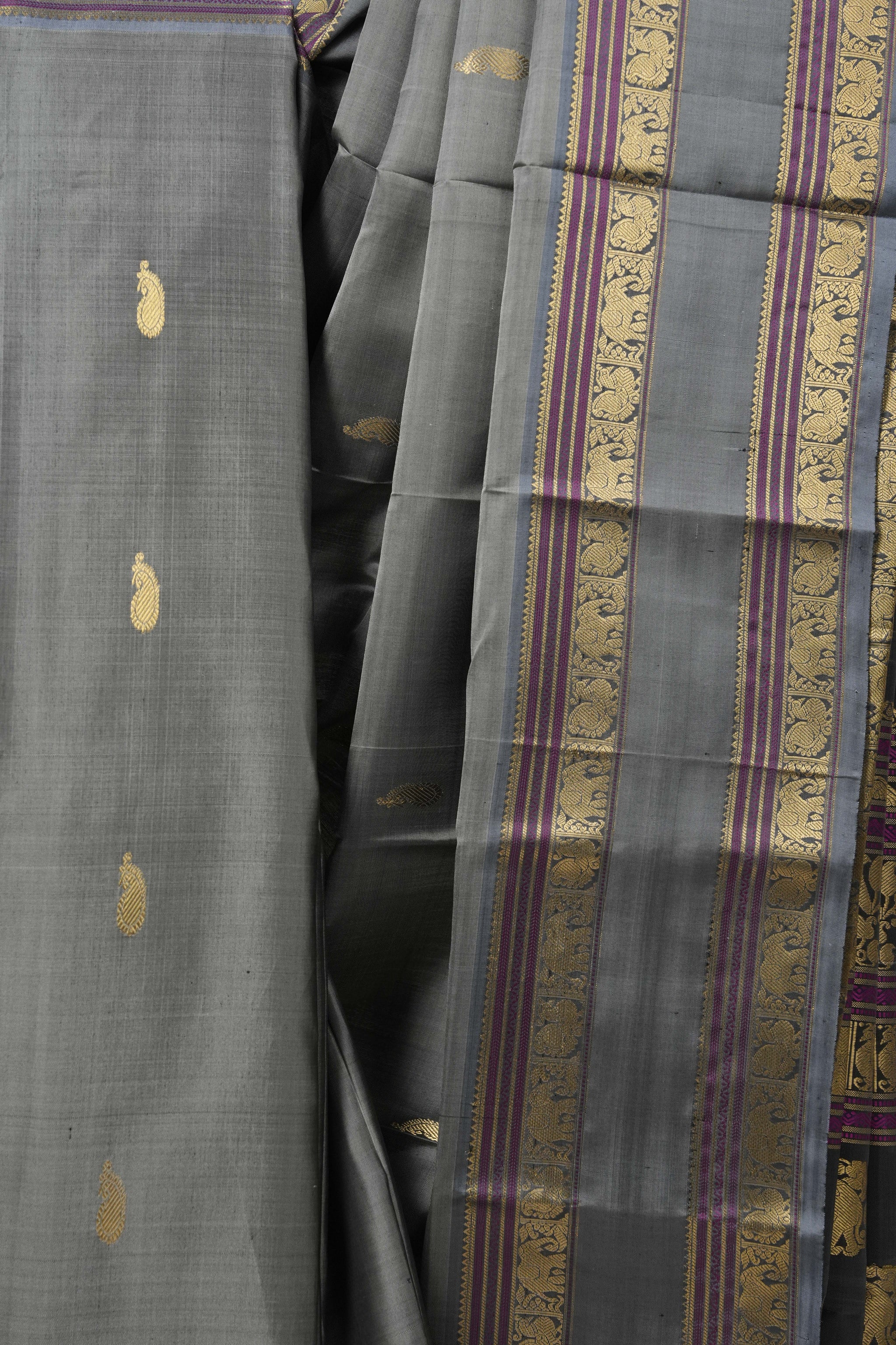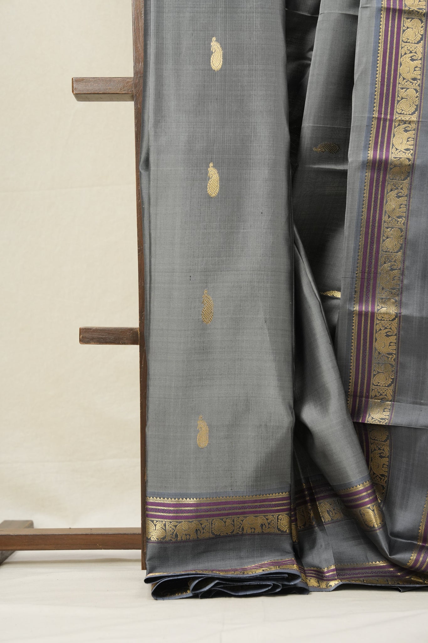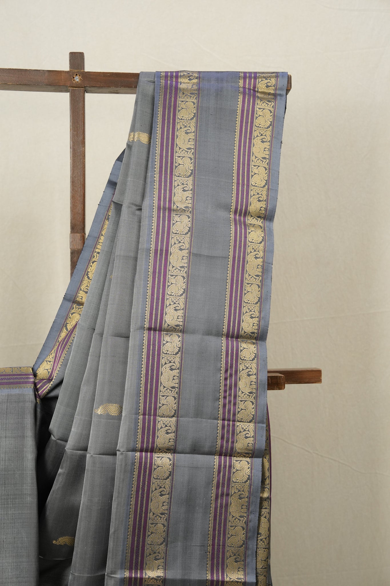 Work - The grey Kanjeevaram silk saree features small gold woven motifs on the body and a contrasting border with gold zari work and purple accents.