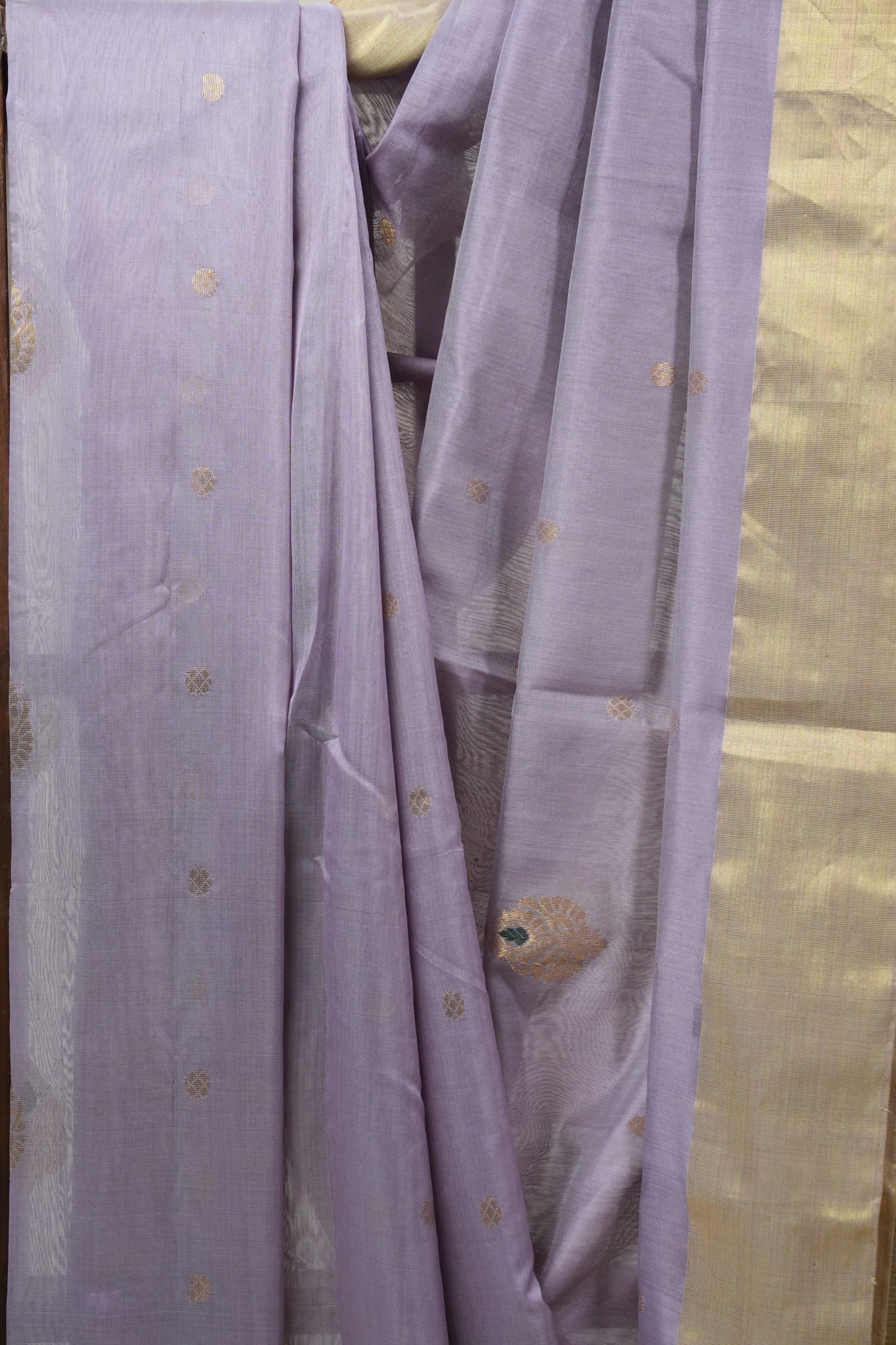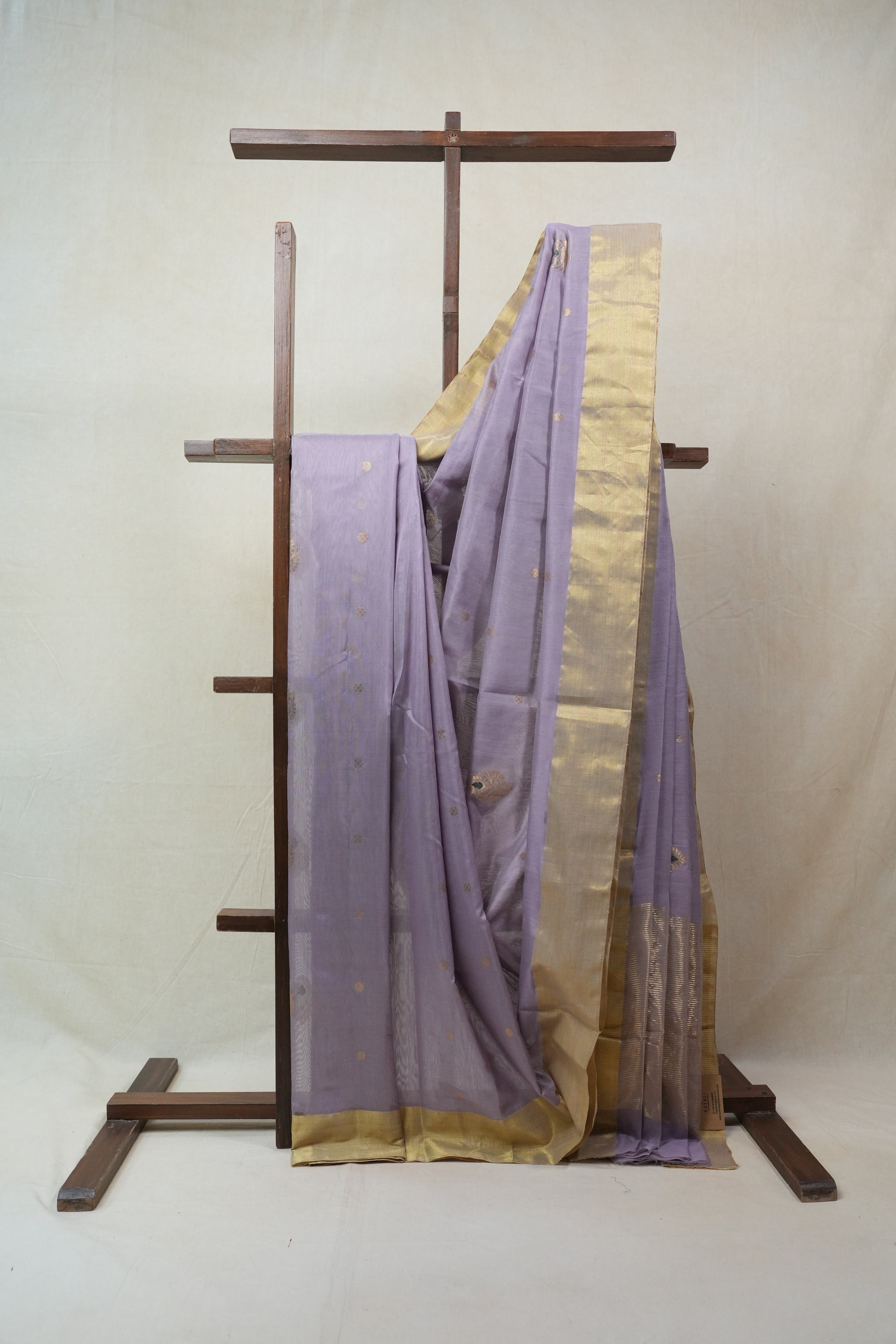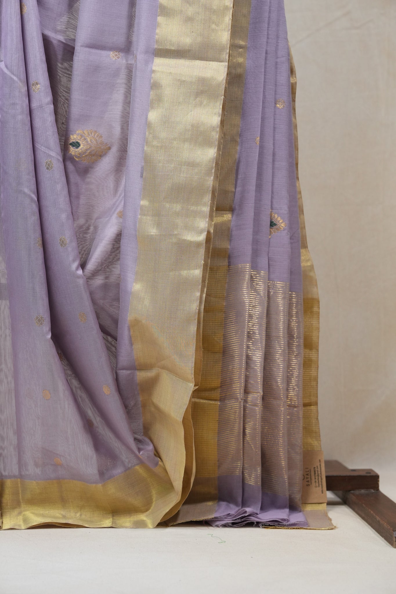 Work - Chanderi cotton silk saree with lavender body, golden buti motifs, and elegant zari border.