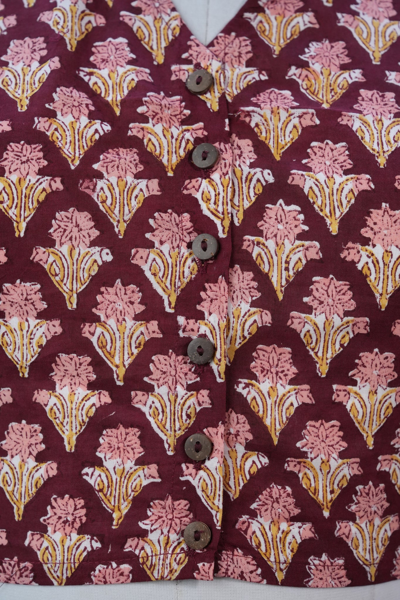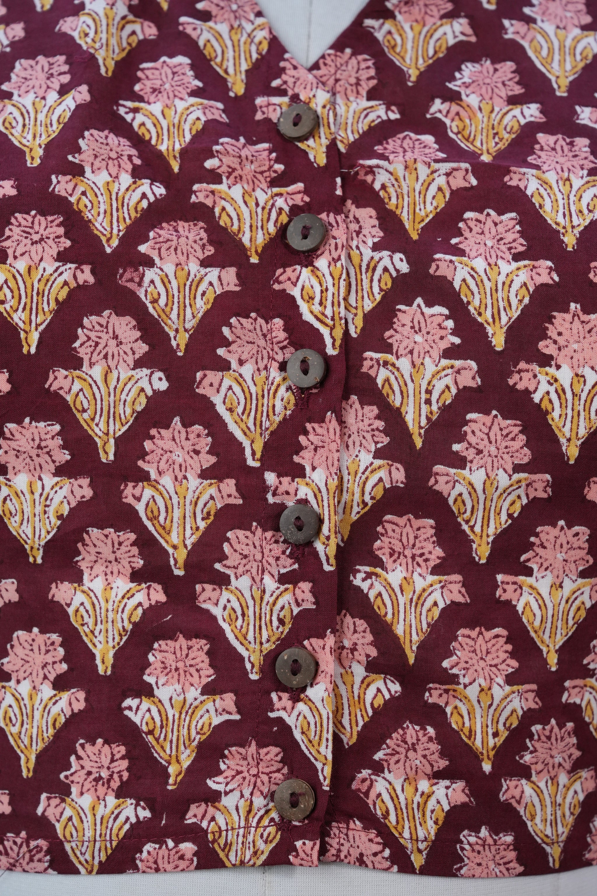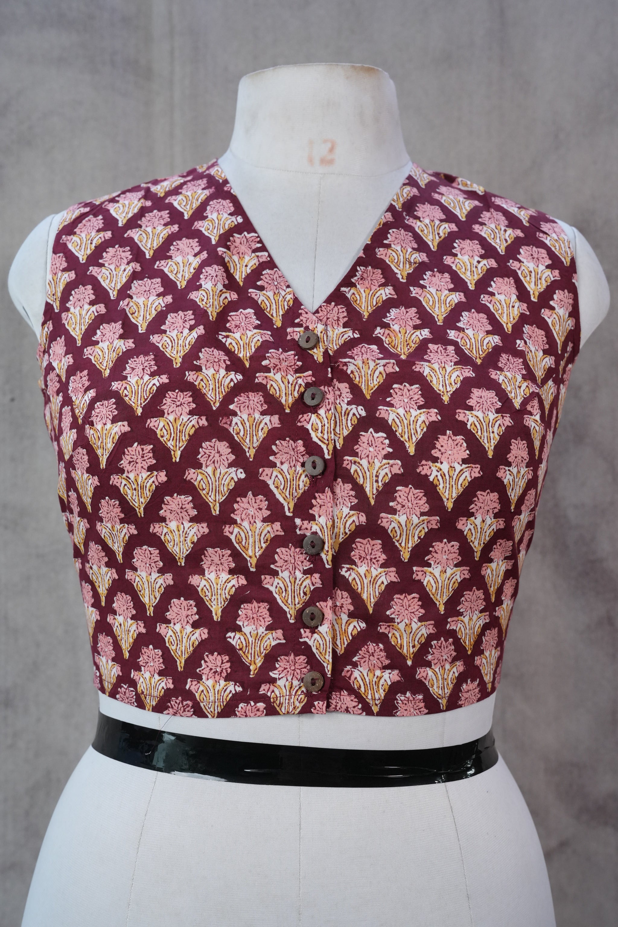 Sleeveless cotton blouse with hand block floral print in pink and mustard on a maroon base. Features a V-neck, front wooden buttons, and fitted waist with darts. Ideal for sarees and ethnic wear.