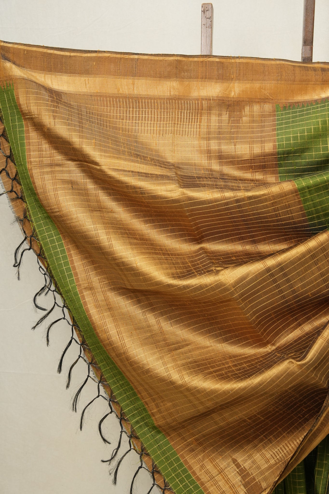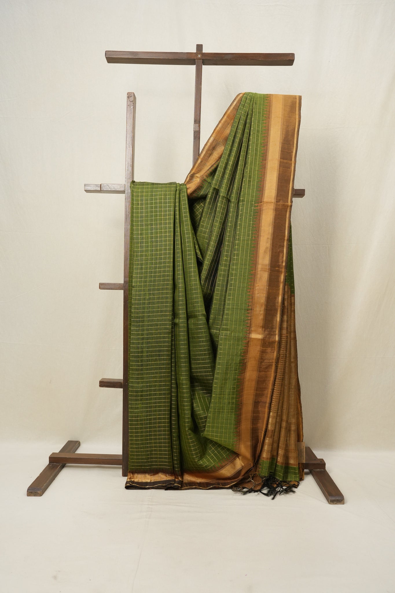Work - Mehendi green raw silk with a traditional checked pattern on the body and broad golden borders.