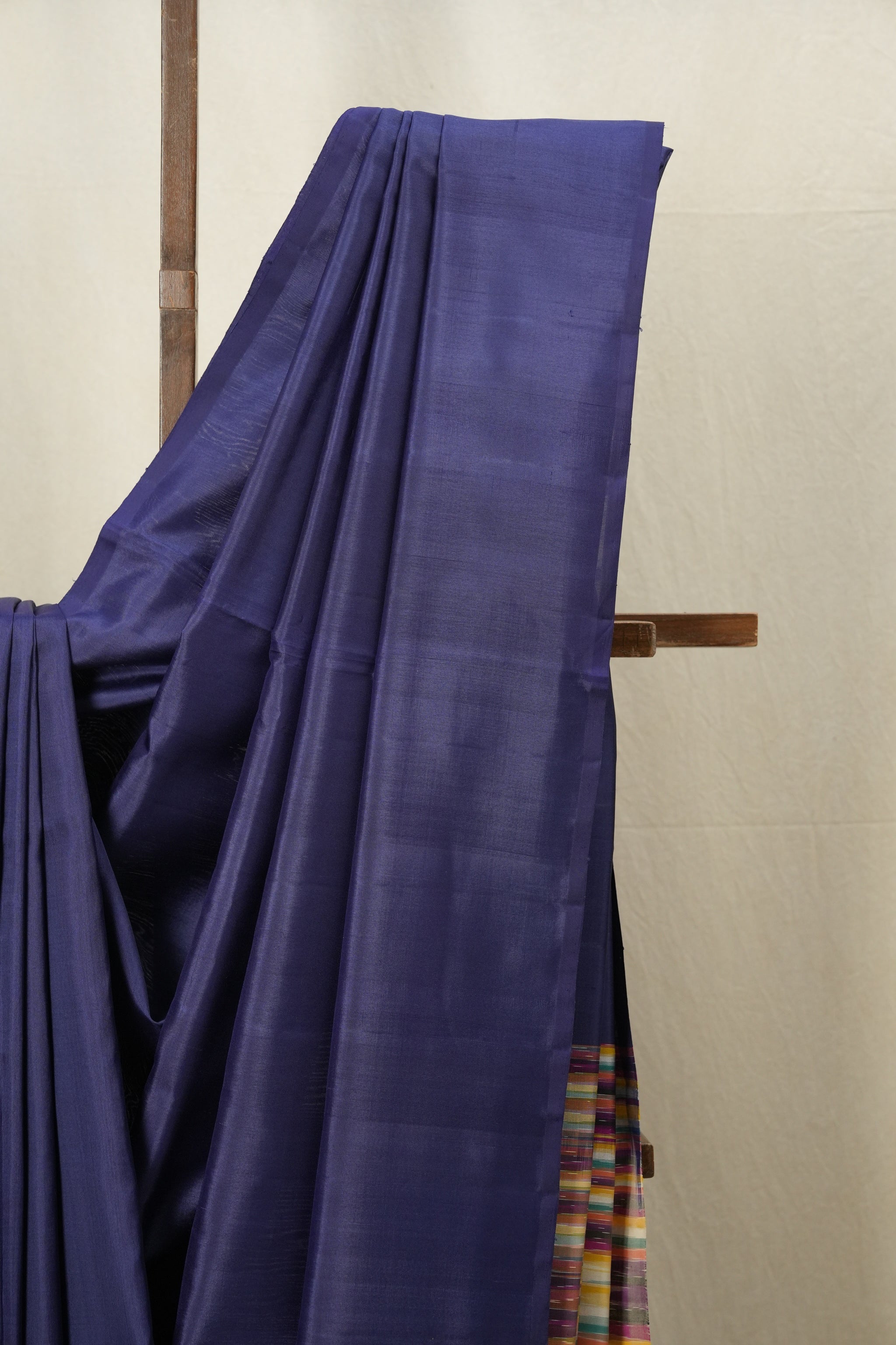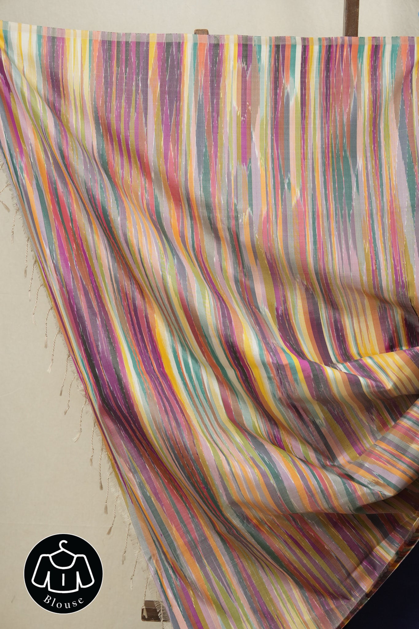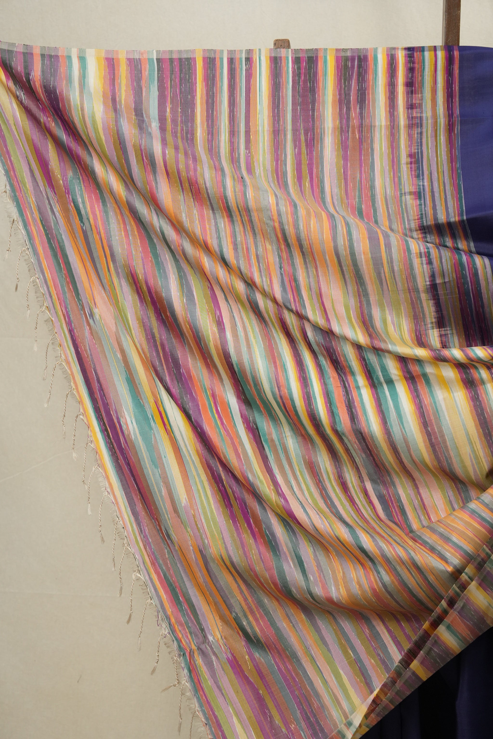 Work - The saree features a plain navy blue body contrasted by a multi-striped pallu with vibrant shades of pink, yellow, blue, and grey.