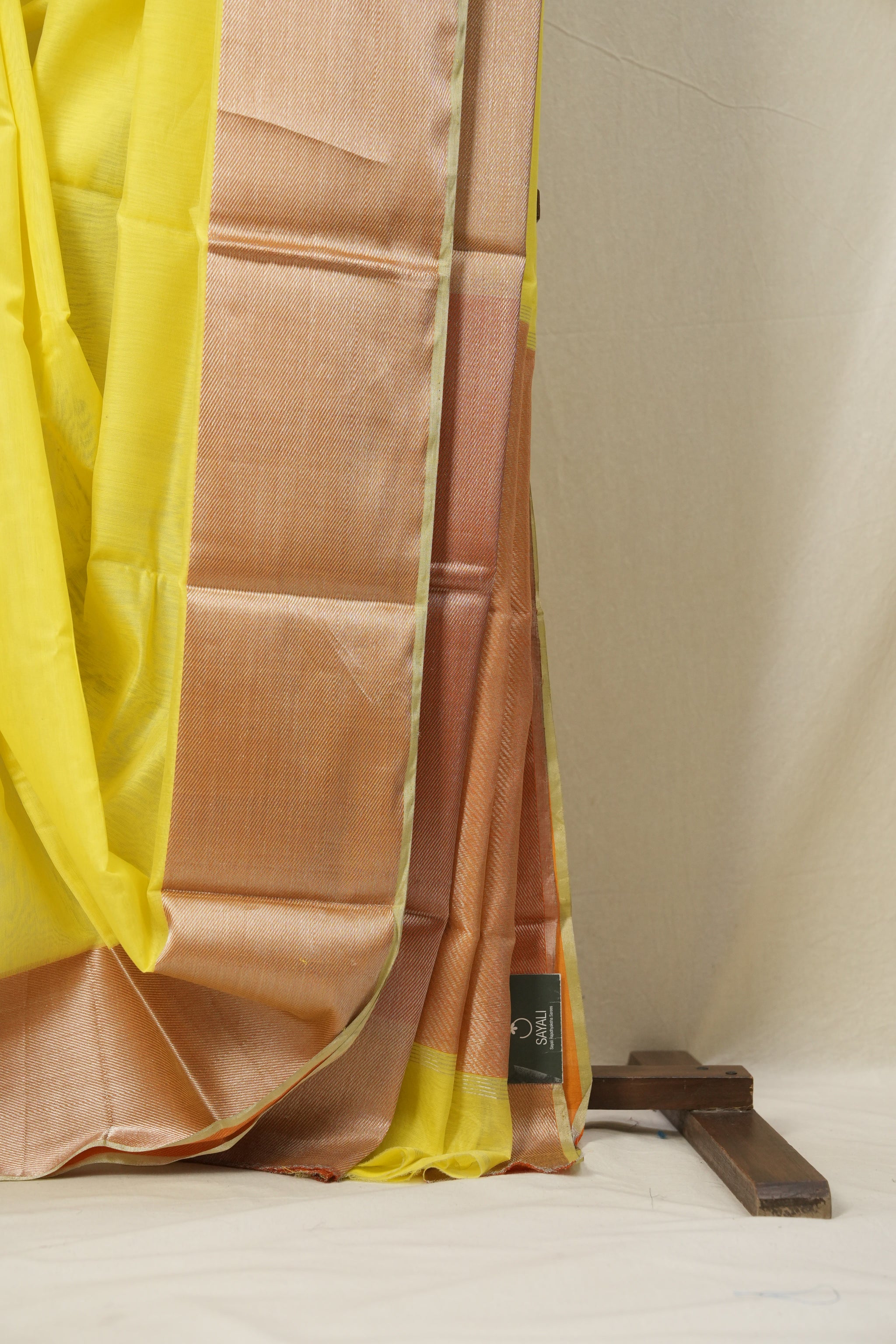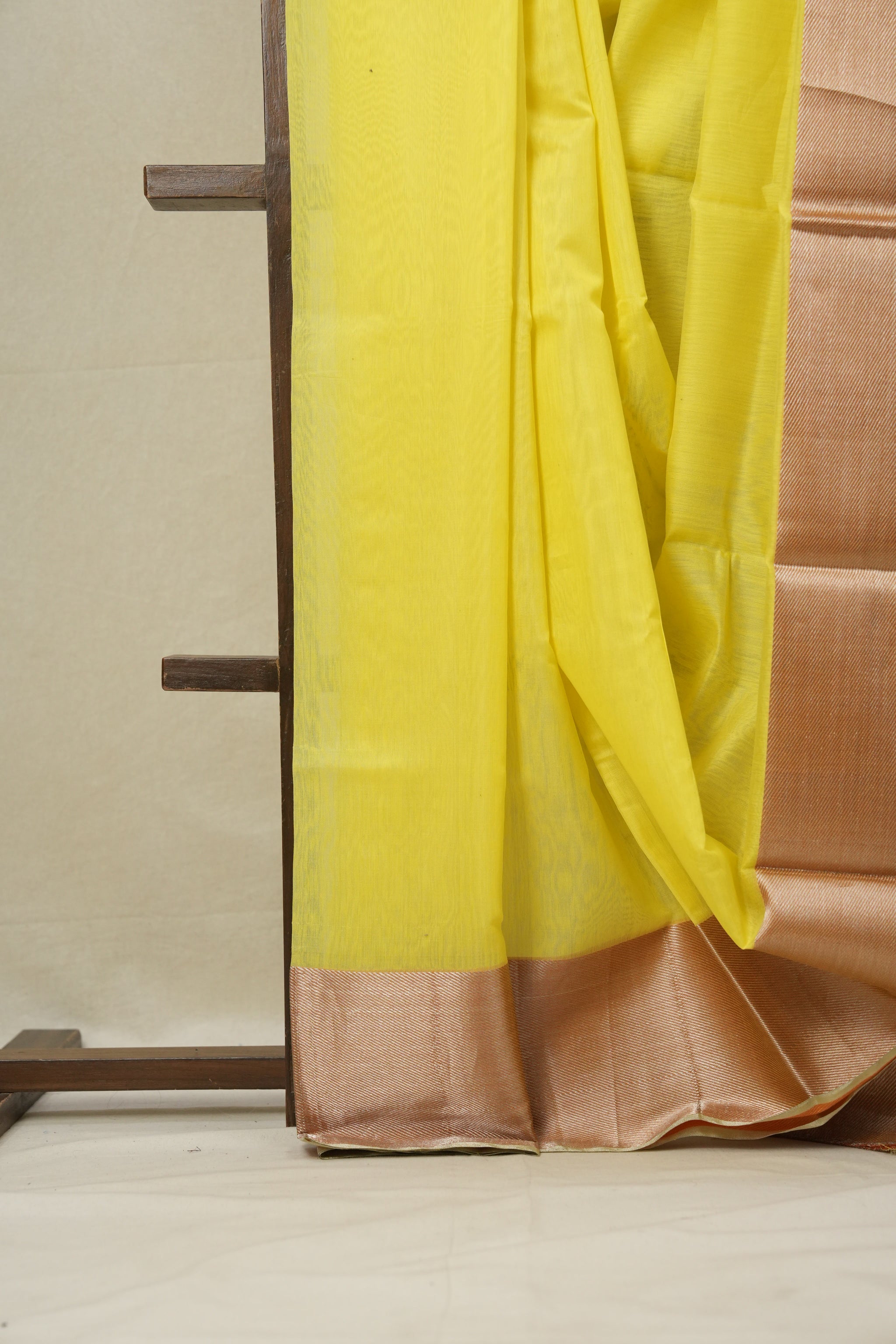 Work - The Neon Yellow Chanderi silk saree features a plain body with a contrasting copper-toned border and pallu..
