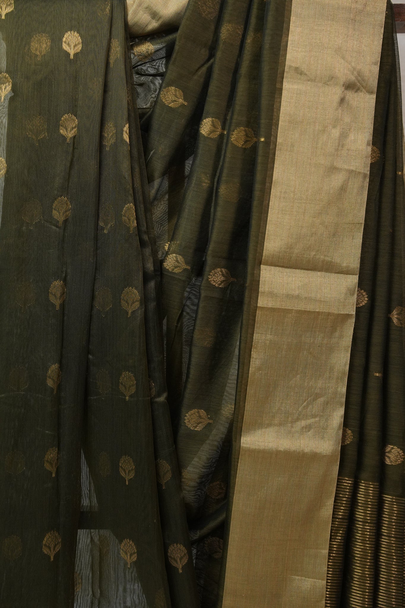 Work - Chanderi cotton silk saree with olive green body, golden buti motifs, and elegant zari border.