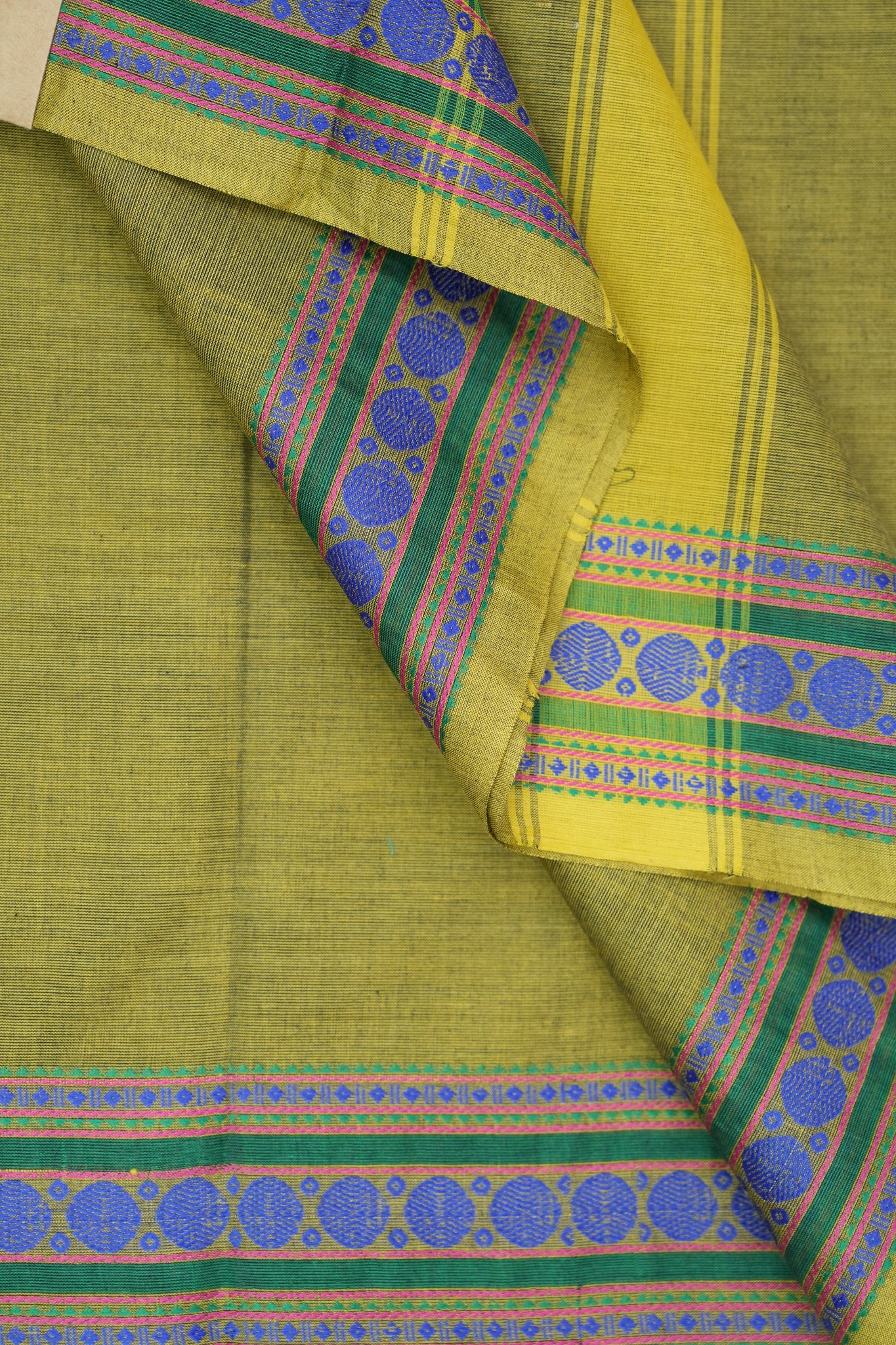 Work - This olive green saree features a vibrant multi-striped border woven with intricate blue circular motifs, complemented by green and pink accents.