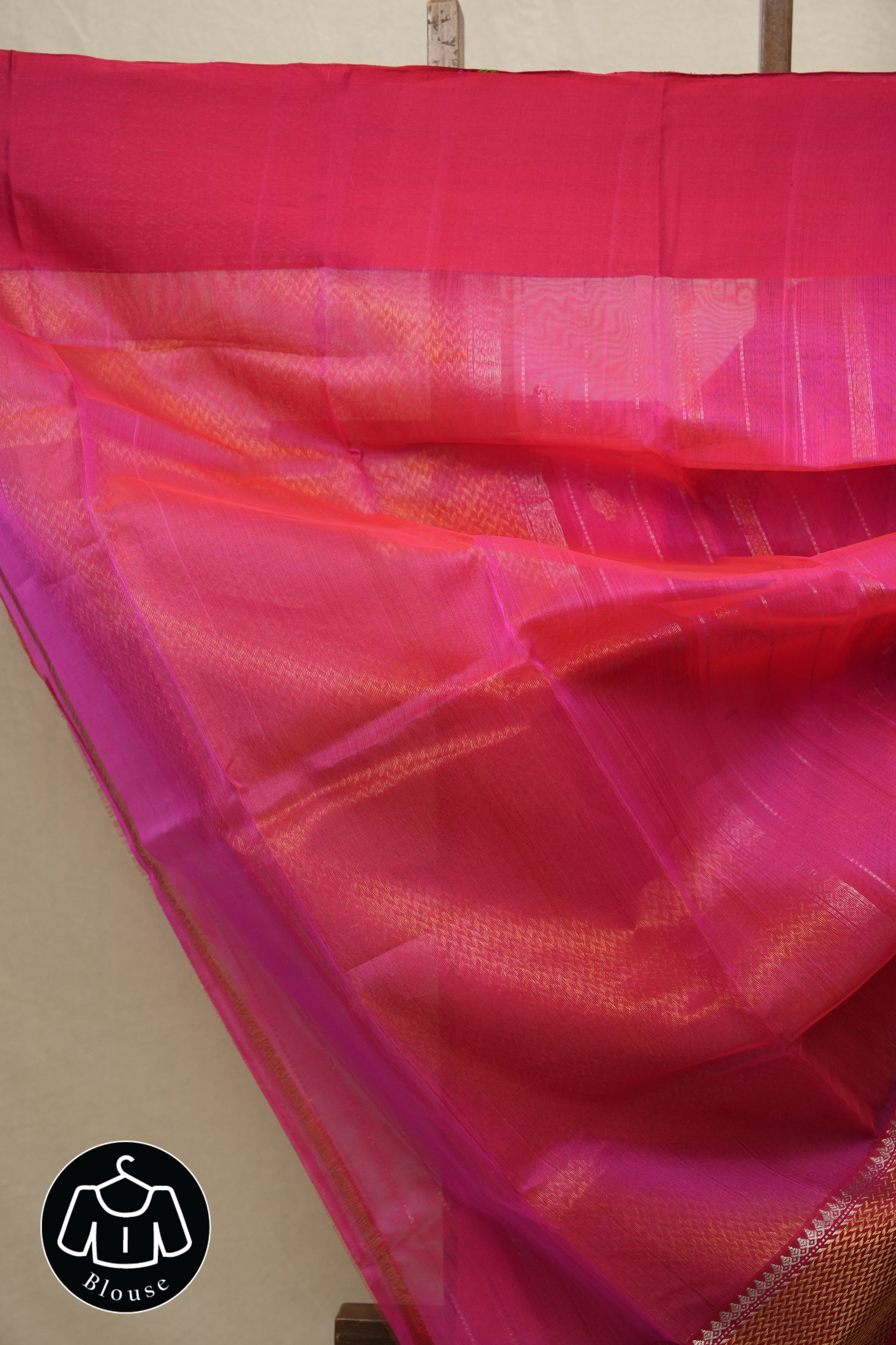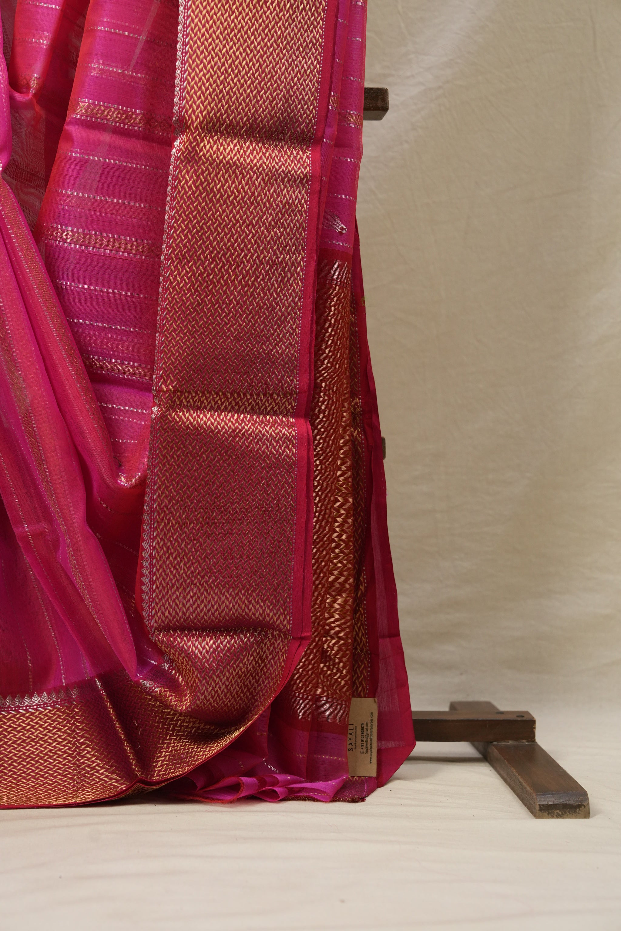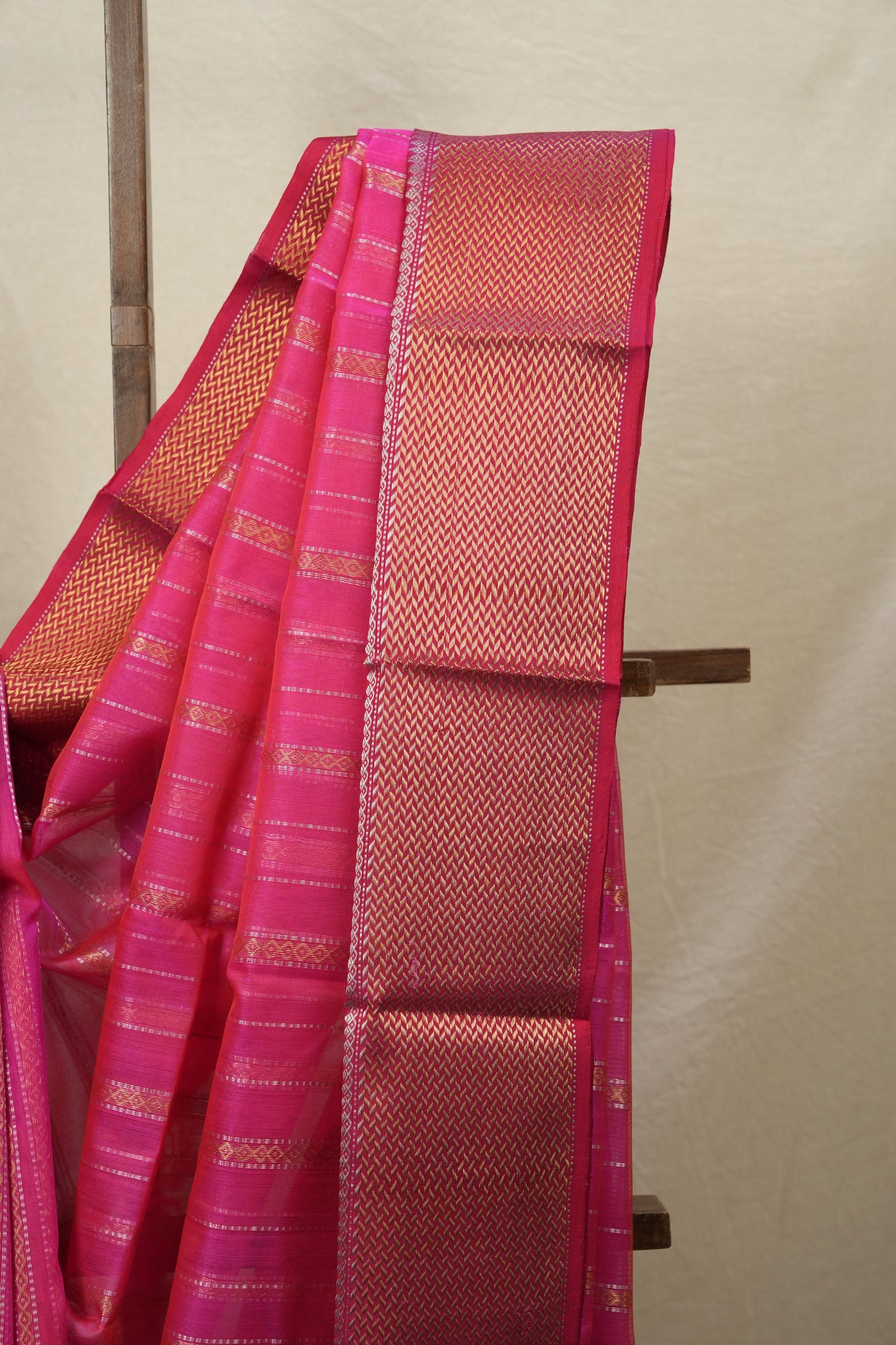 Work - The vibrant pink Chanderi silk body features fine woven silver and gold zari stripes. The border is a rich gold zari with a woven geometric pattern.