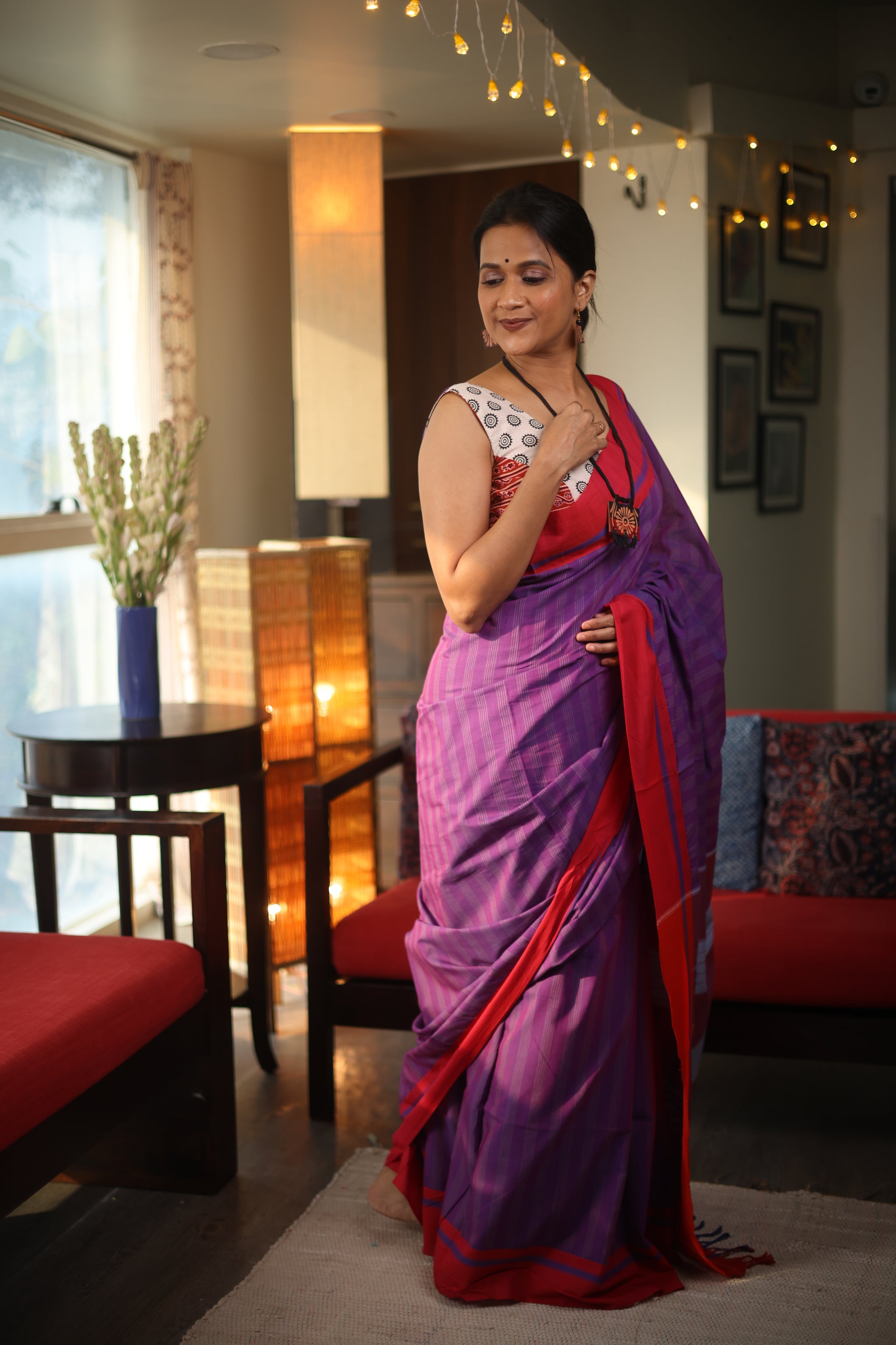 Work - The saree has a striped body with a contrasting plain border and a striped pallu featuring geometric patterns.