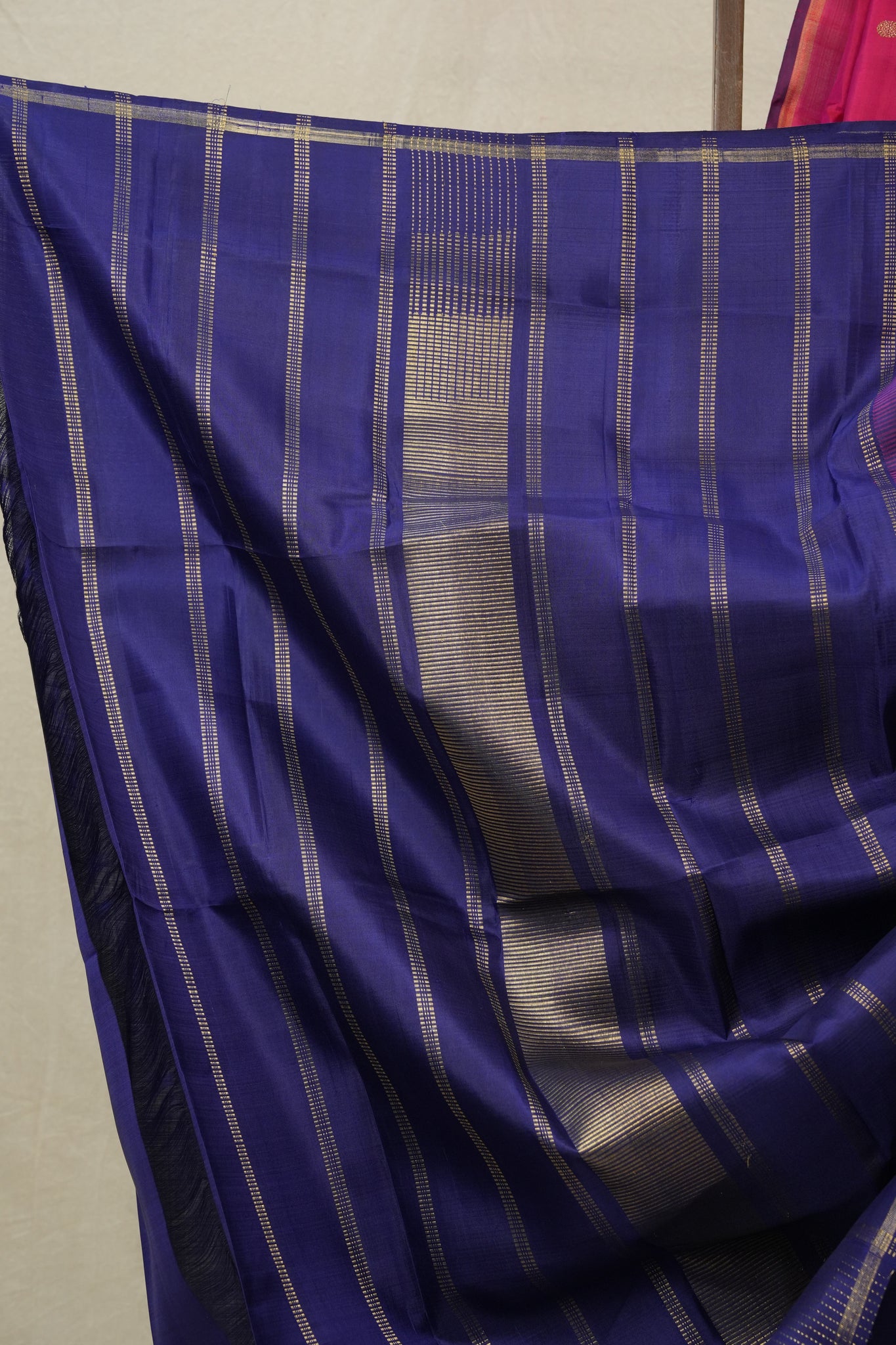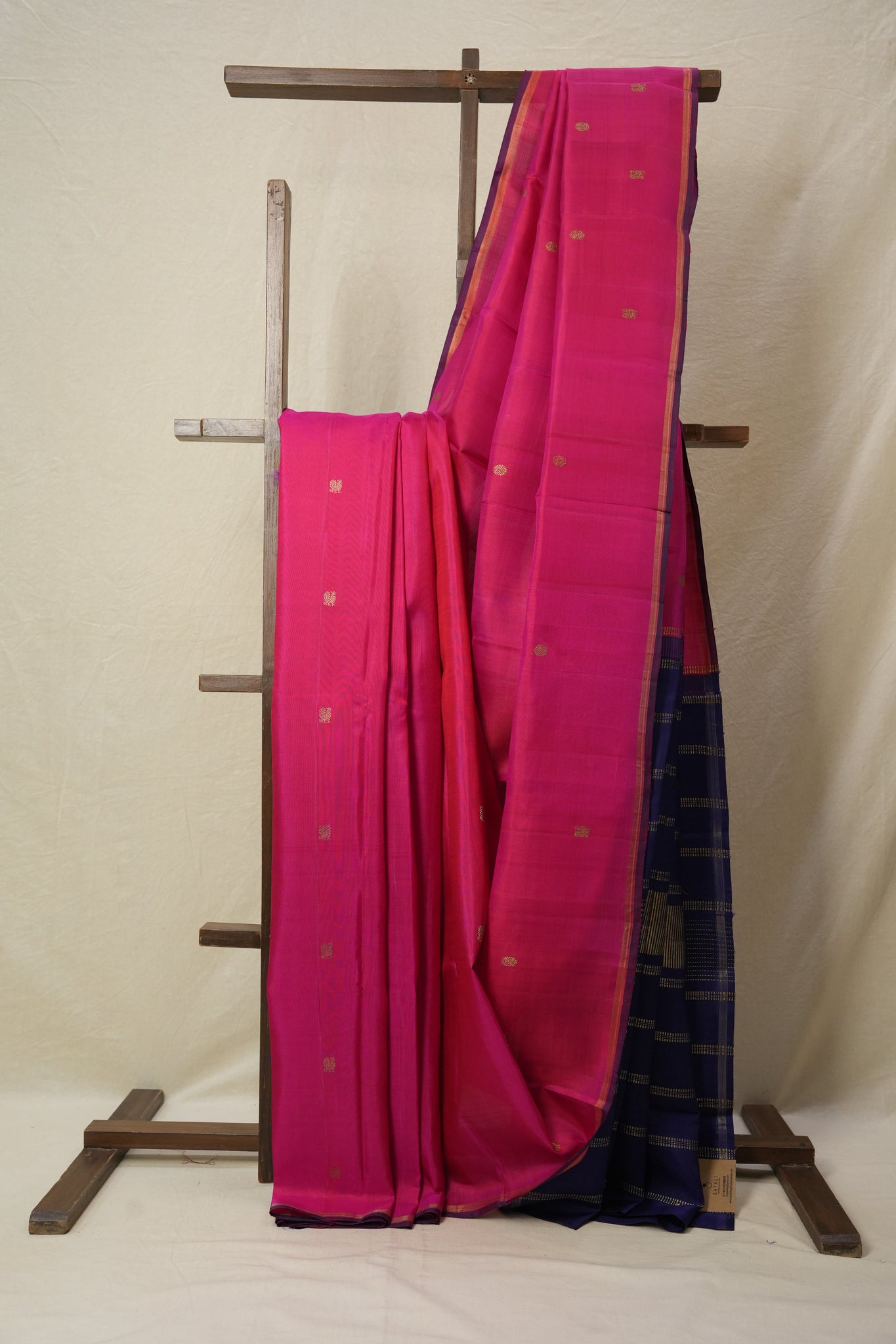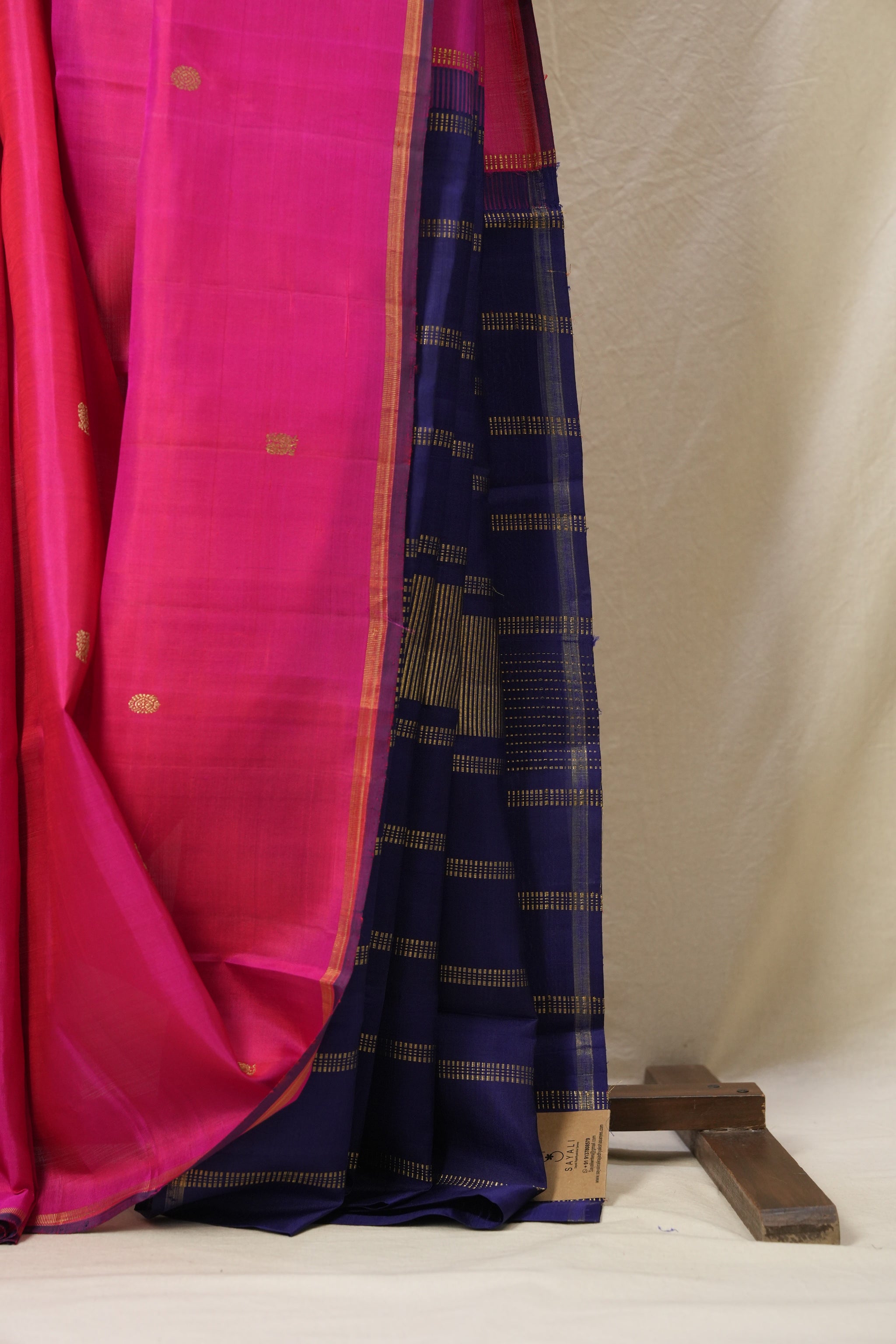 Work - Bright rani pink silk saree with small gold zari buttas and a rich blue pallu featuring gold zari stripes-elegant and festive.