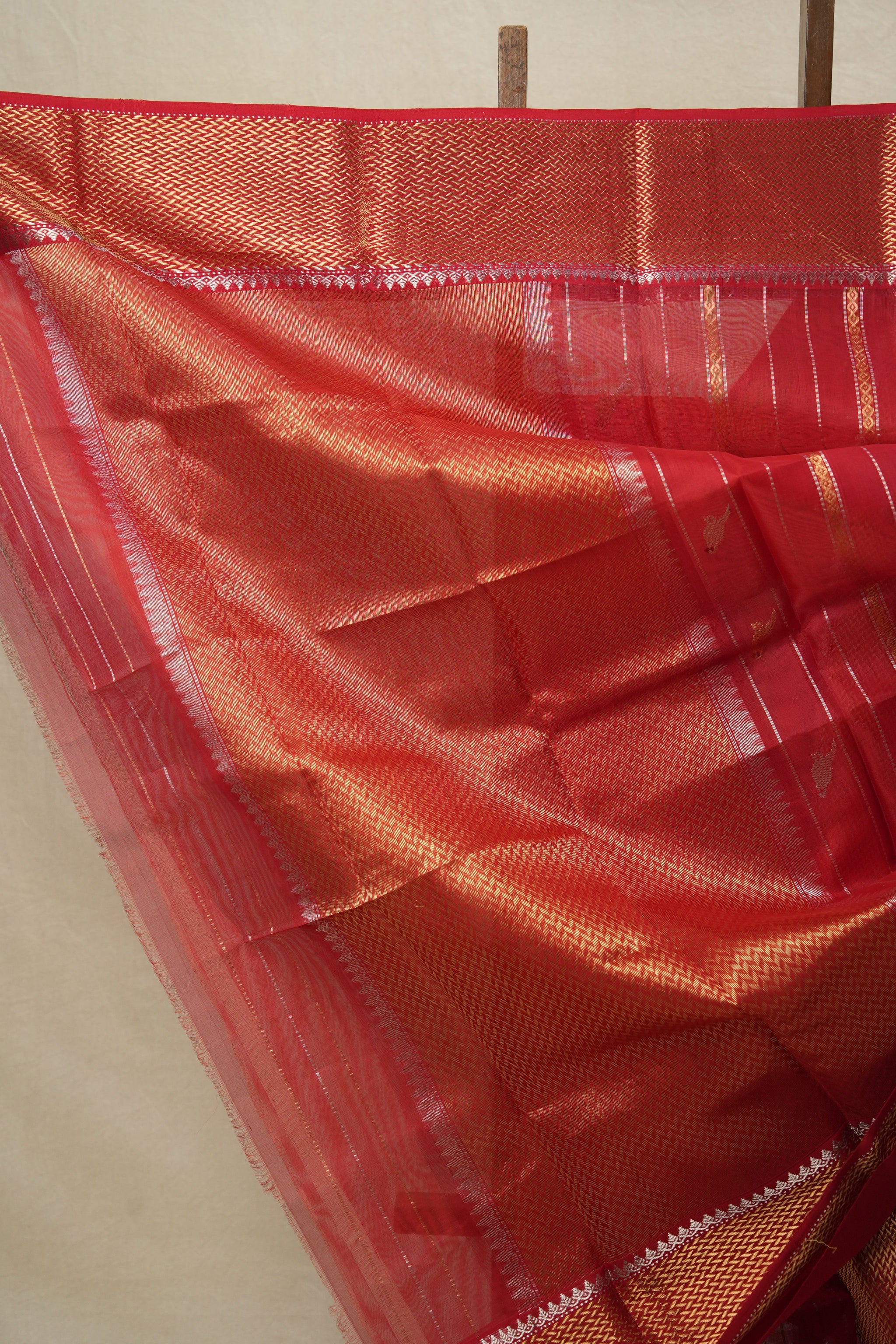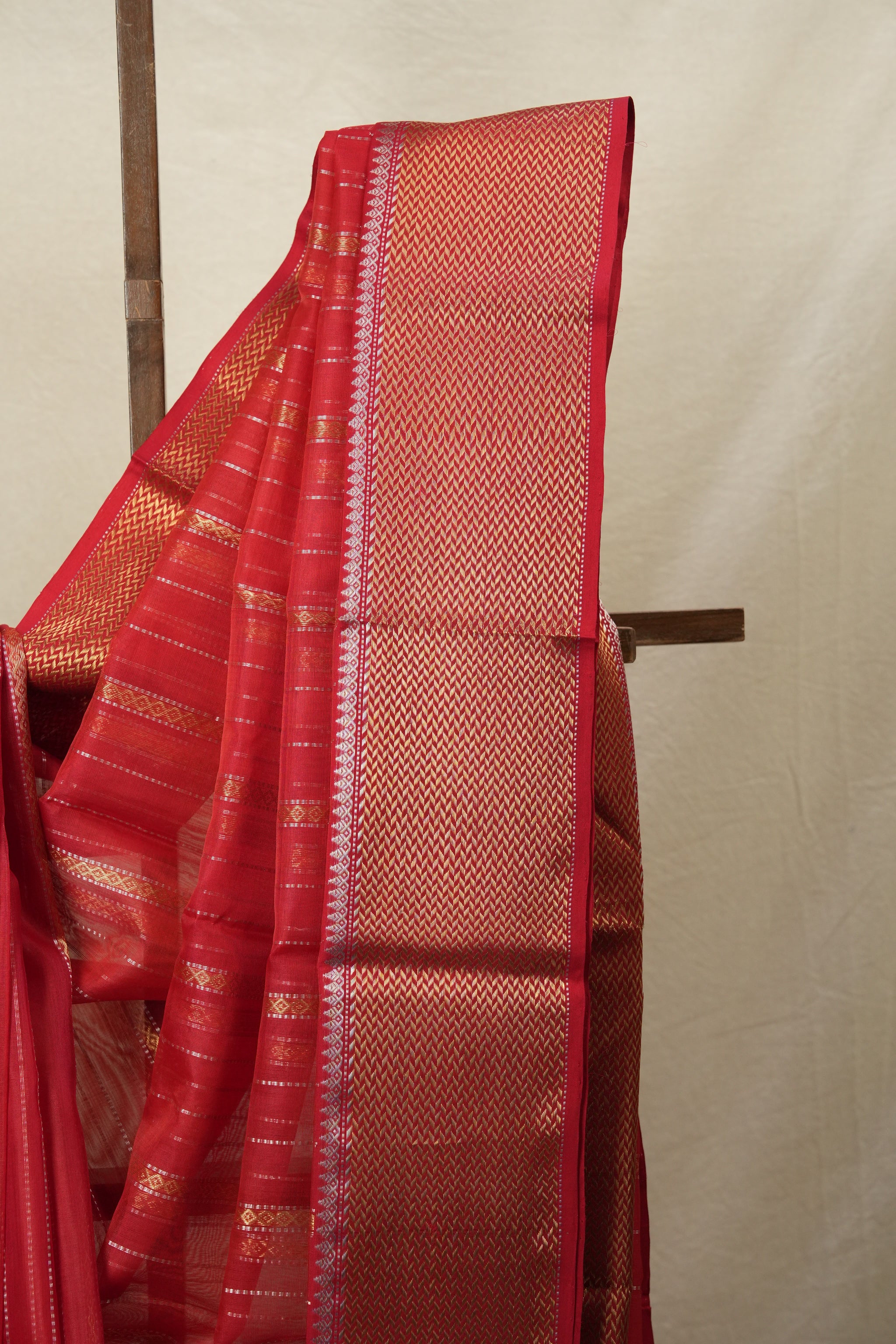 Work - This is a red Chanderi silk saree featuring elegant golden zari stripes across the body, complemented by a traditional golden zari border and a lustrous pallu with intricate weaving.