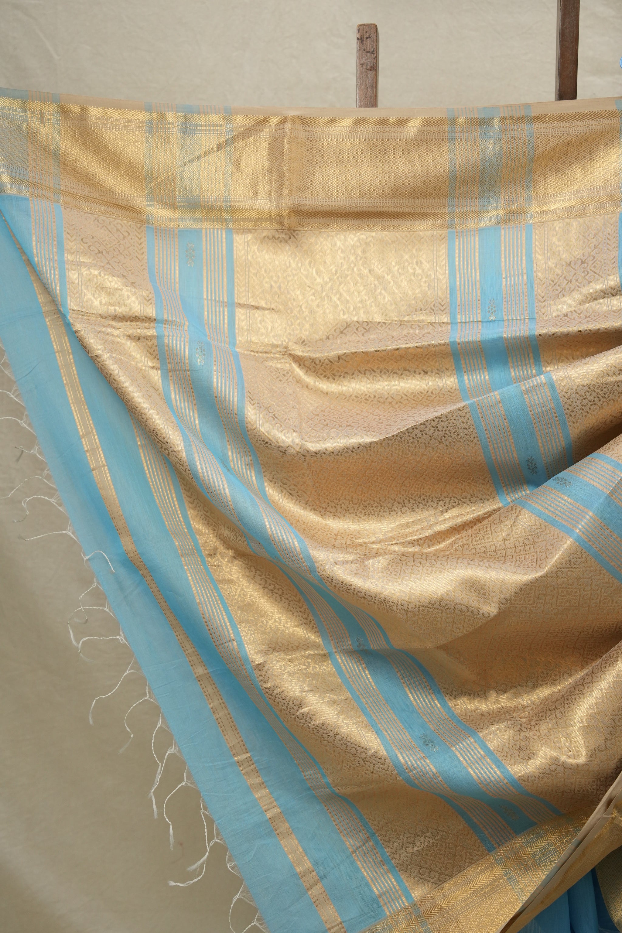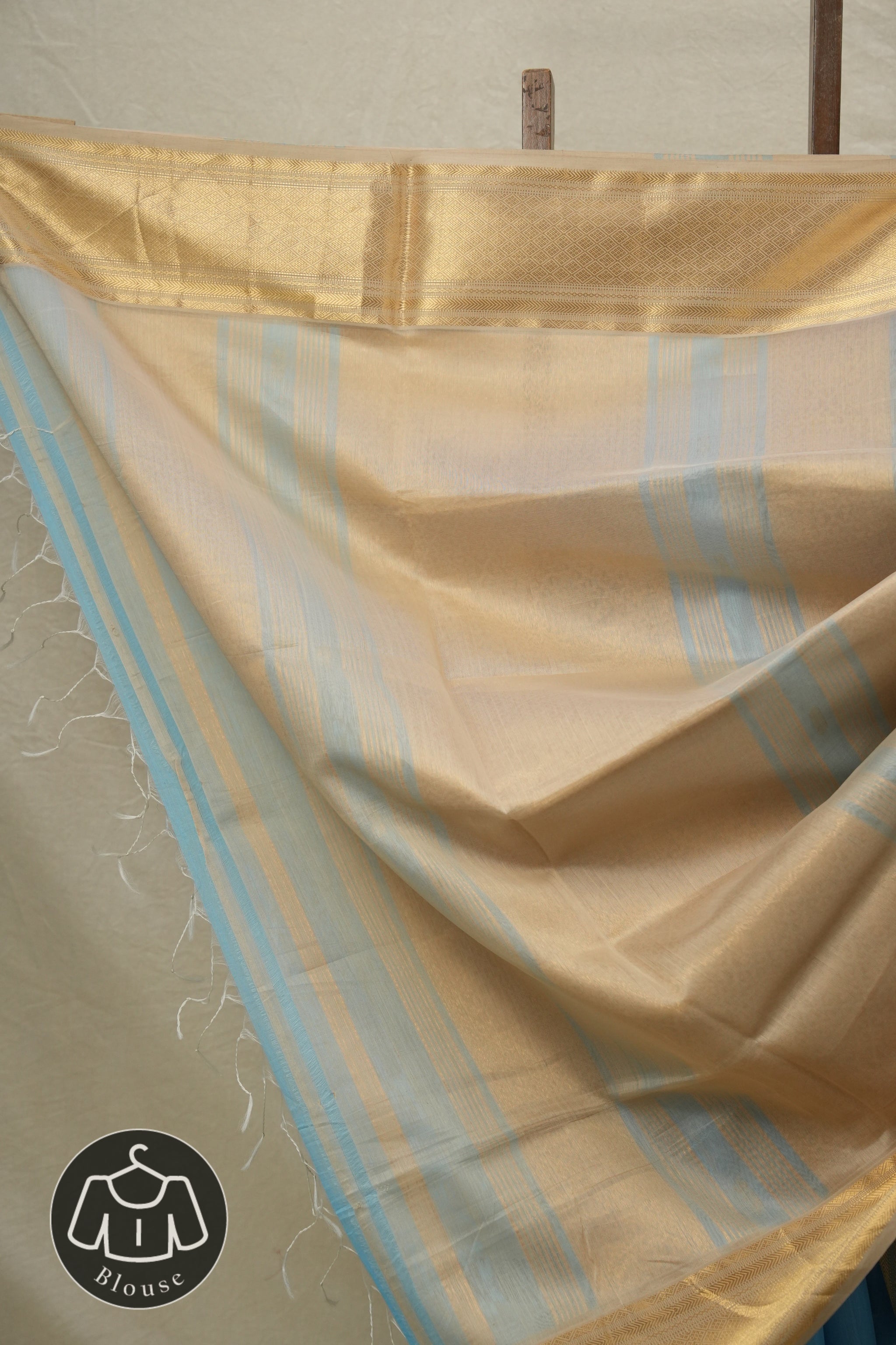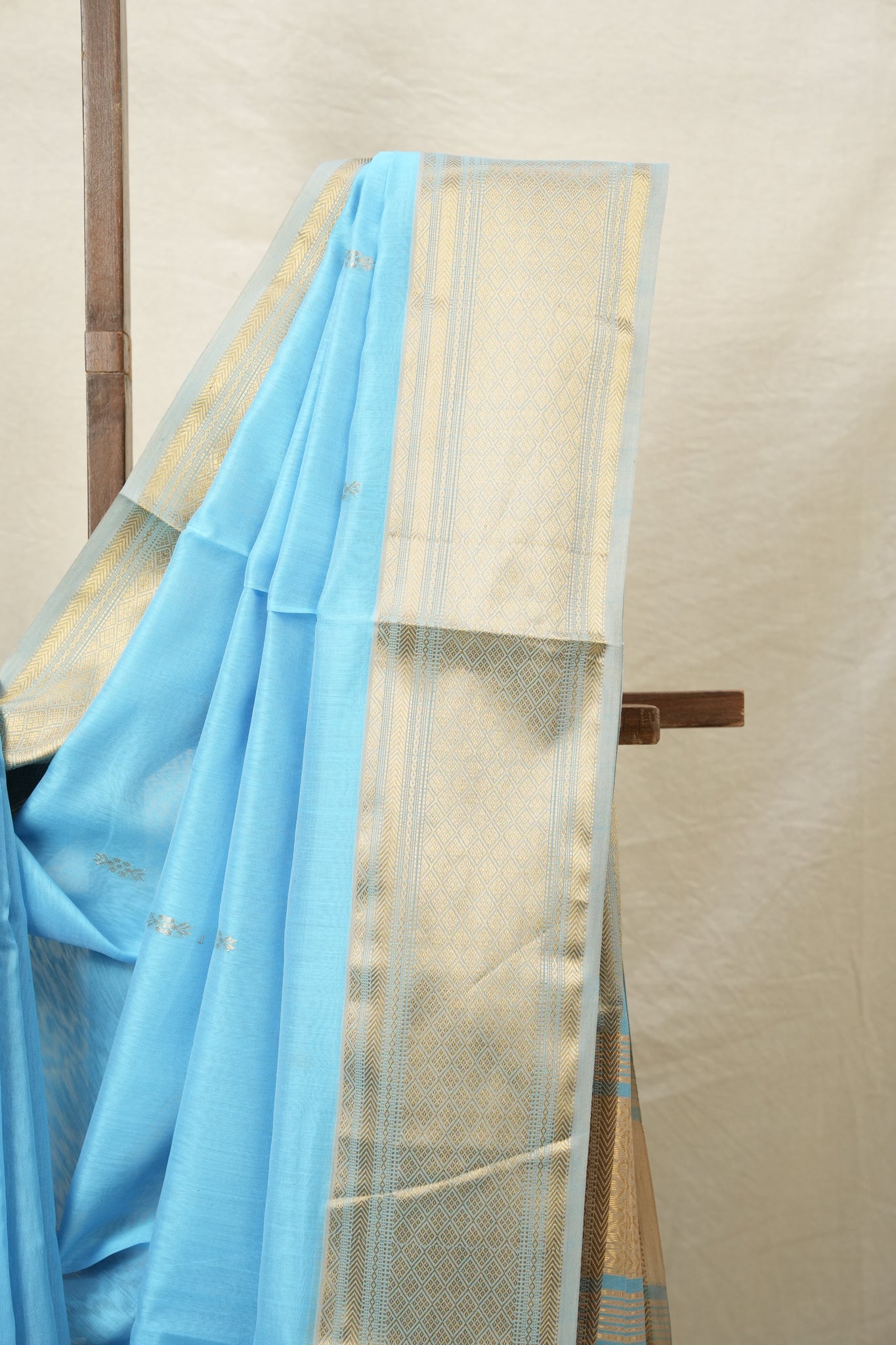 Work - Graceful blue maheshwari saree with a plain body, intricate gold zari border, and richly woven striped pallu with tassels.