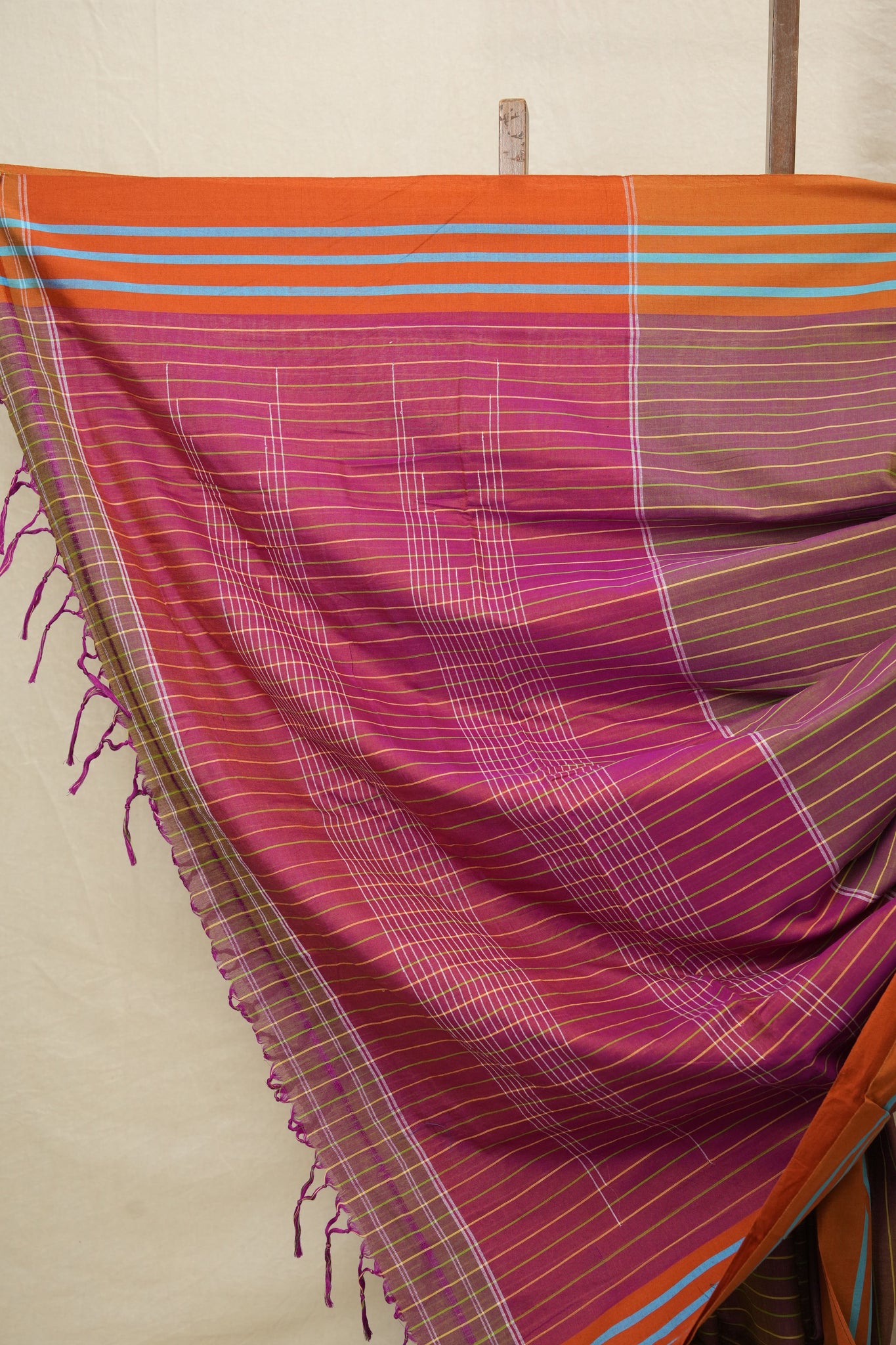 Work - The saree features a checkered body with a contrasting striped pallu and orange borders.
