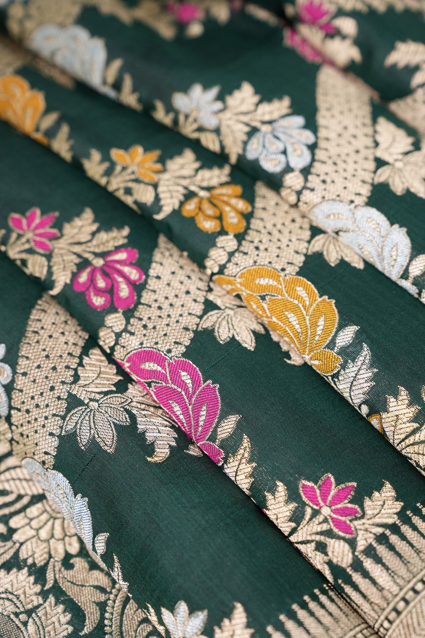 Border – Temple-style border with alternating resham florals framed in detailed gold zari bands