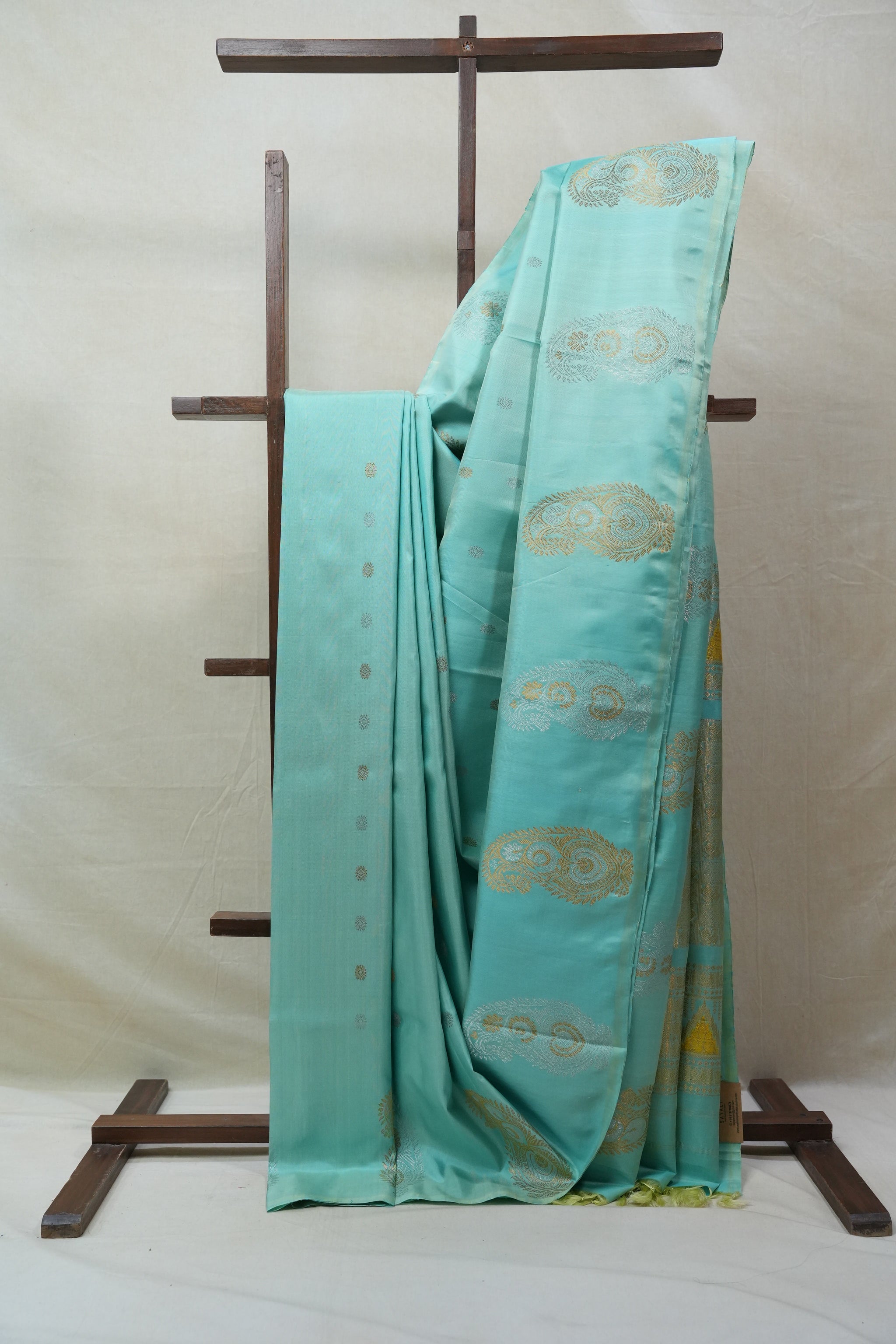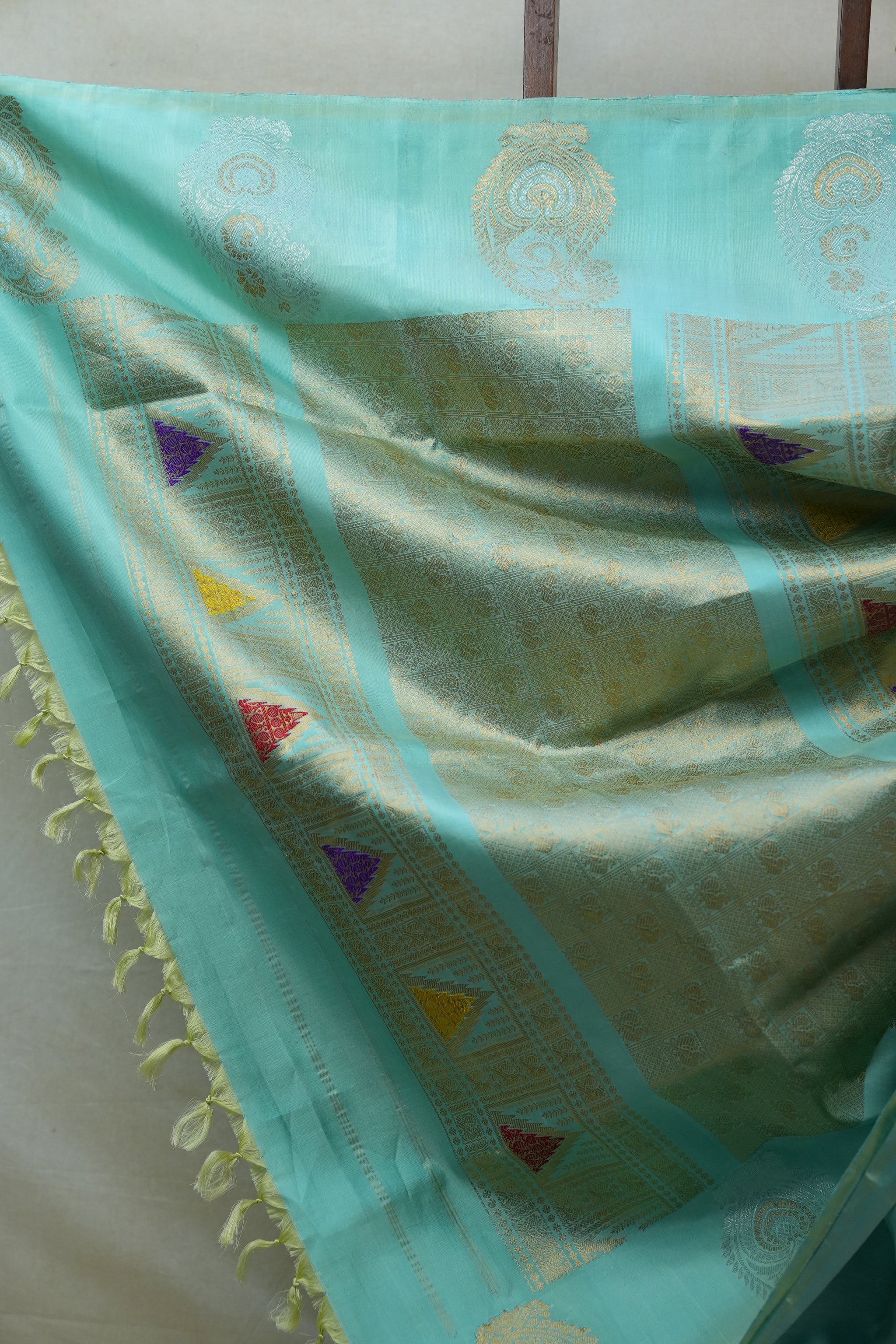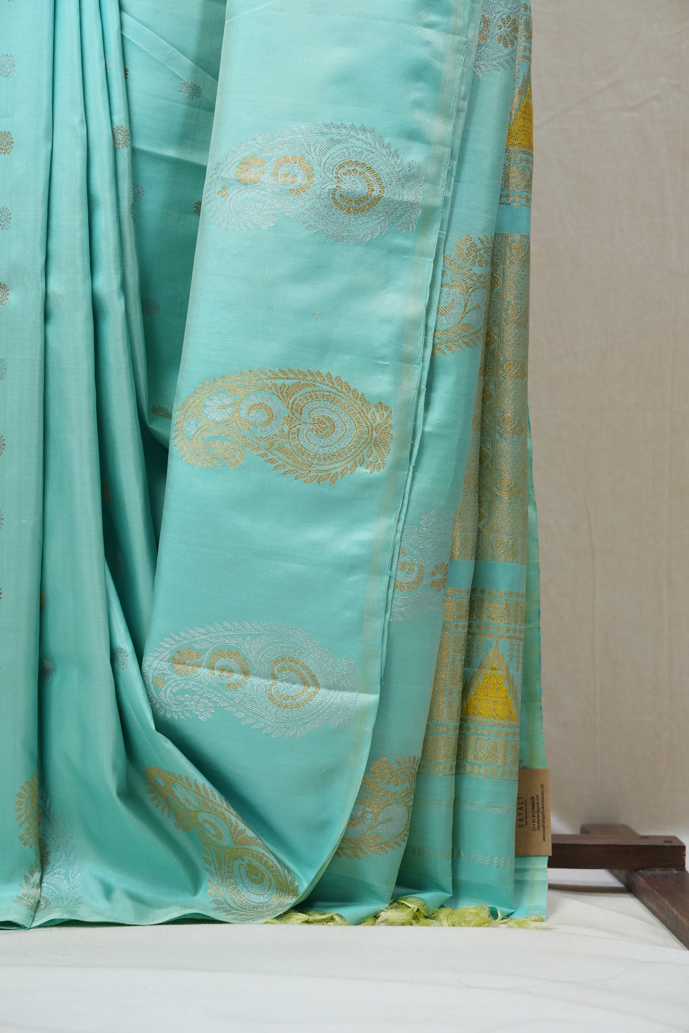 Work - This Gadwal silk saree features a aqua blue plain body adorned with small golden, silver buttas and a aqua blue border with pallu.