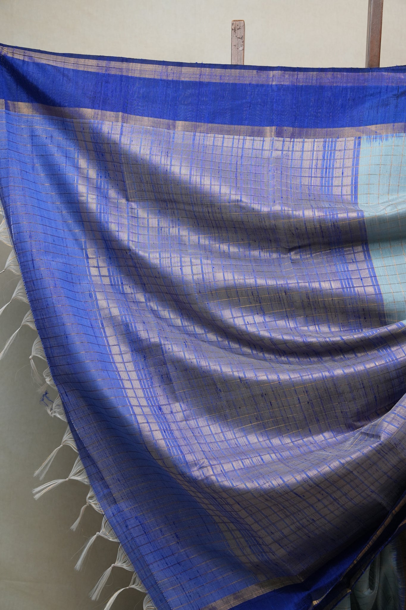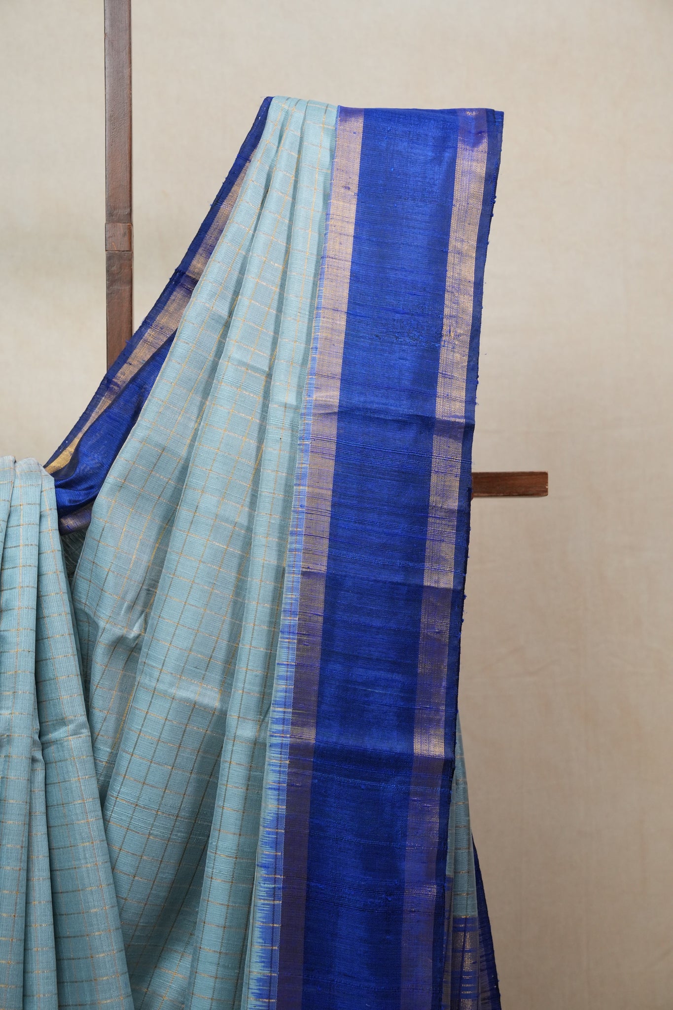Work - Aqua blue raw silk saree with golden checks, contrasted by a blue zari border and rich golden pallu.