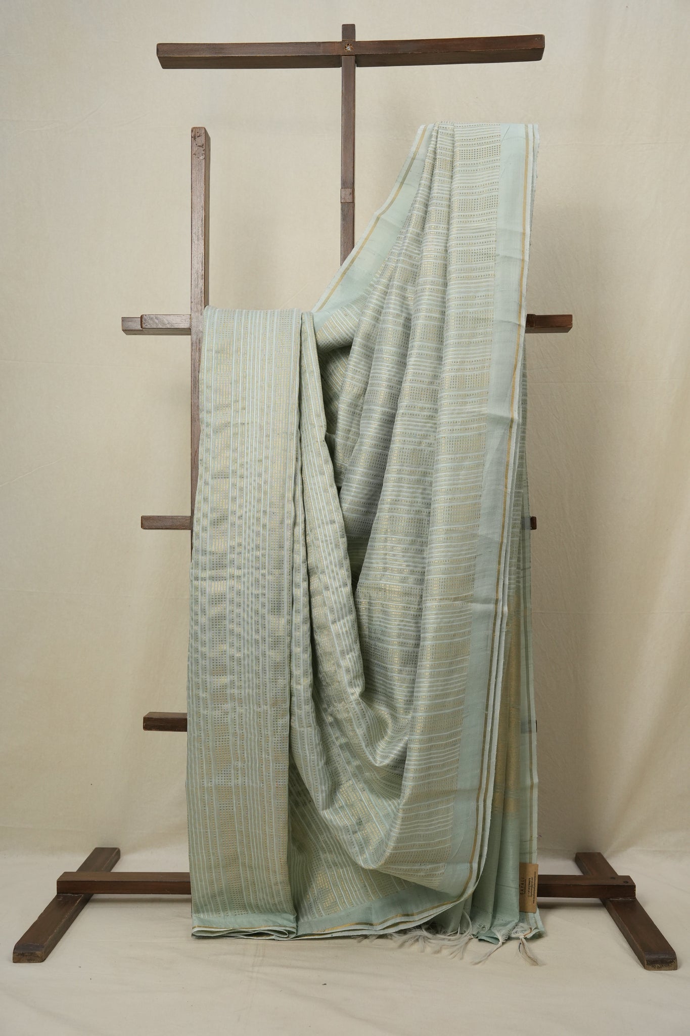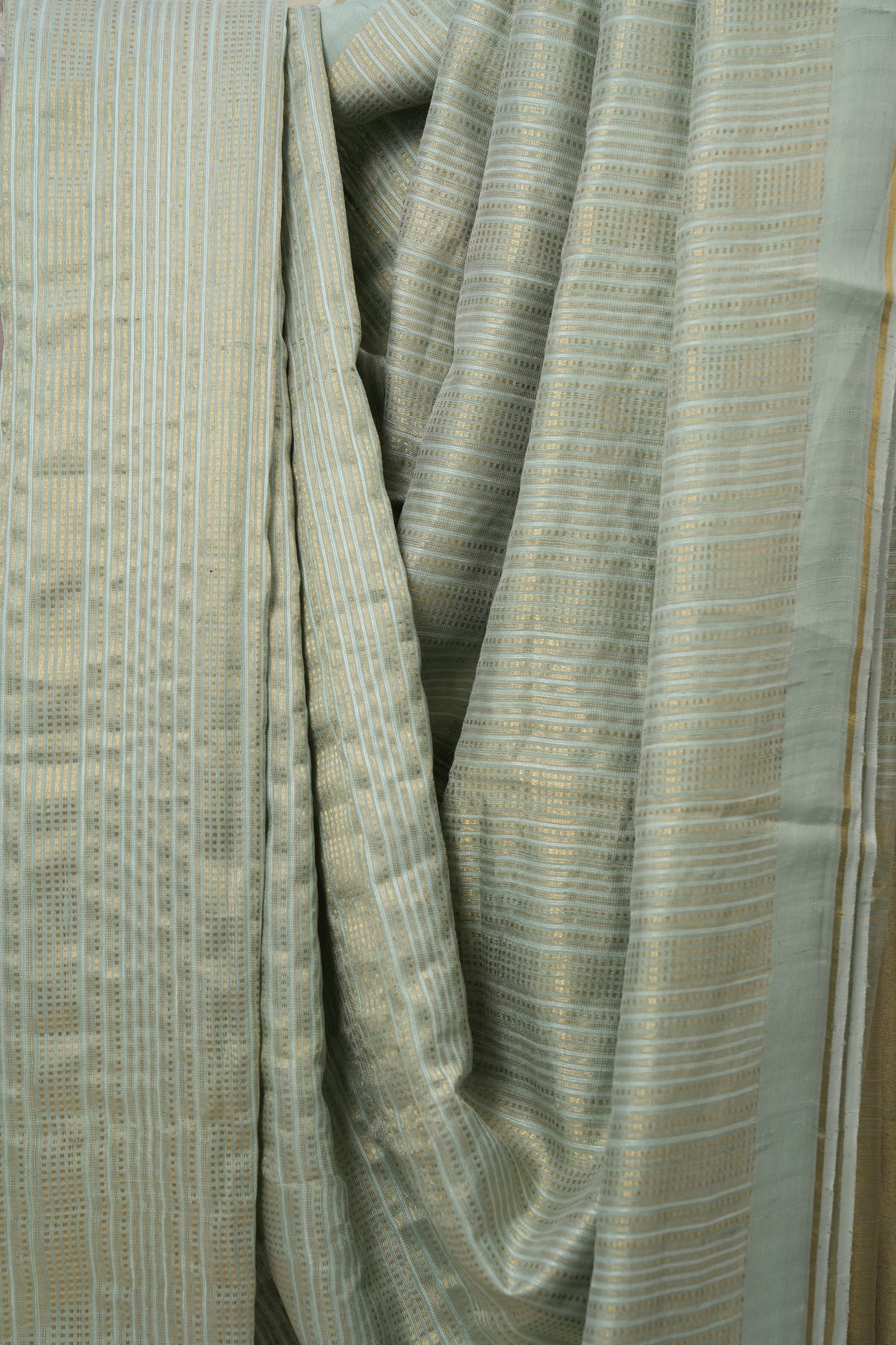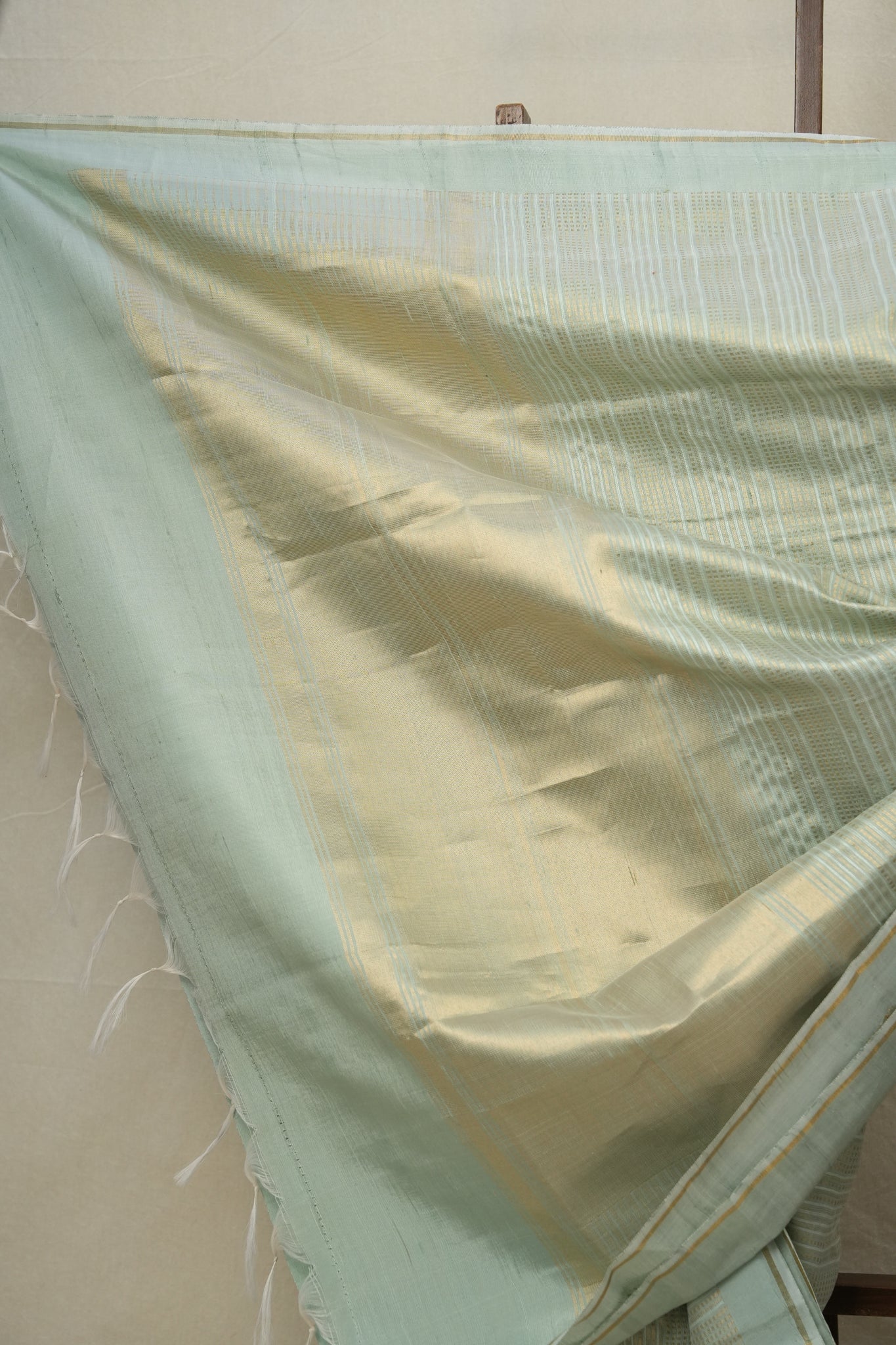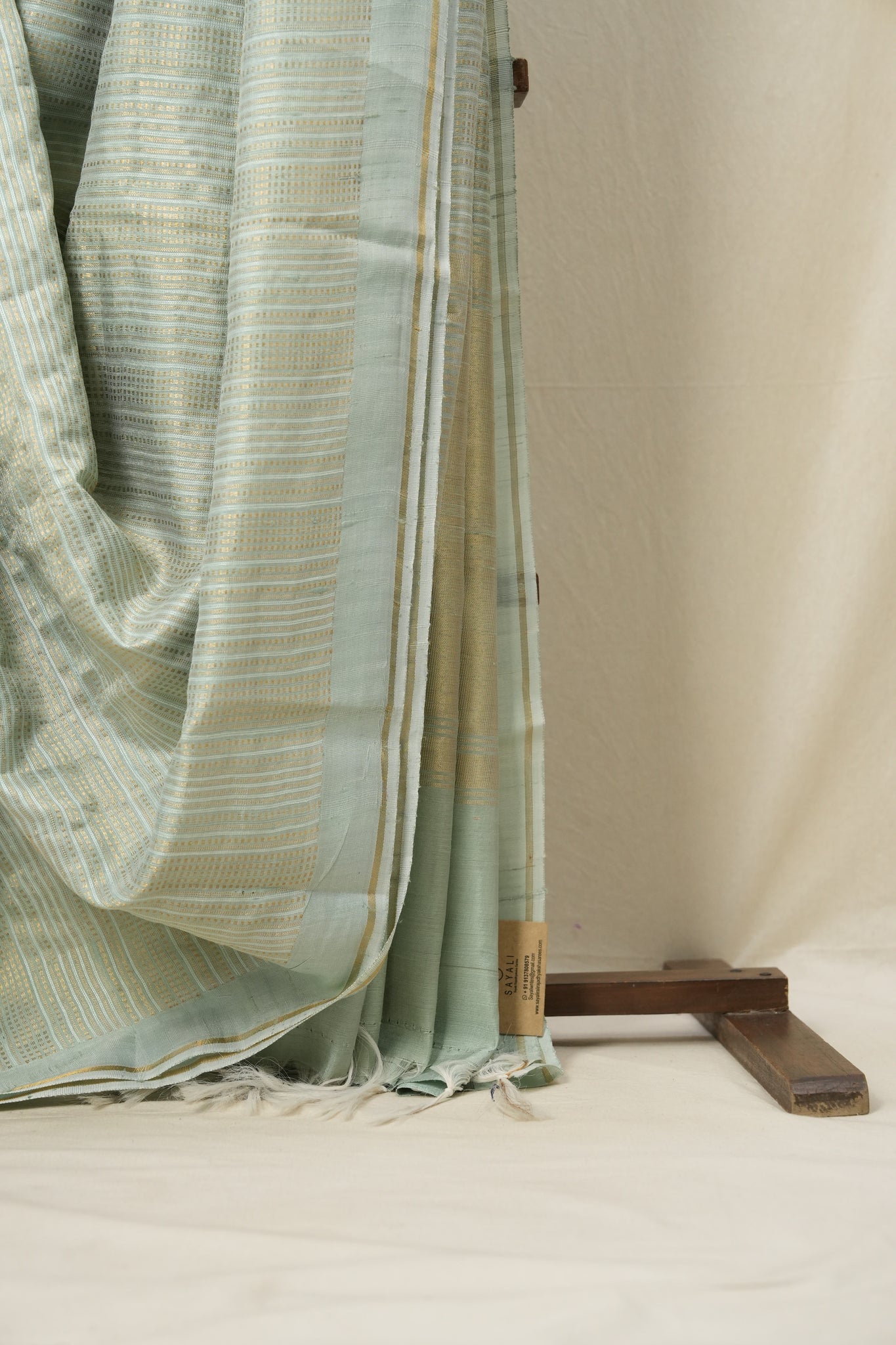 Work - This raw silk saree features a aqua blue base with fine woven stripes and a solid gold border, showcasing a rich and elegant look.