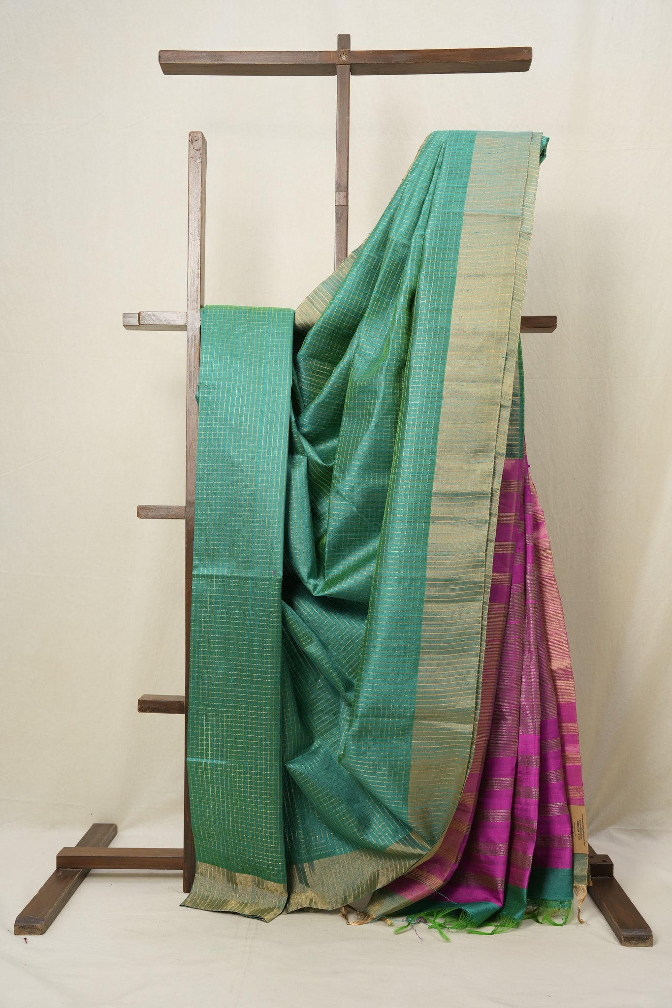 Work - Aqua green raw silk saree with golden checks, contrasted by zari border and rich golden pallu.