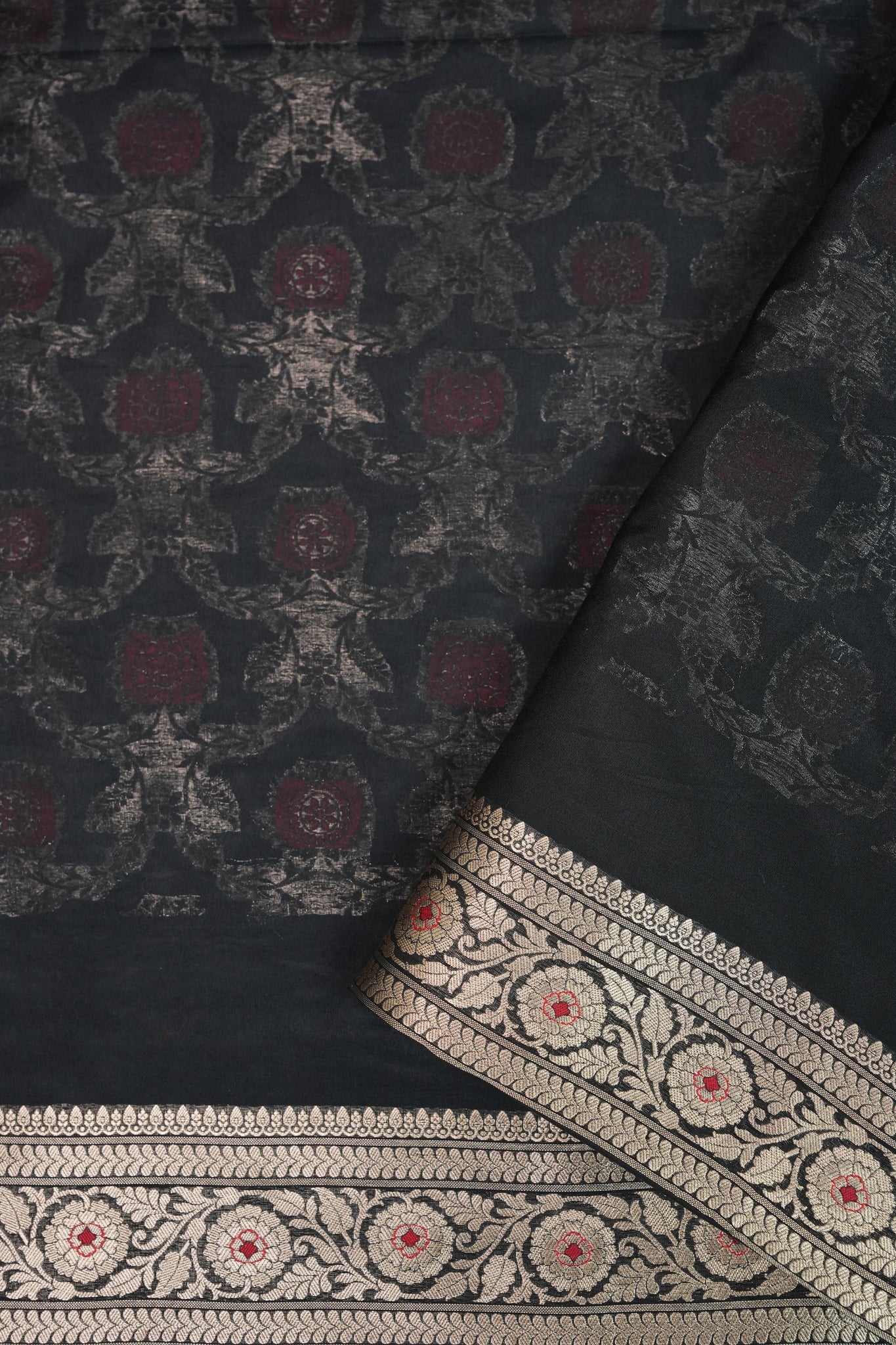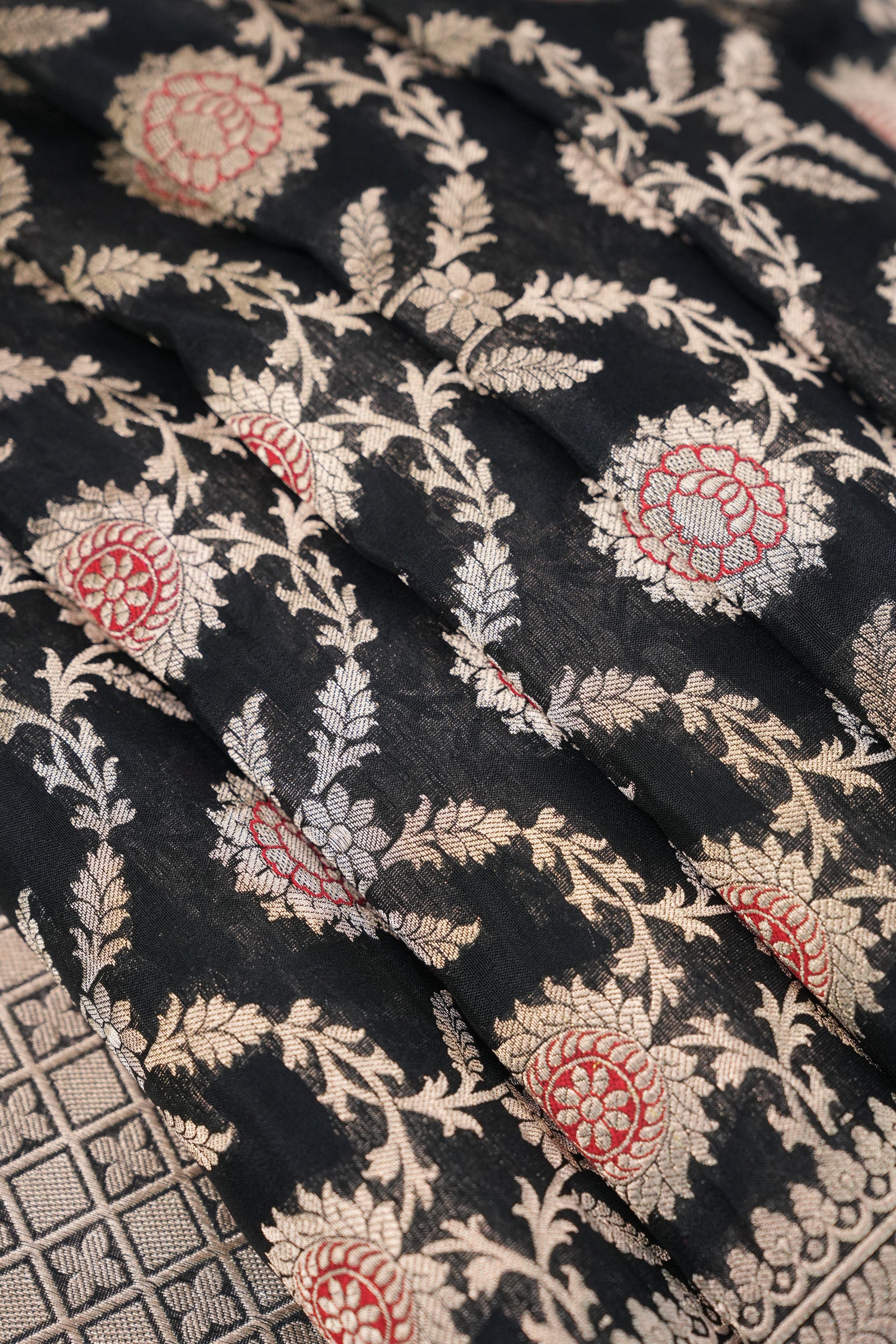 Saree Color – Deep black with silver zari and red resham floral motifs