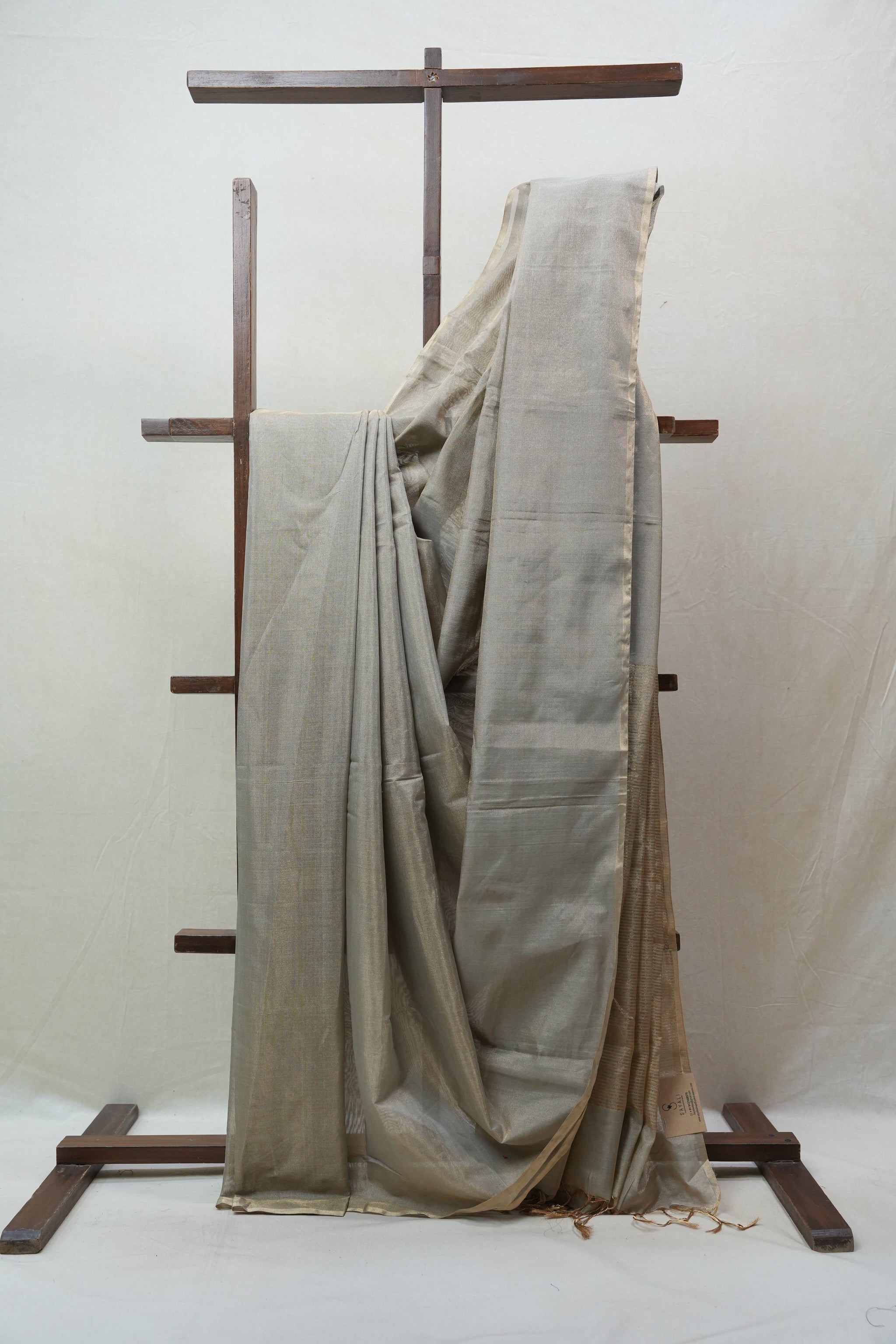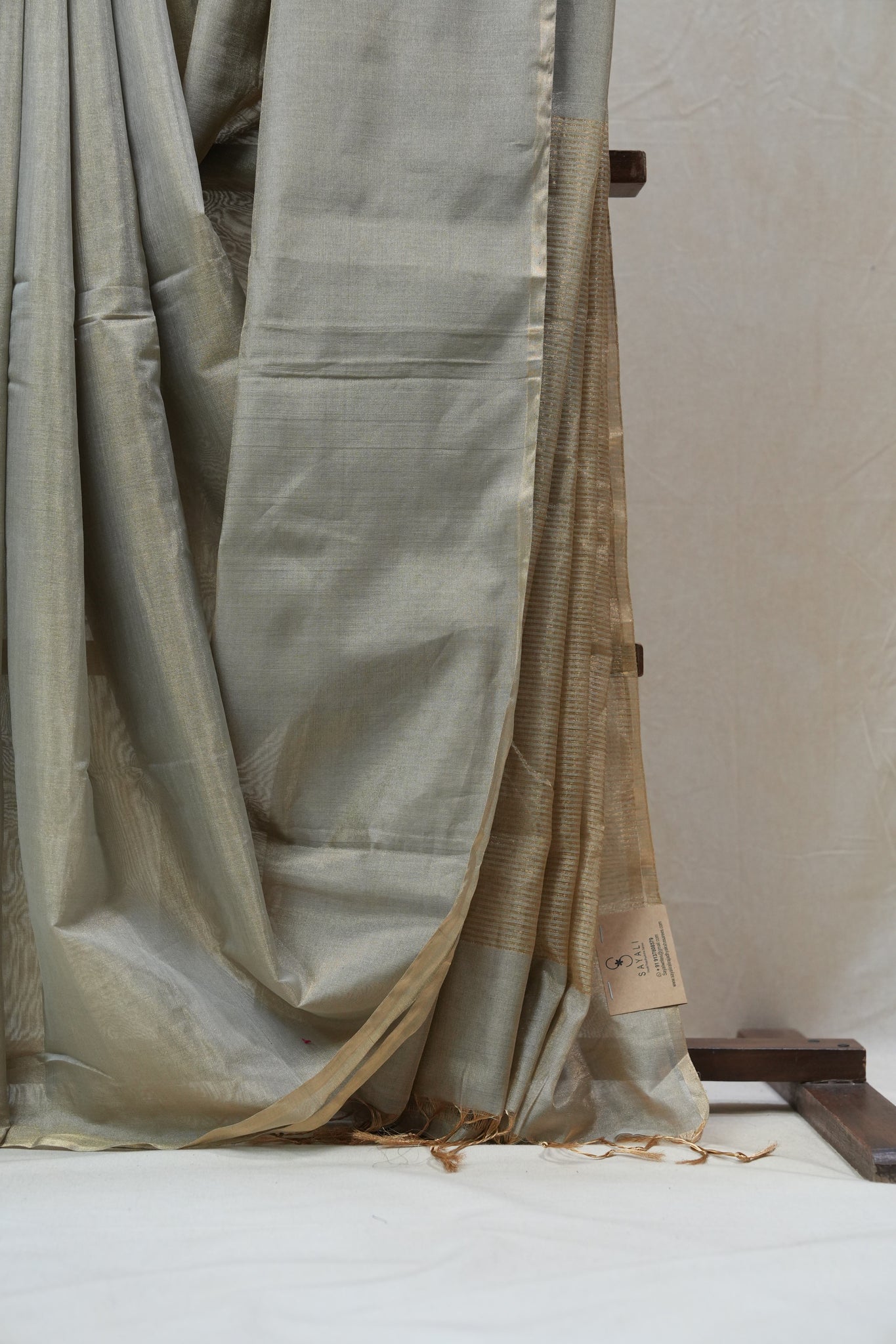 Work - This Maheshwari tissue saree features a subtle golden sheen with contrast zari woven border and pallu.