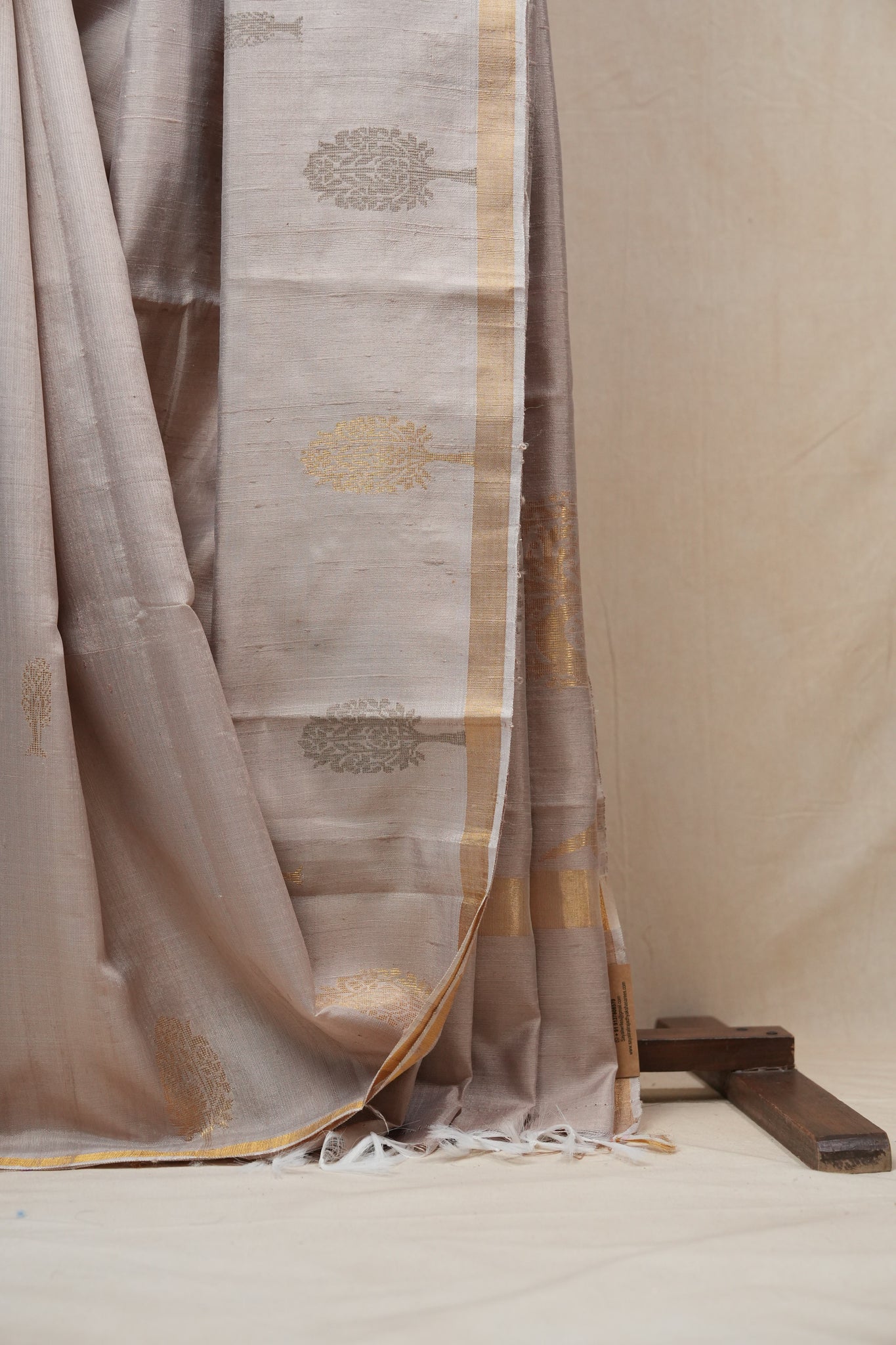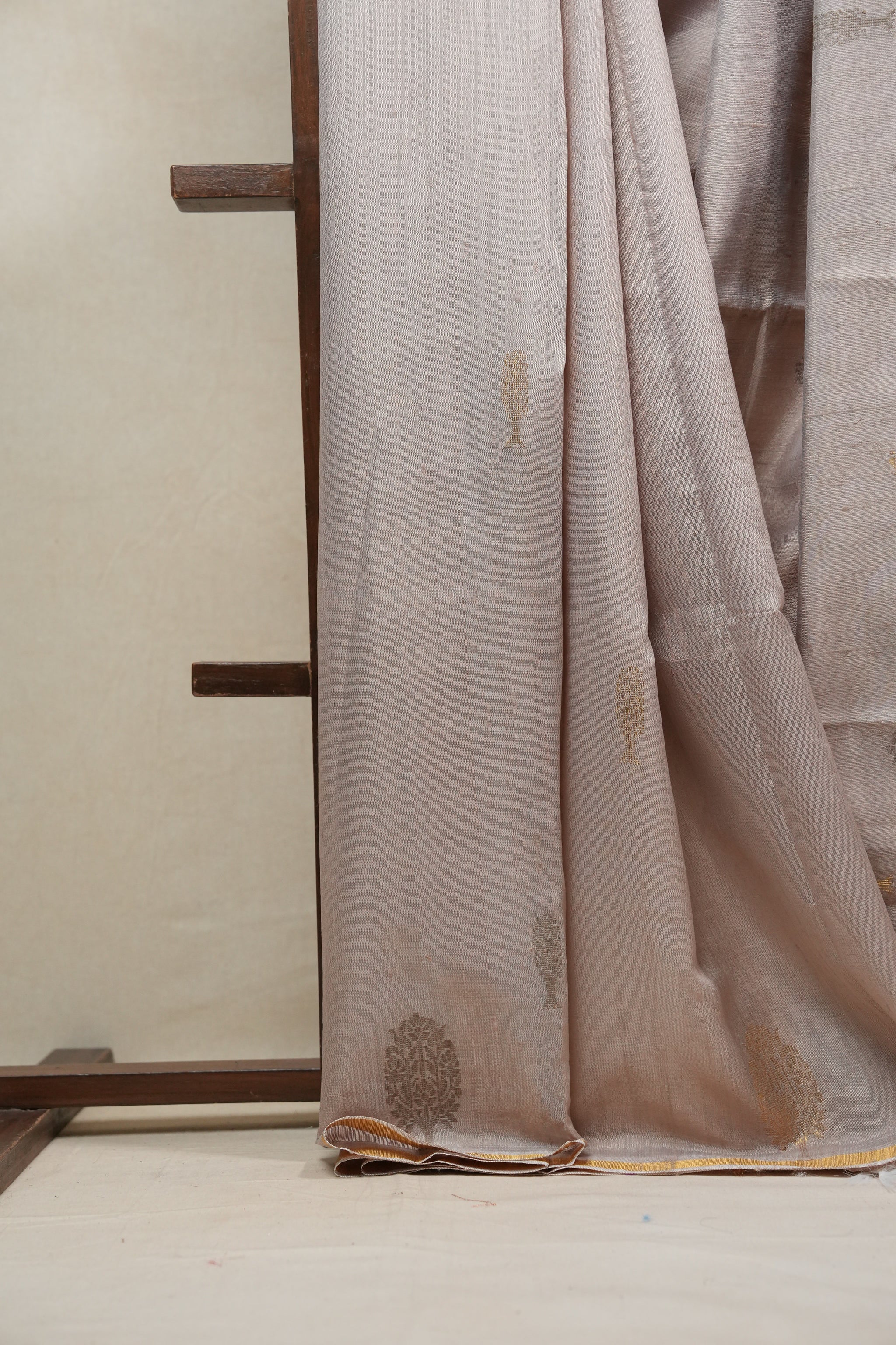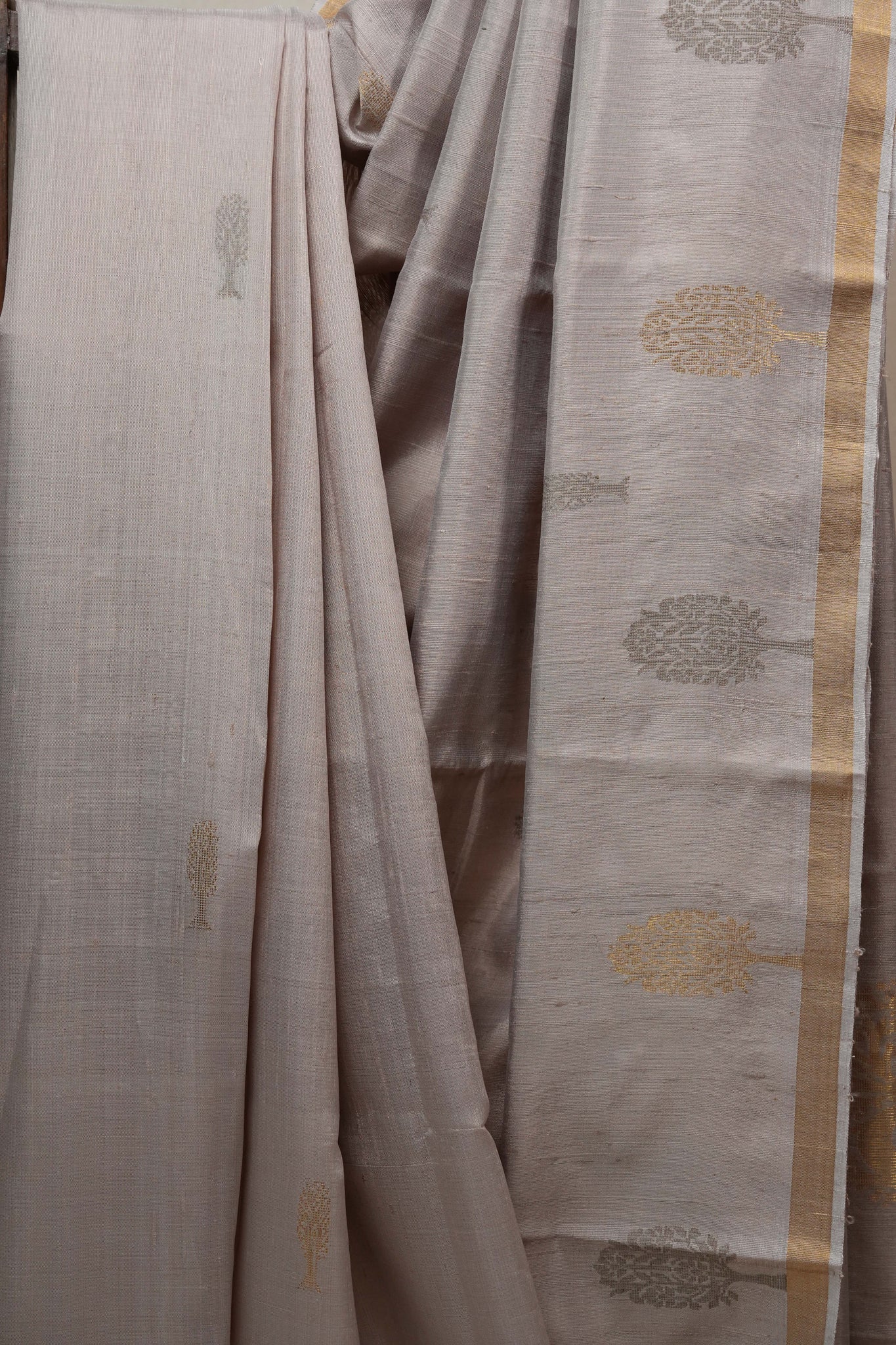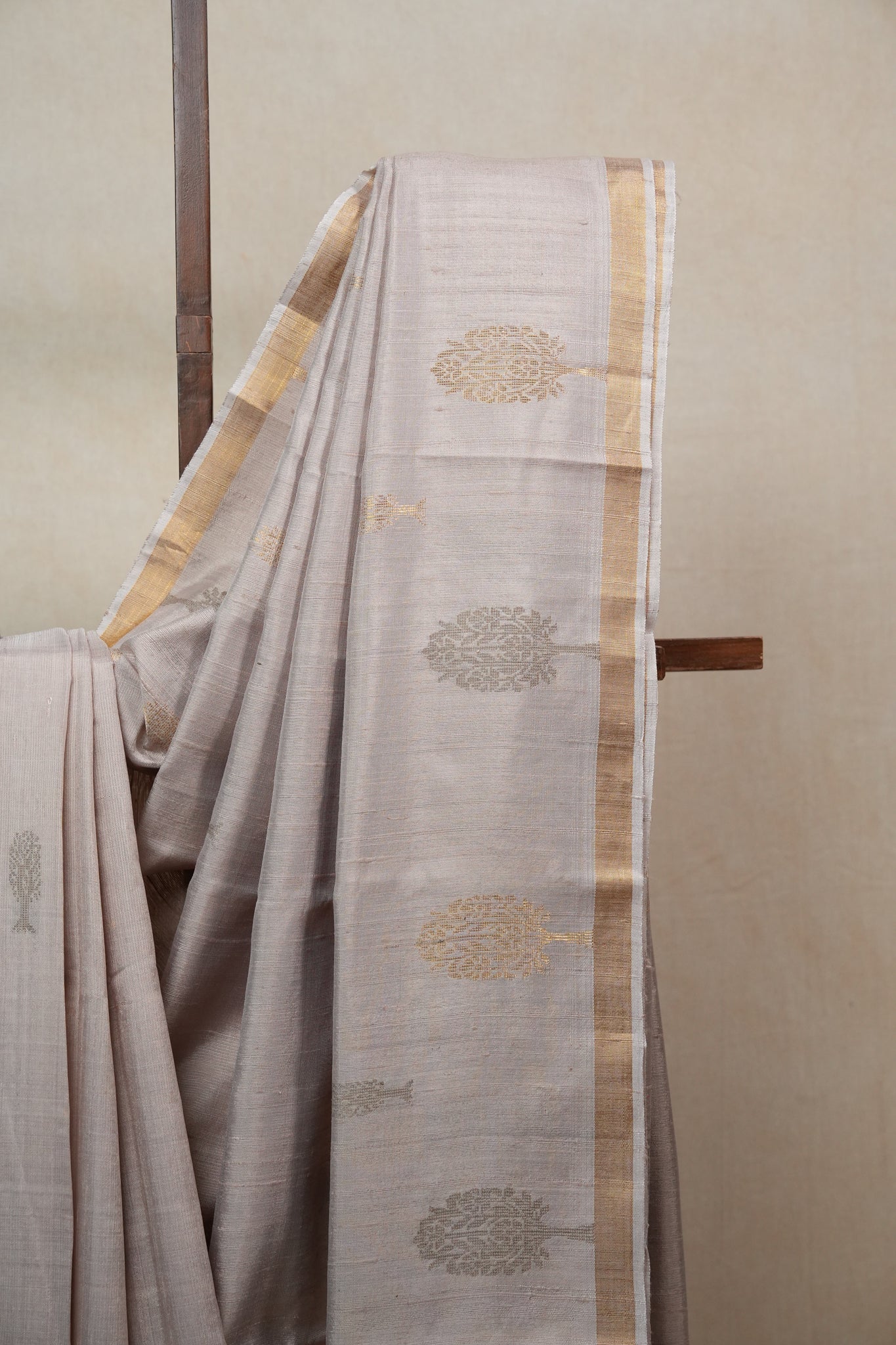 Work - This beige saree is adorned with grey-golden buta motifs and a subtle golden zari border for an elegant touch.