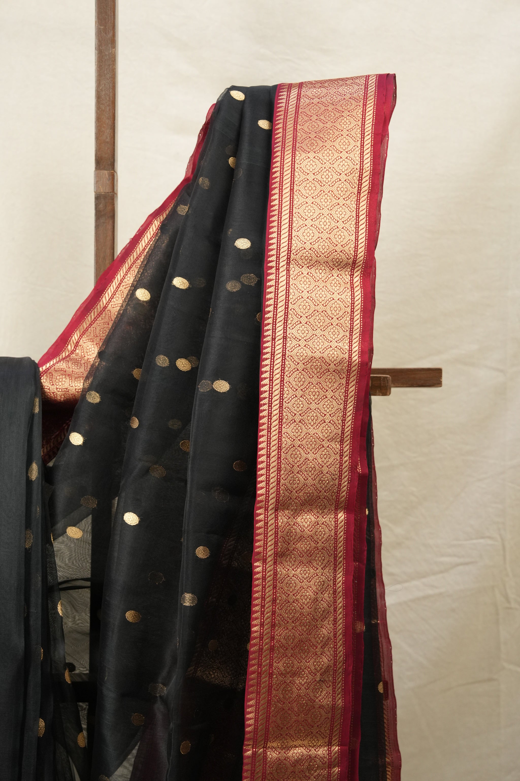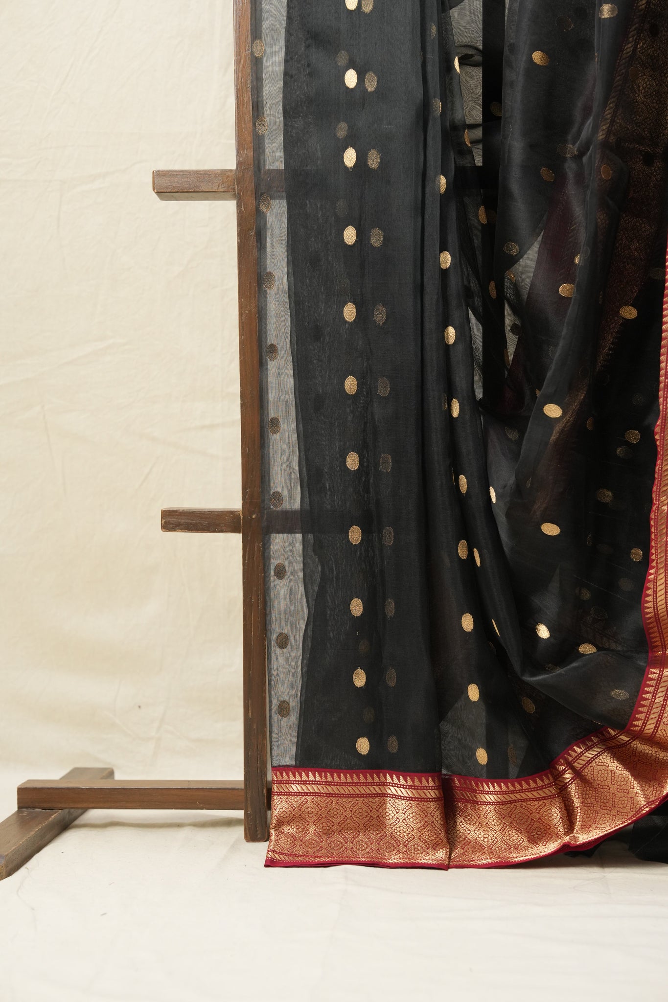 Work - Chanderi silk saree with black body, gold buti motifs, and elegant gold zari border.