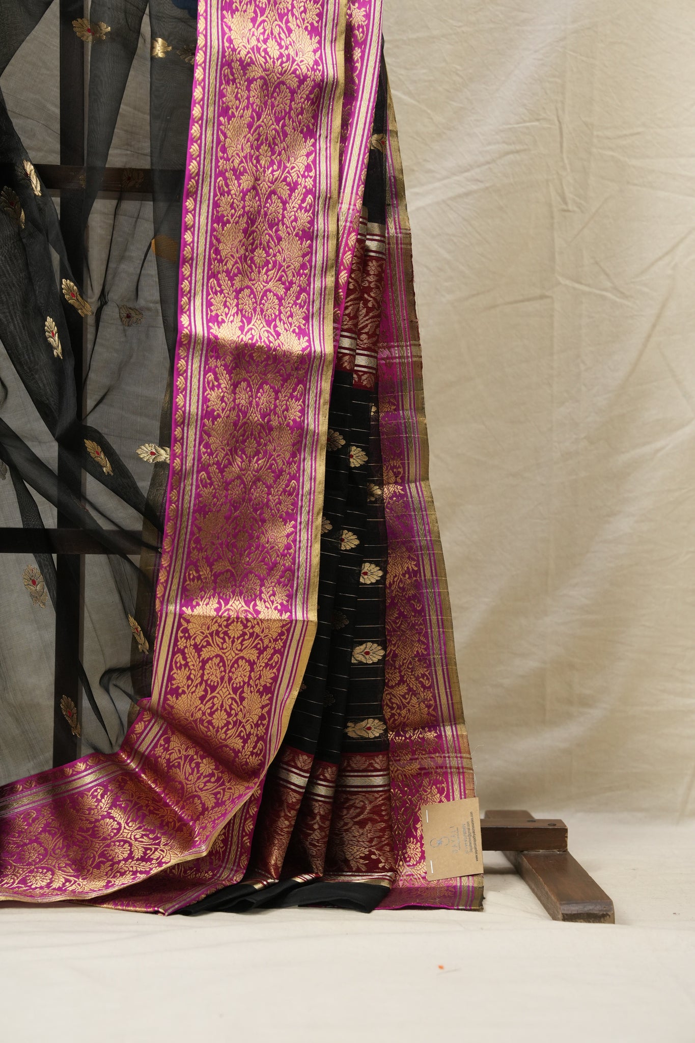 Work - Chanderi silk saree with black body, gold buti motifs, and contrast elegant gold zari border.