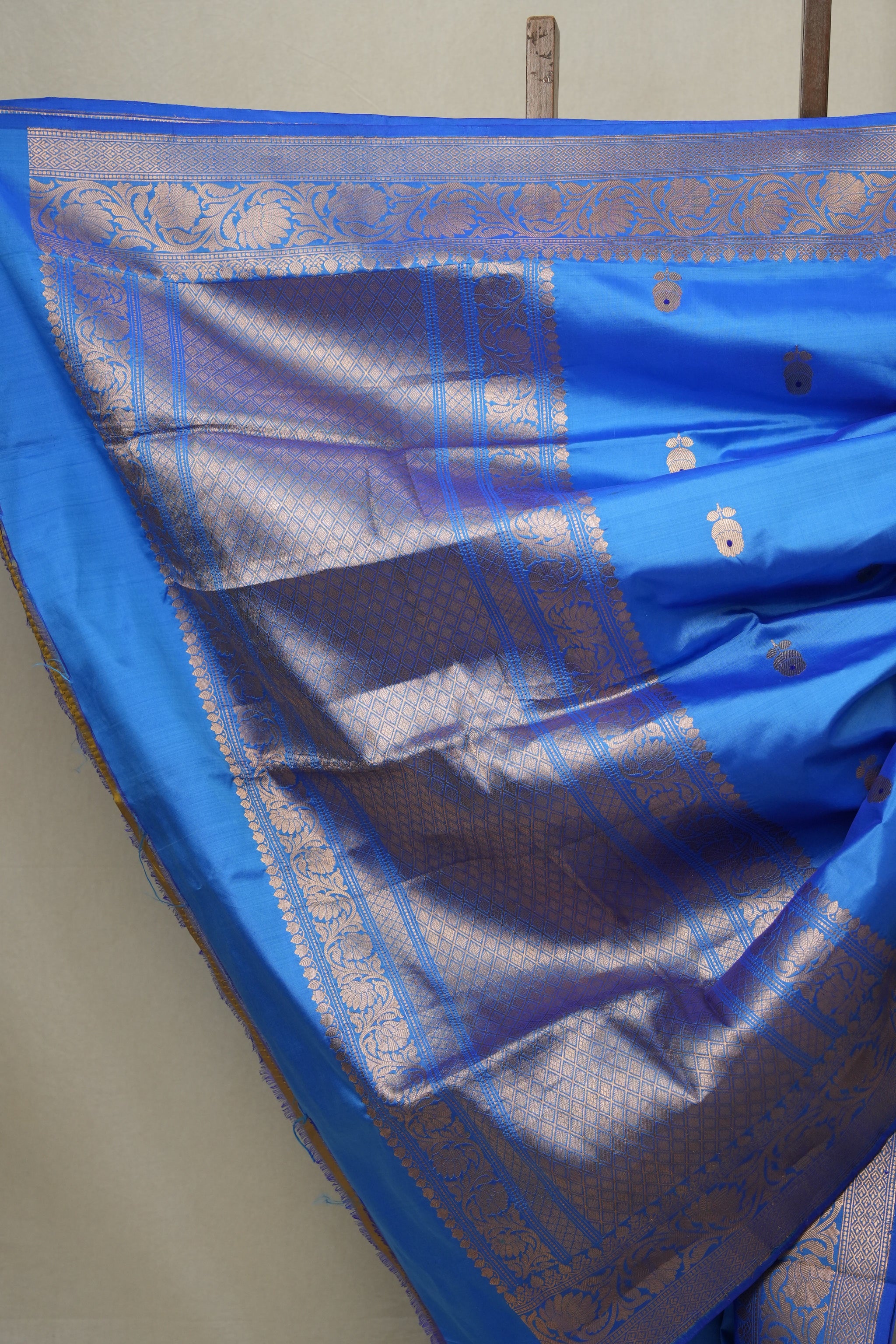 Work - Intricate gold zari weaving with floral and paisley motifs across the body and a rich, detailed border and pallu.