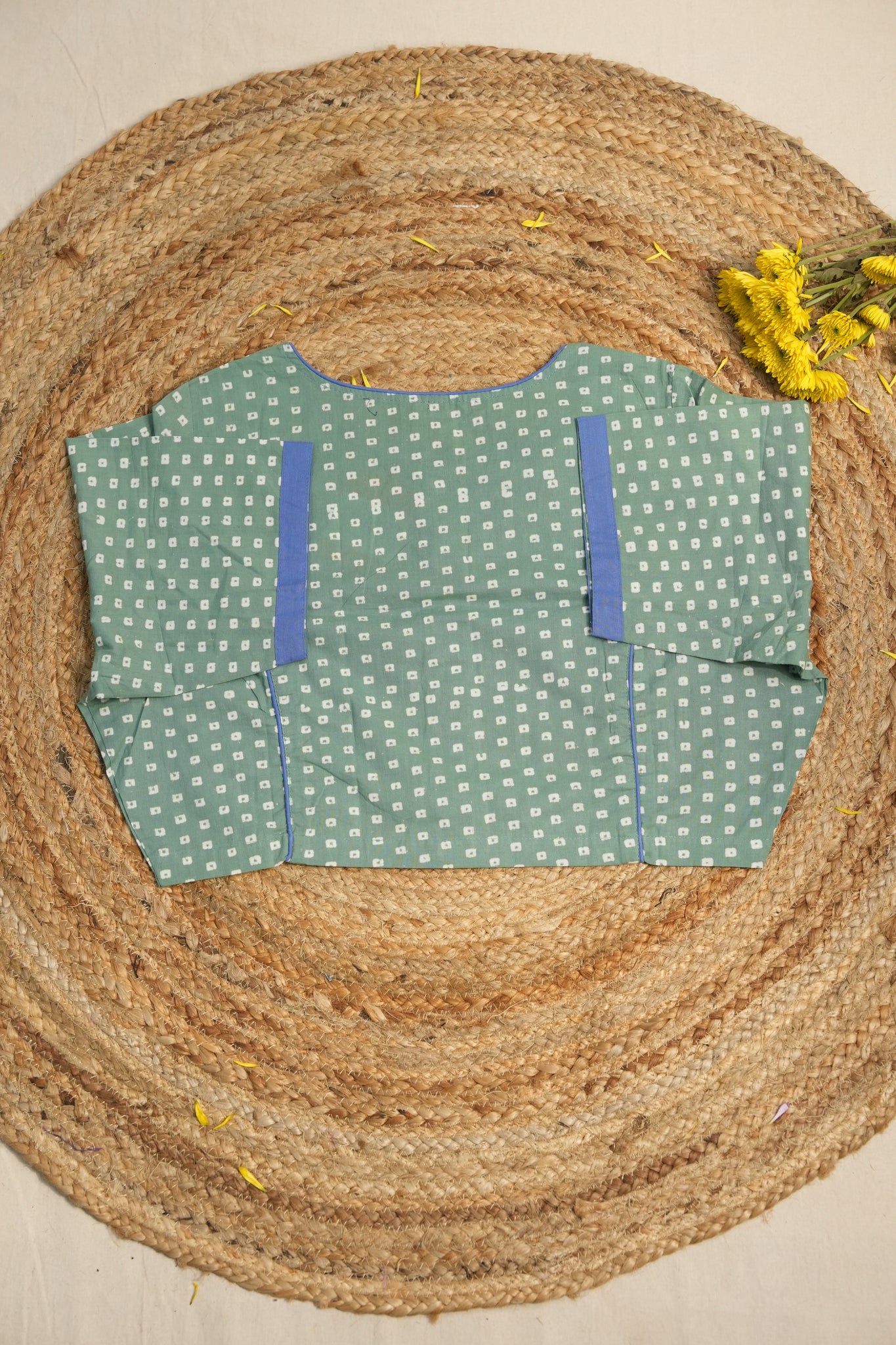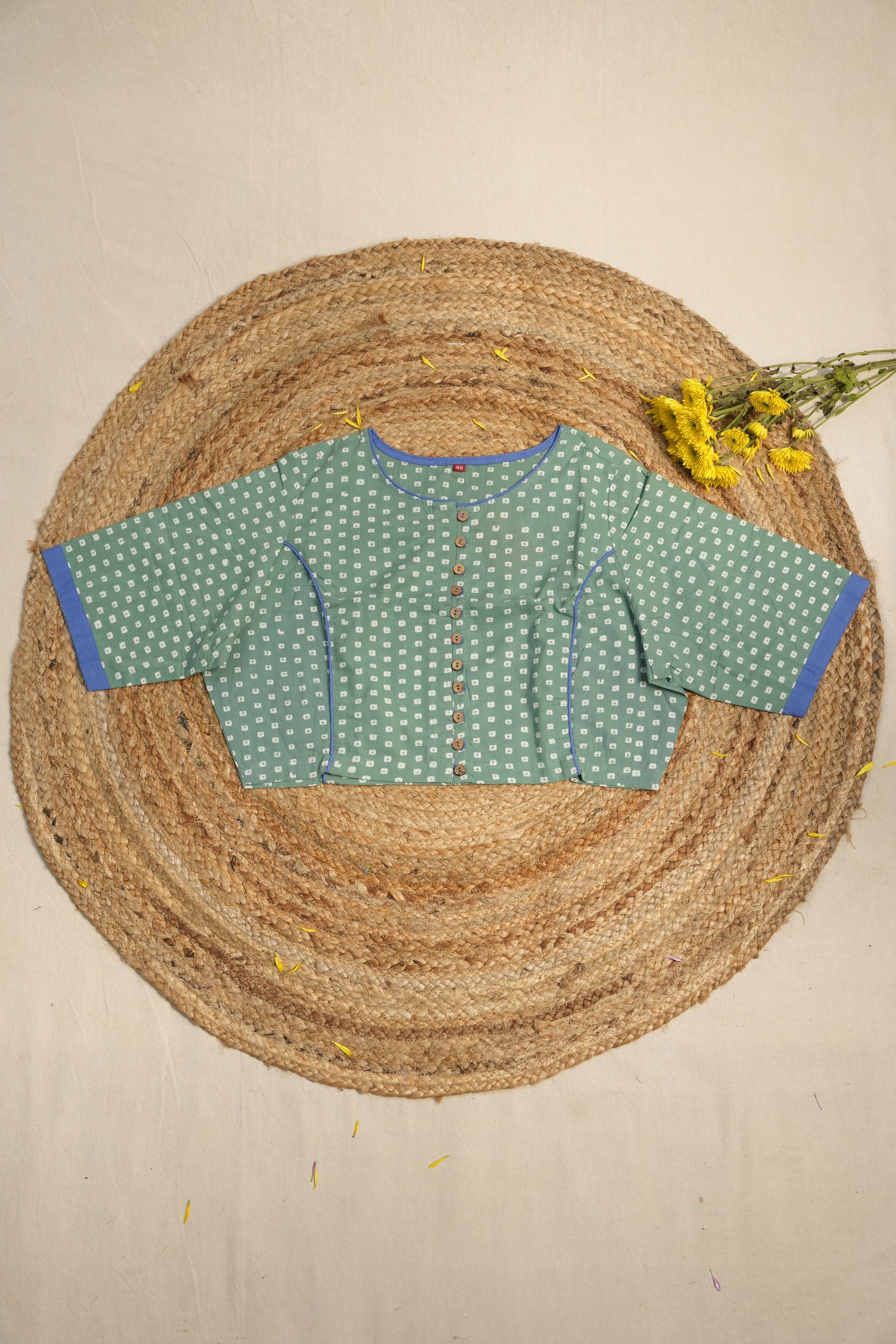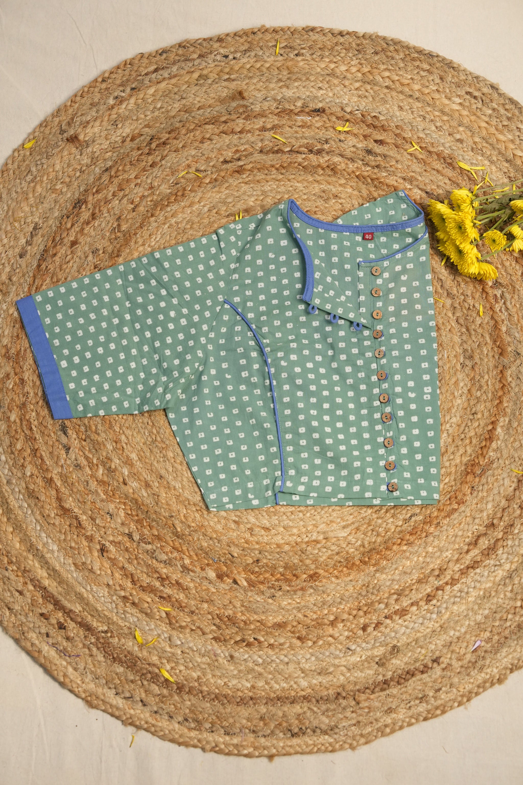 Handblock printed parrot green cotton blouse with boat neck, front open with buttons, without pads and without lining.