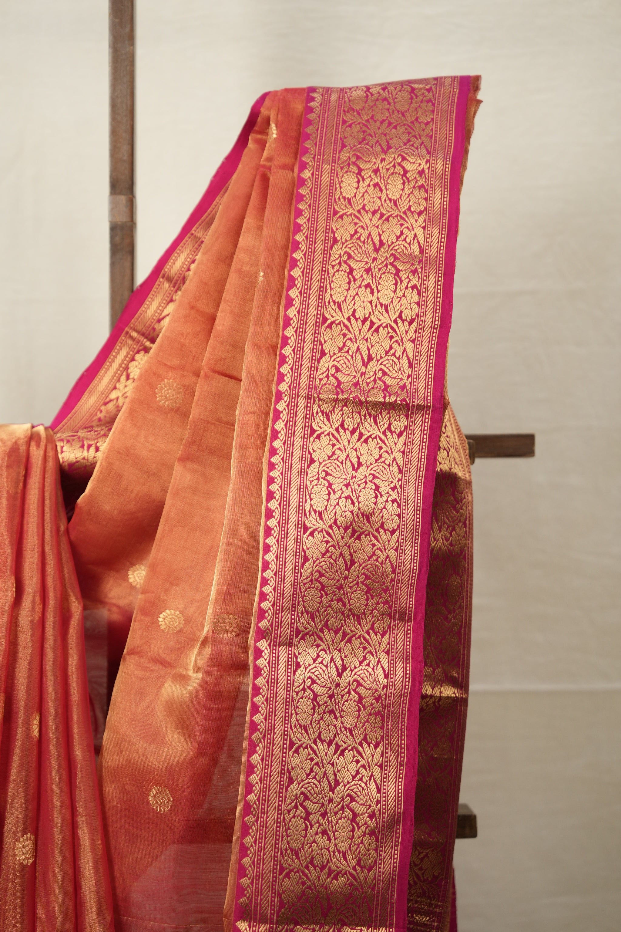 Work - Chanderi tissue silk saree with red body, gold buti motifs, and elegant floral zari border.