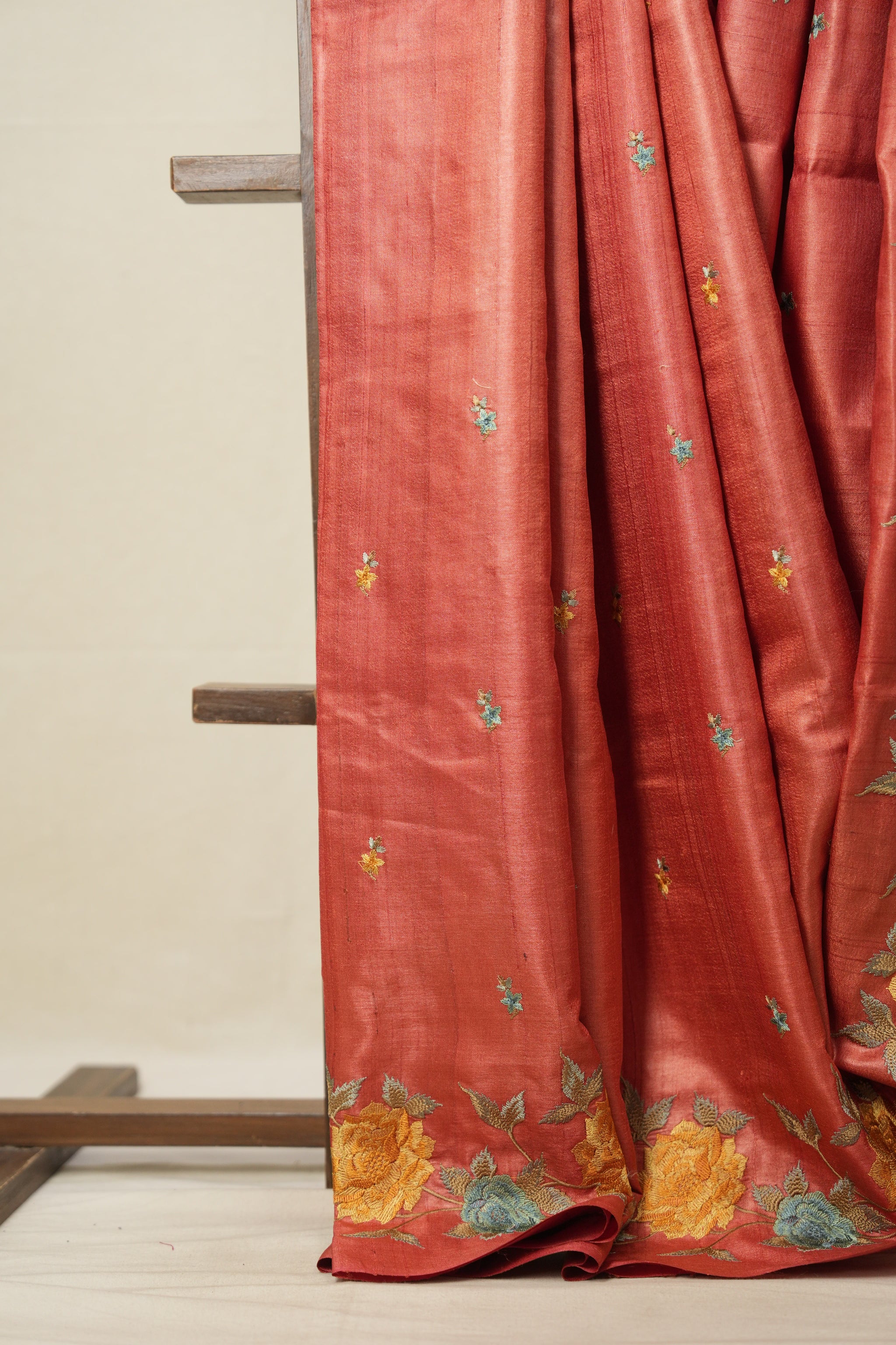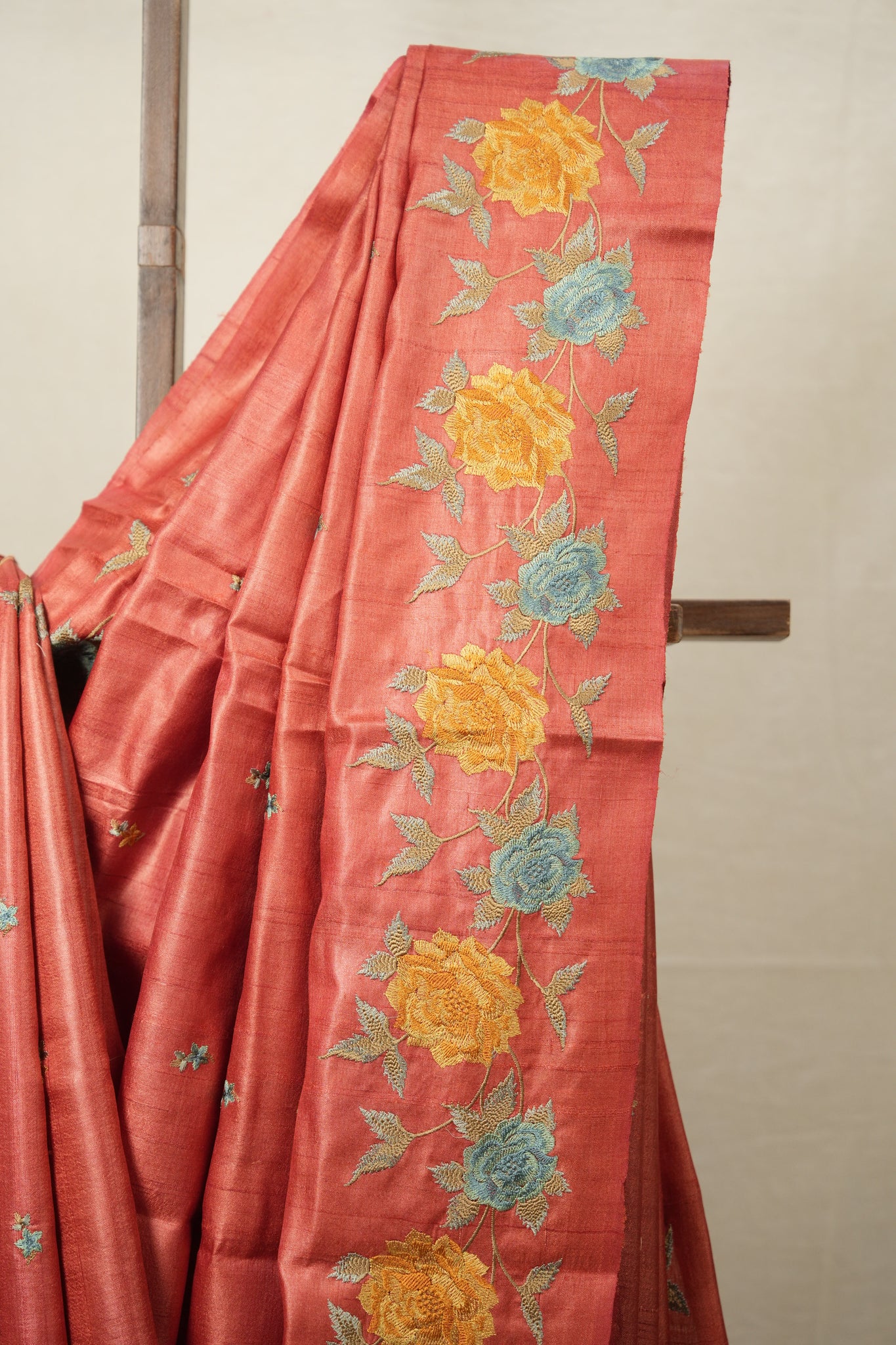 Work - This is a tussar silk saree with elegant multi-color floral embroidery work