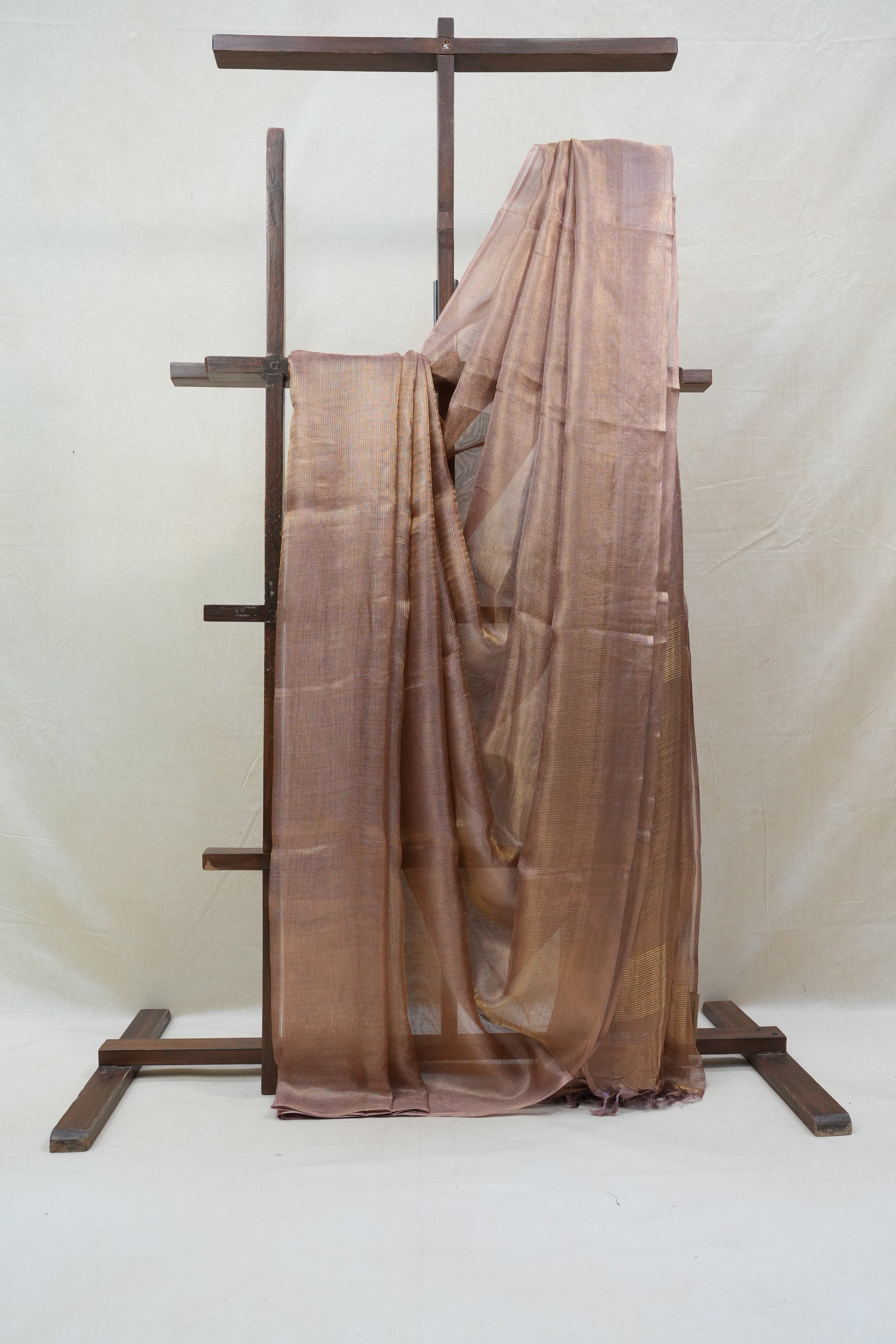 Work - This Tissue Tussar Silk saree appears to have a plain body with no prominent woven designs or embellishments visible, relying on the natural shimmer of the tissue silk.
