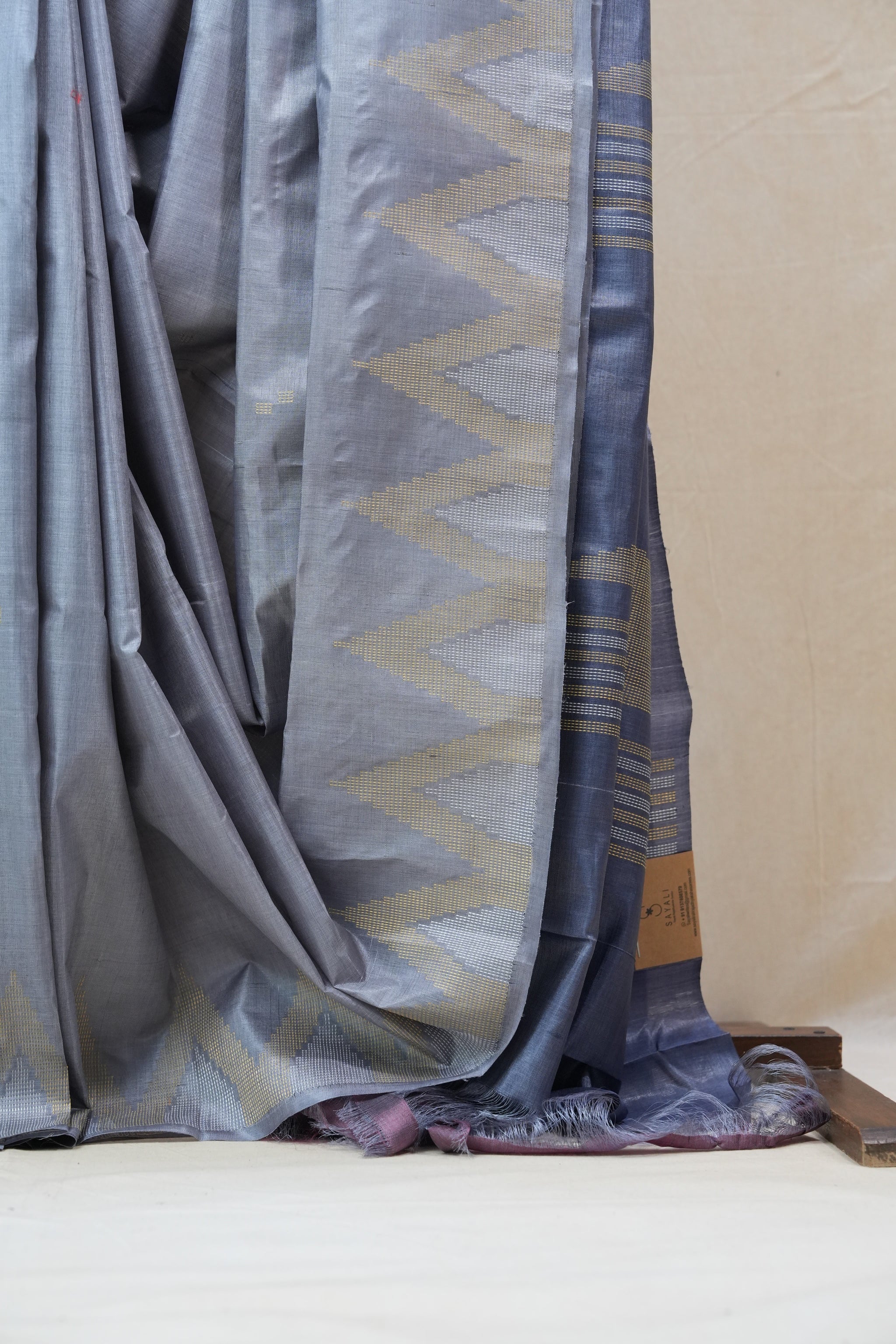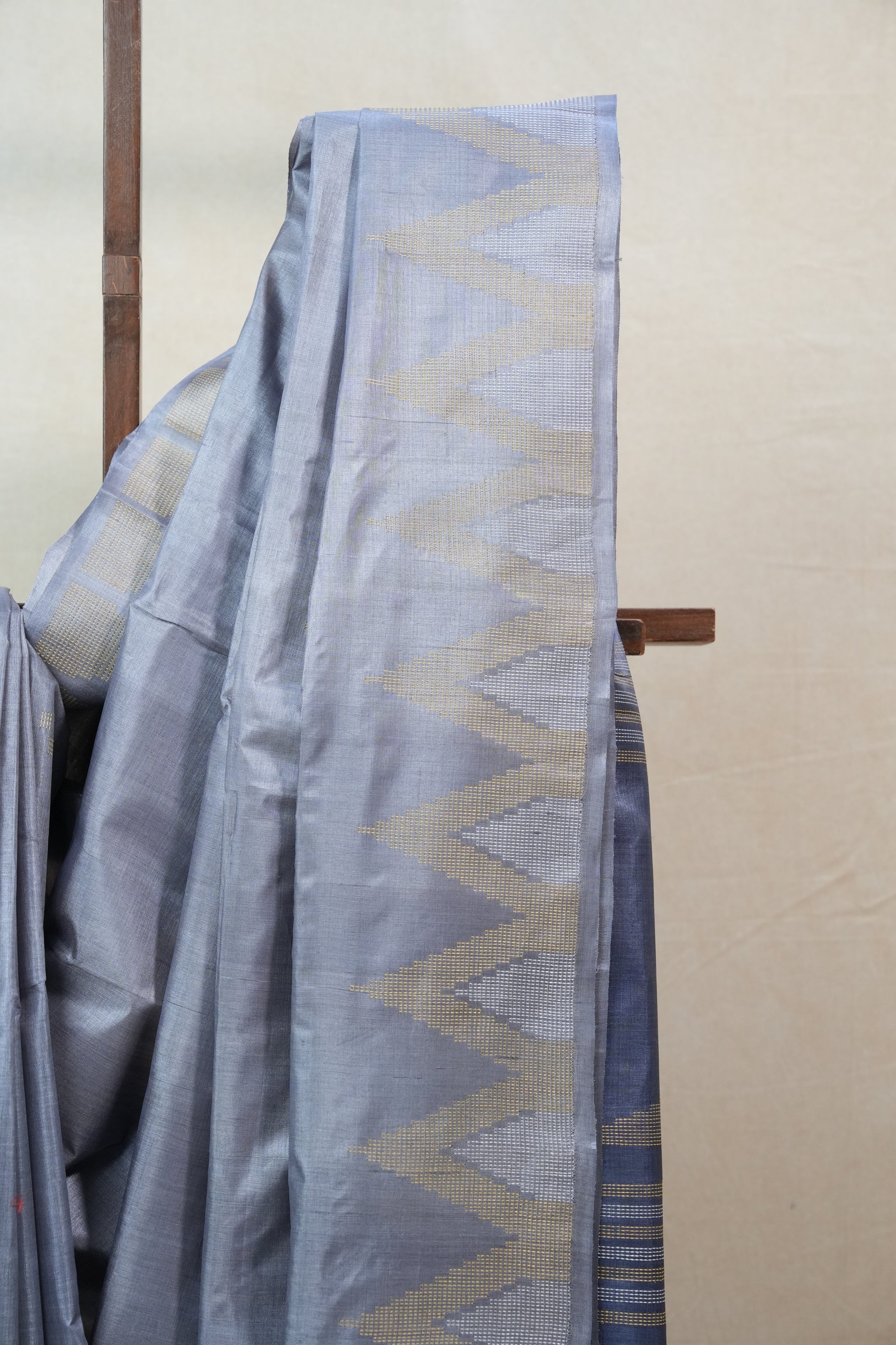 Work - This Tussar silk saree features a plain body with golden zari geometric zig-zag motifs along the border.